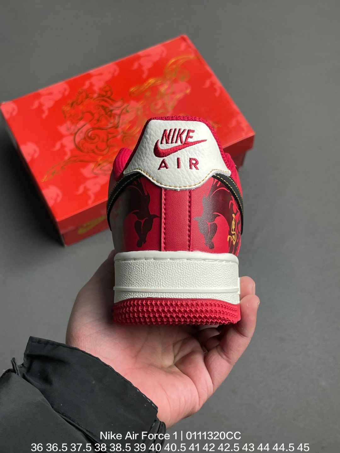 鞋面采用翻毛麂皮与光滑皮革拼接 通过印花工艺呈现国风文字与纹样 红色Swoosh搭配金色描边 鞋身点缀金属质感的中式符号 定制工艺强化了鞋款的独特性