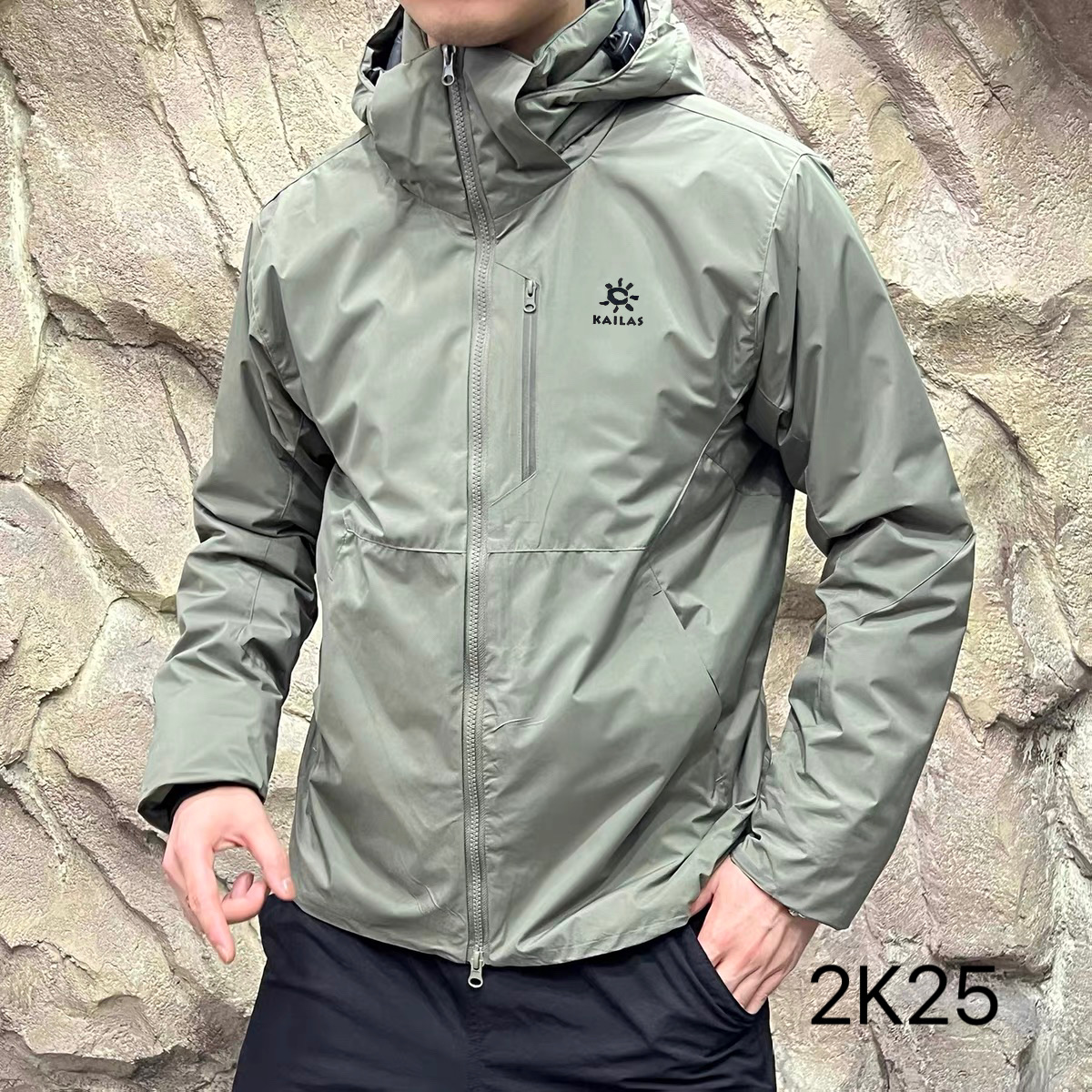 配合可包裹面罩 更好的遮风挡雨 两侧也有抽绳 也任意调节合适松紧度 胸前机能风的竖拉链压胶拉链口袋