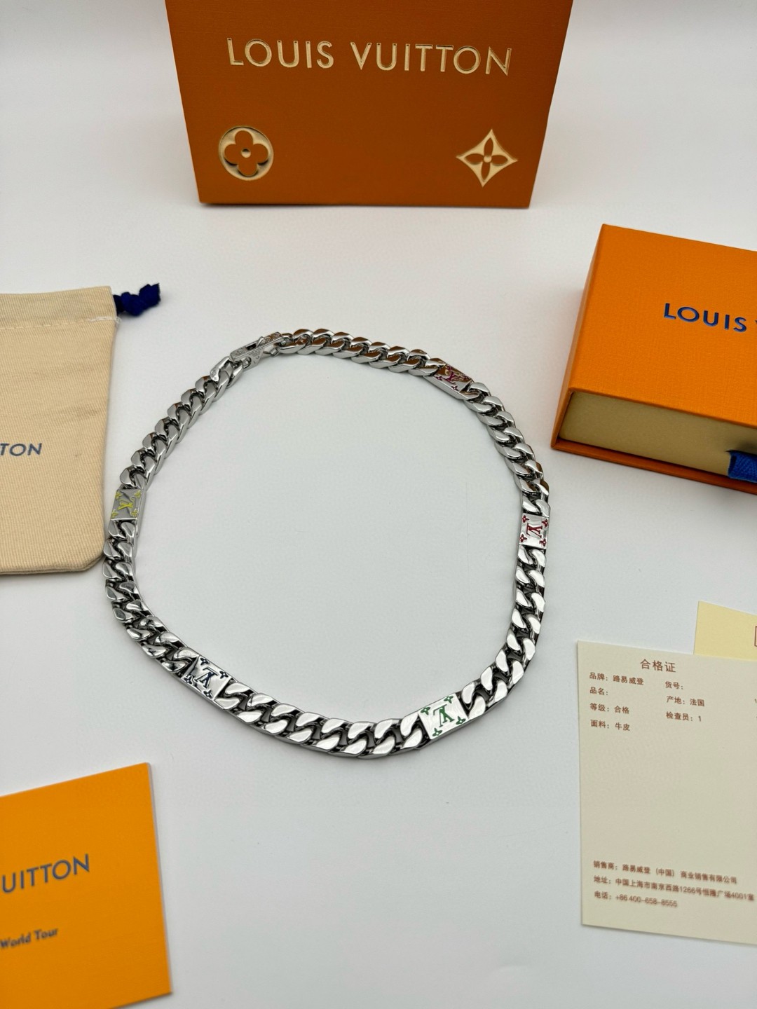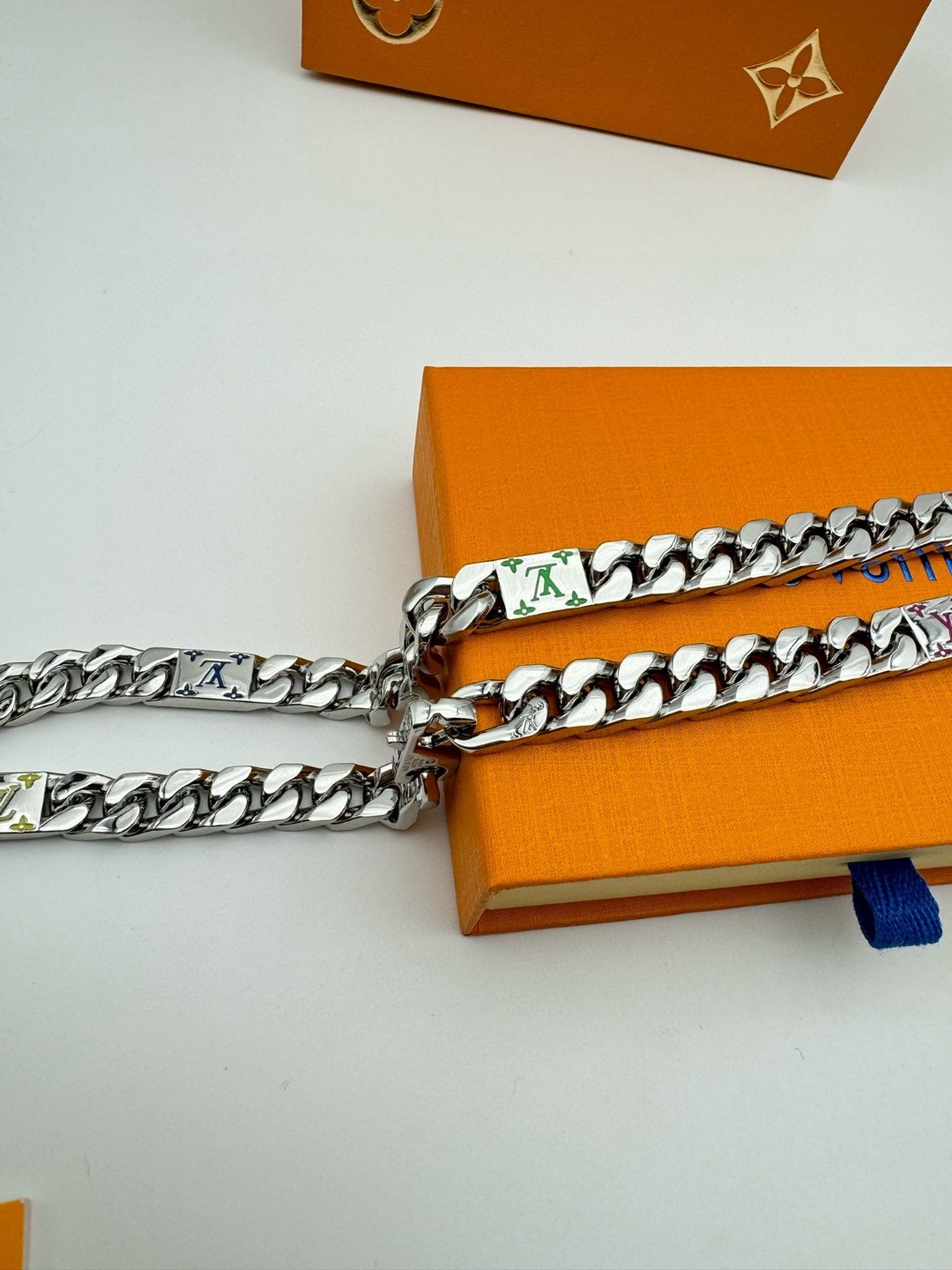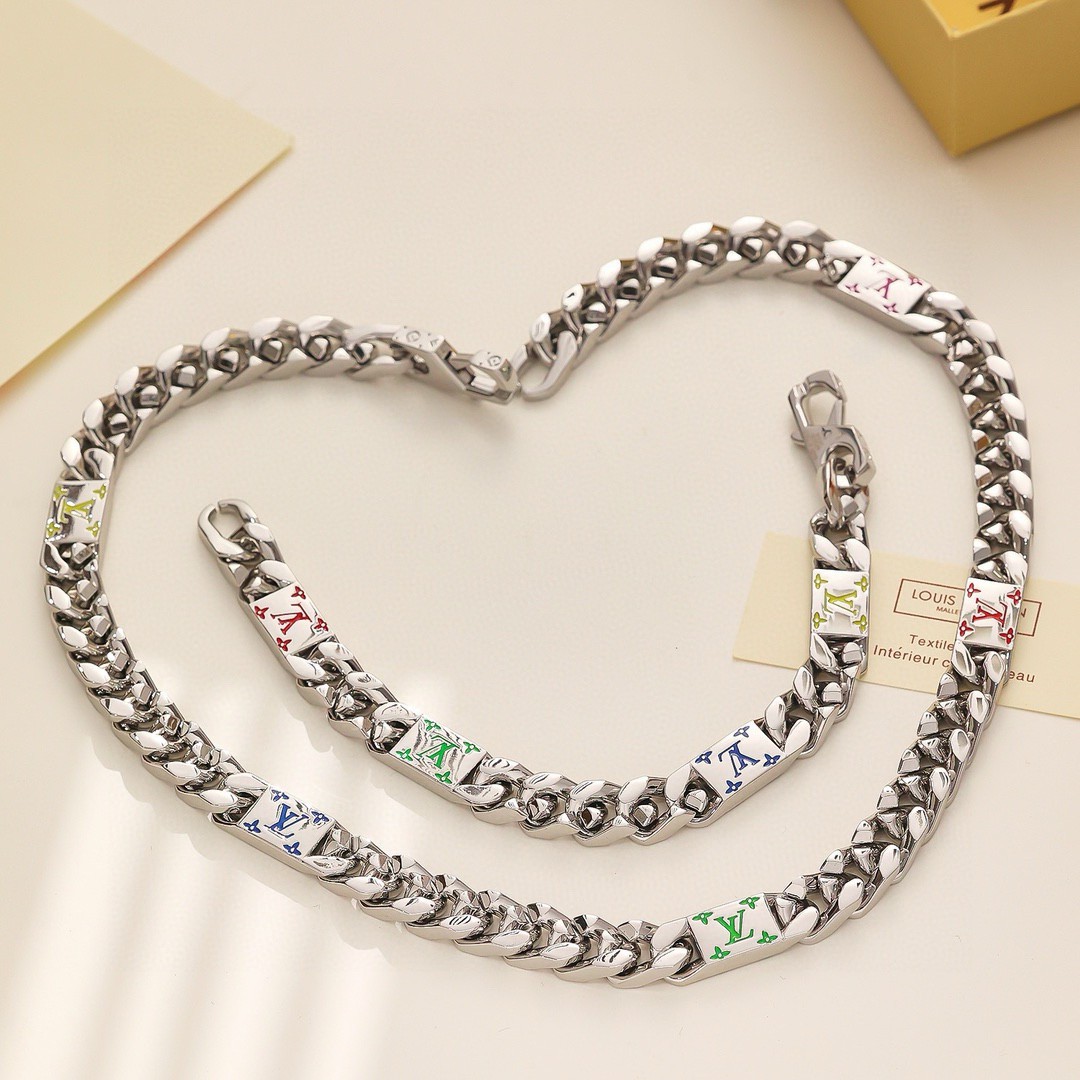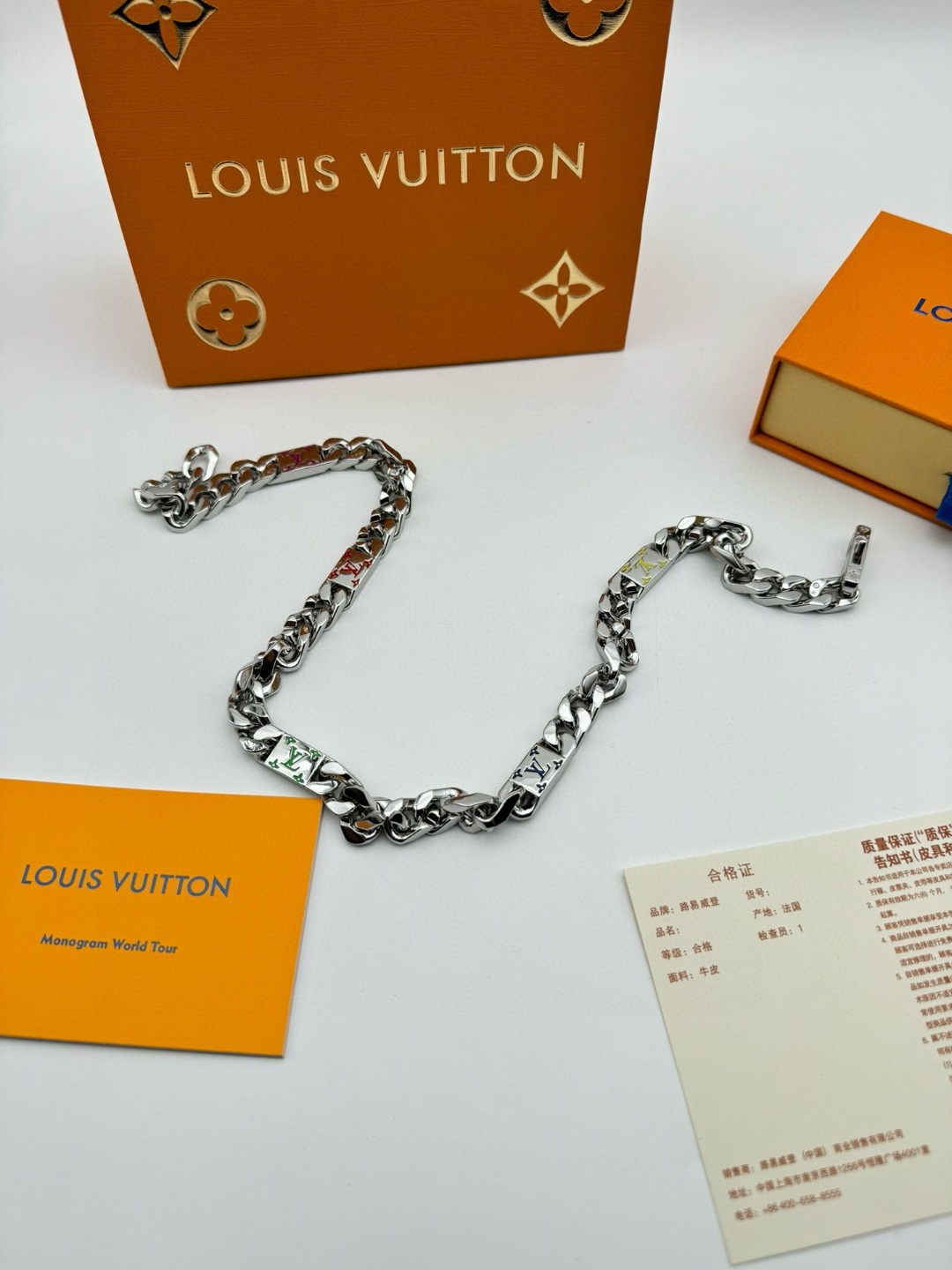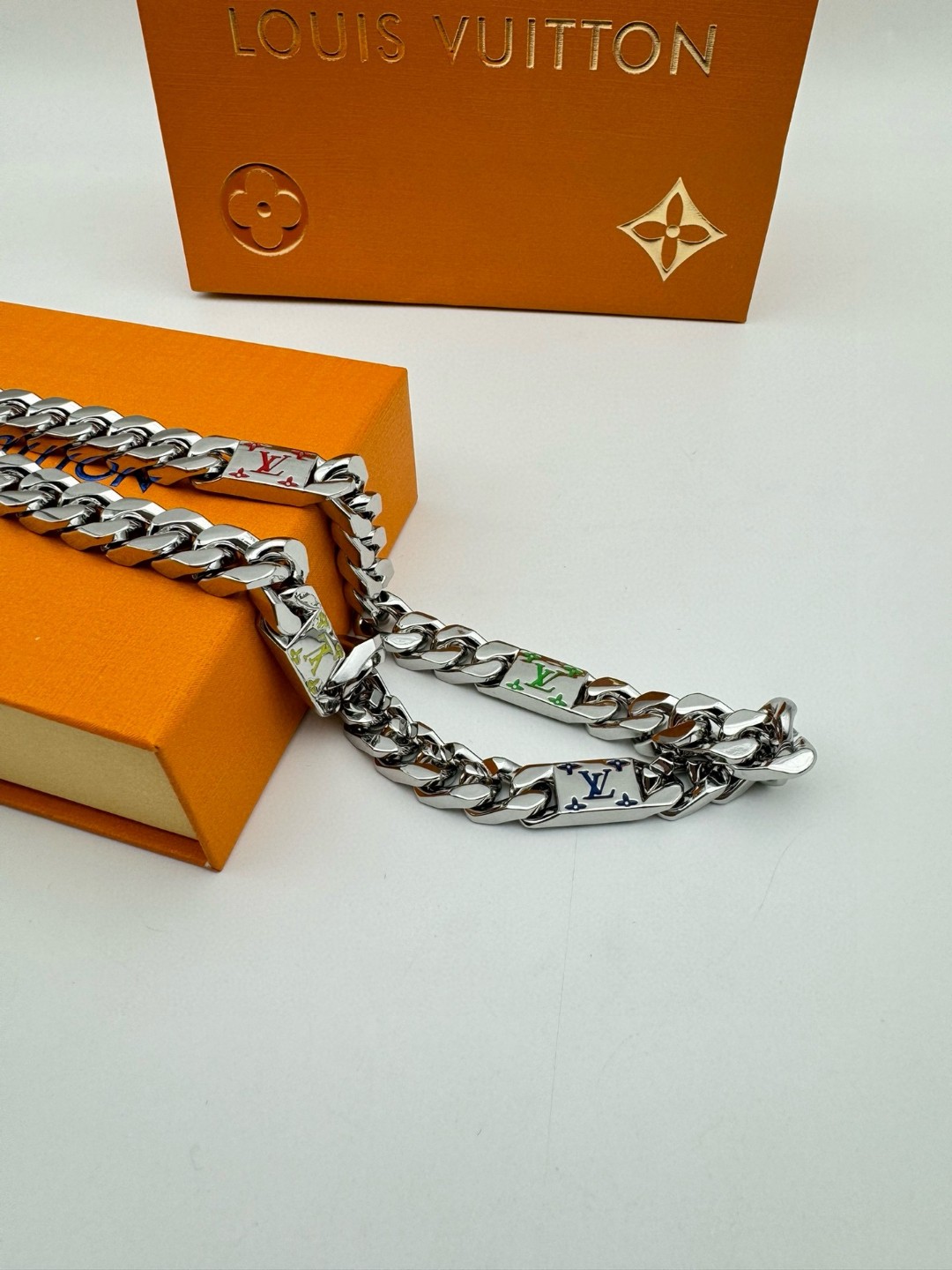 LV路易威登 彩色古巴项链 配全套包装 LV Mosaic 项链将 Tied Up 和 Cuban 链环彼此相扣 以缤纷珐琅 LV 字母和 Monogram 图案道出风雅意趣 可为男士衣橱注入潮流风尚 所属系列另有手链和戒指可选