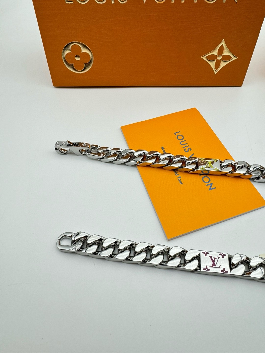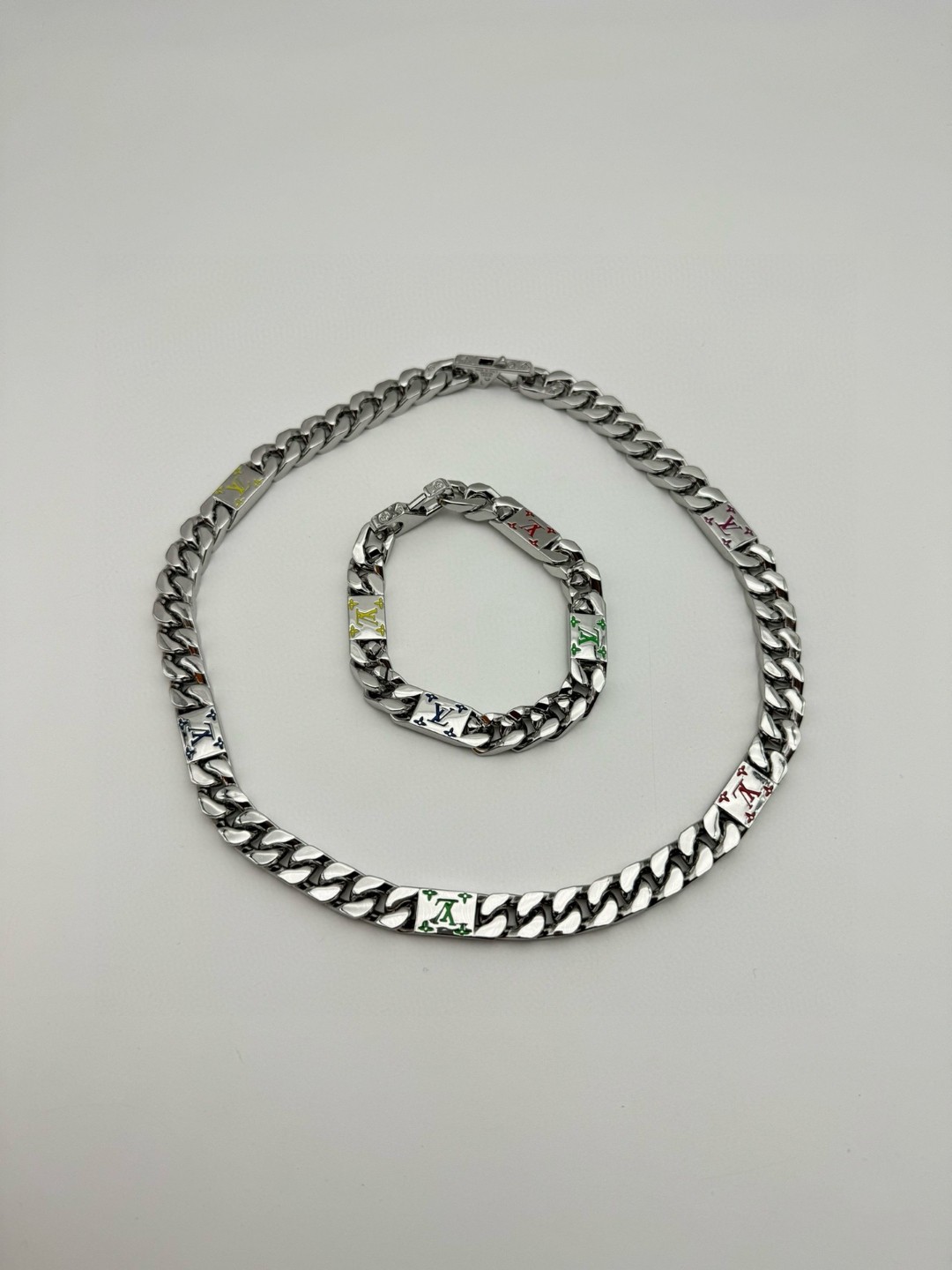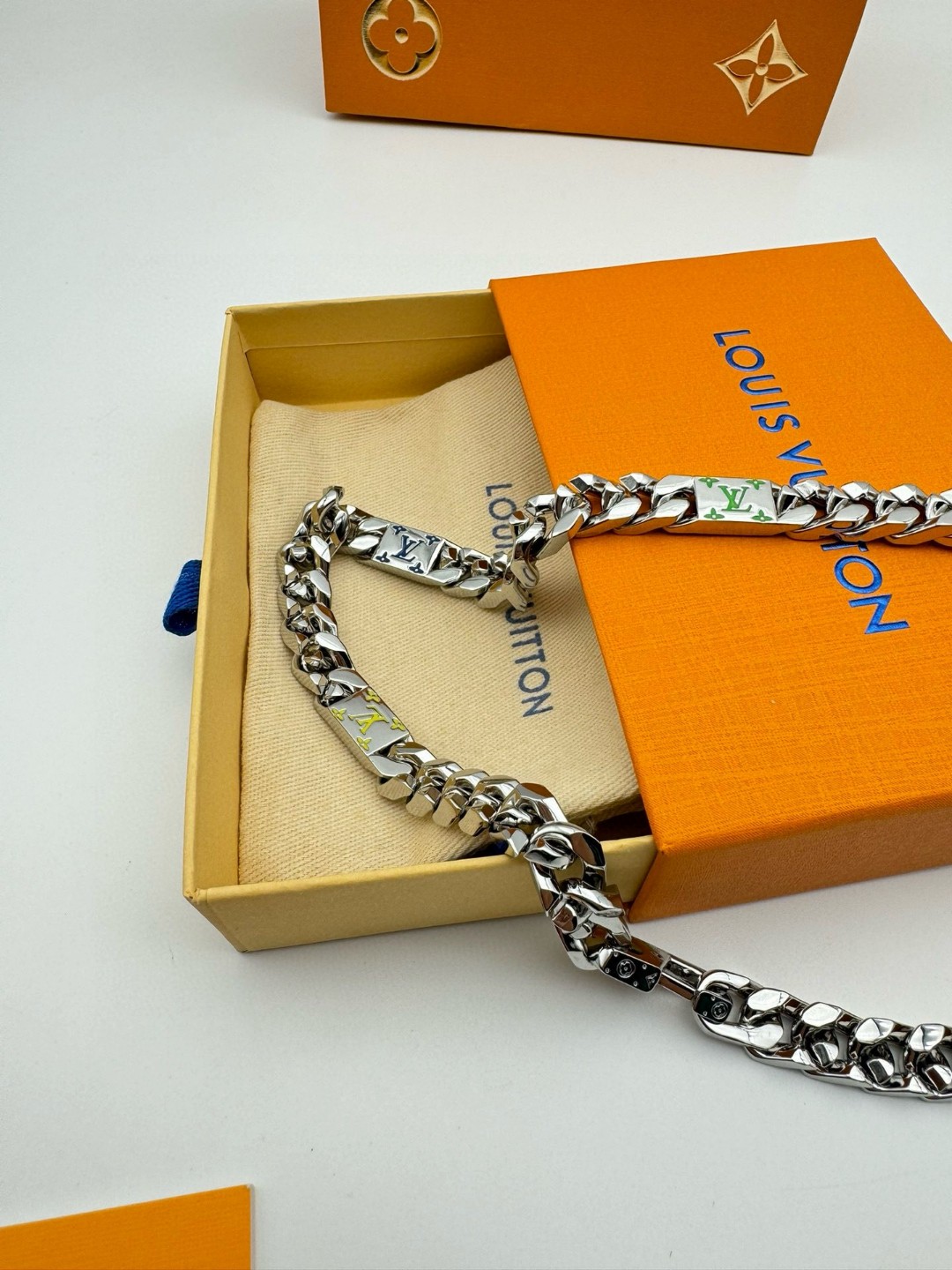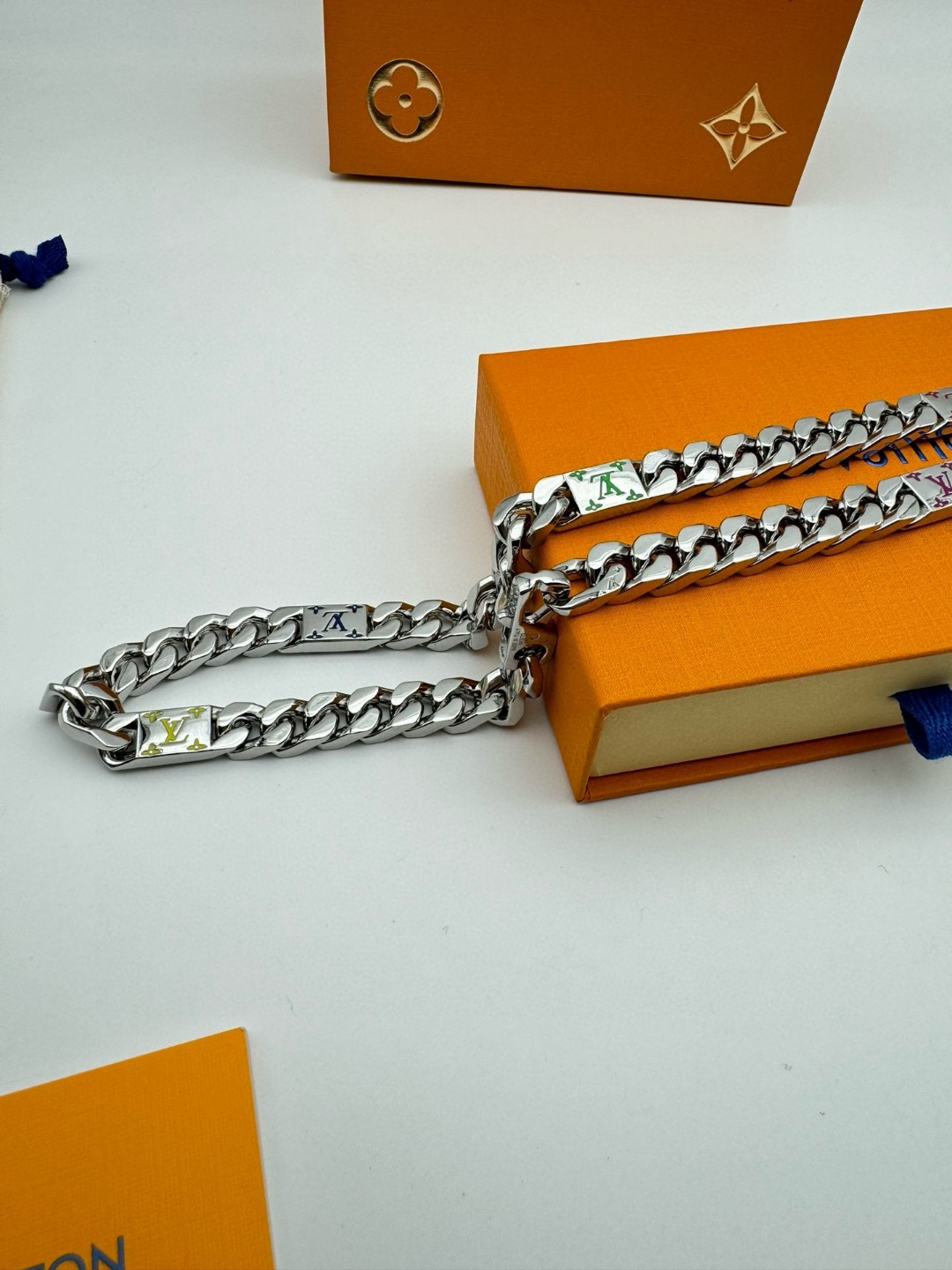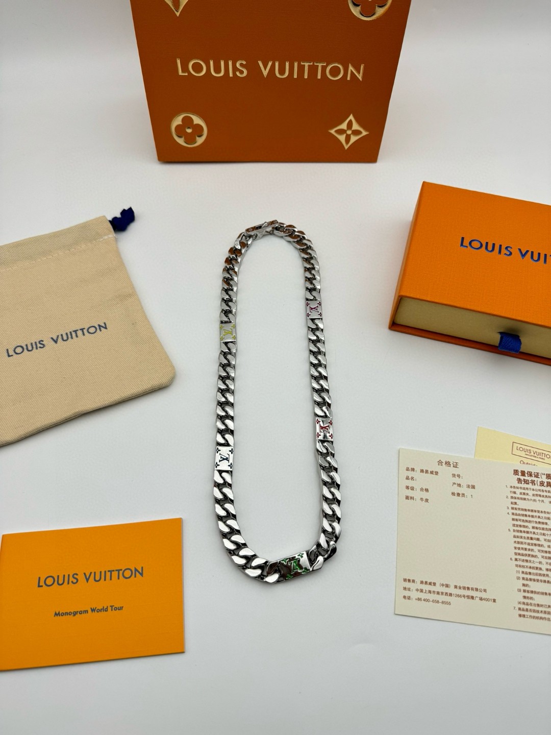 LV路易威登 彩色古巴项链 配全套包装 LV Mosaic 项链将 Tied Up 和 Cuban 链环彼此相扣 以缤纷珐琅 LV 字母和 Monogram 图案道出风雅意趣 可为男士衣橱注入潮流风尚 所属系列另有手链和戒指可选