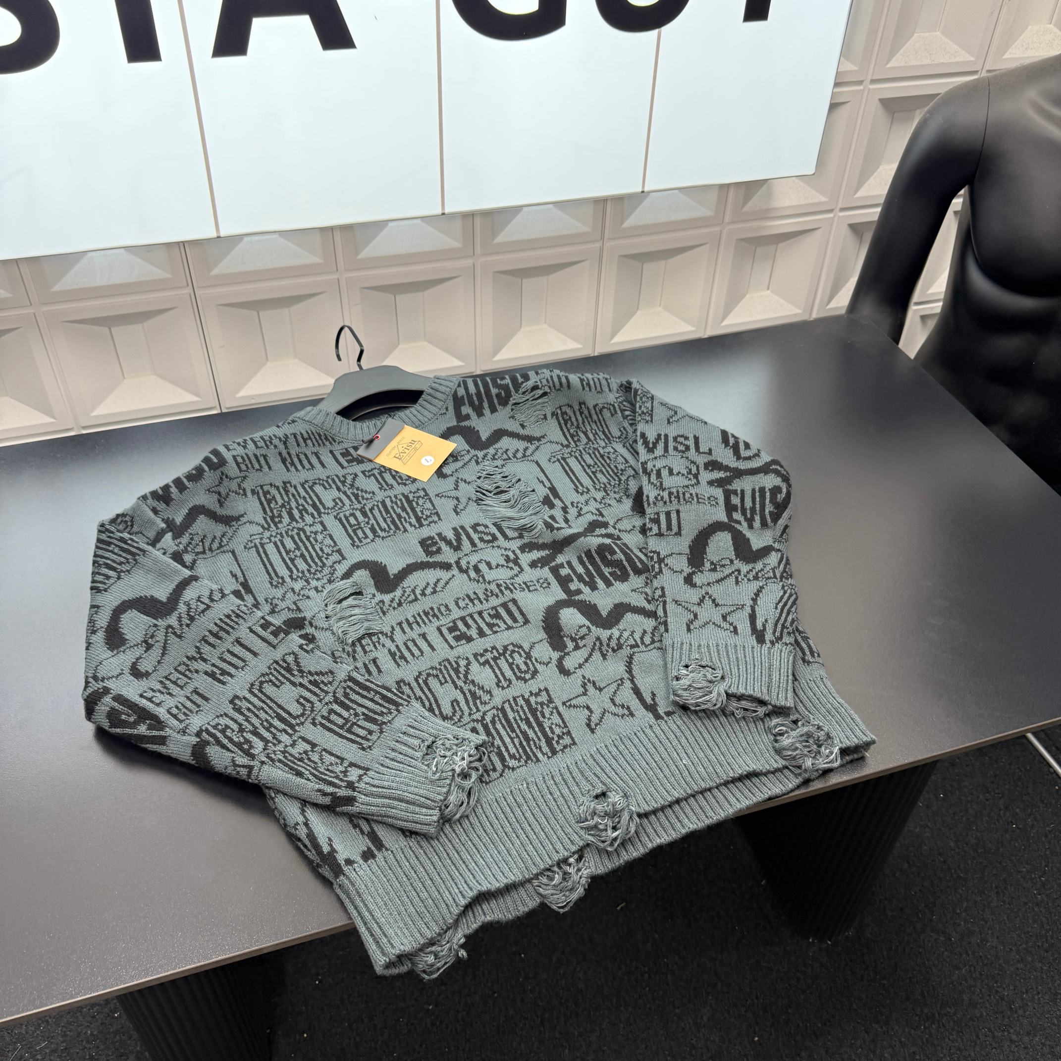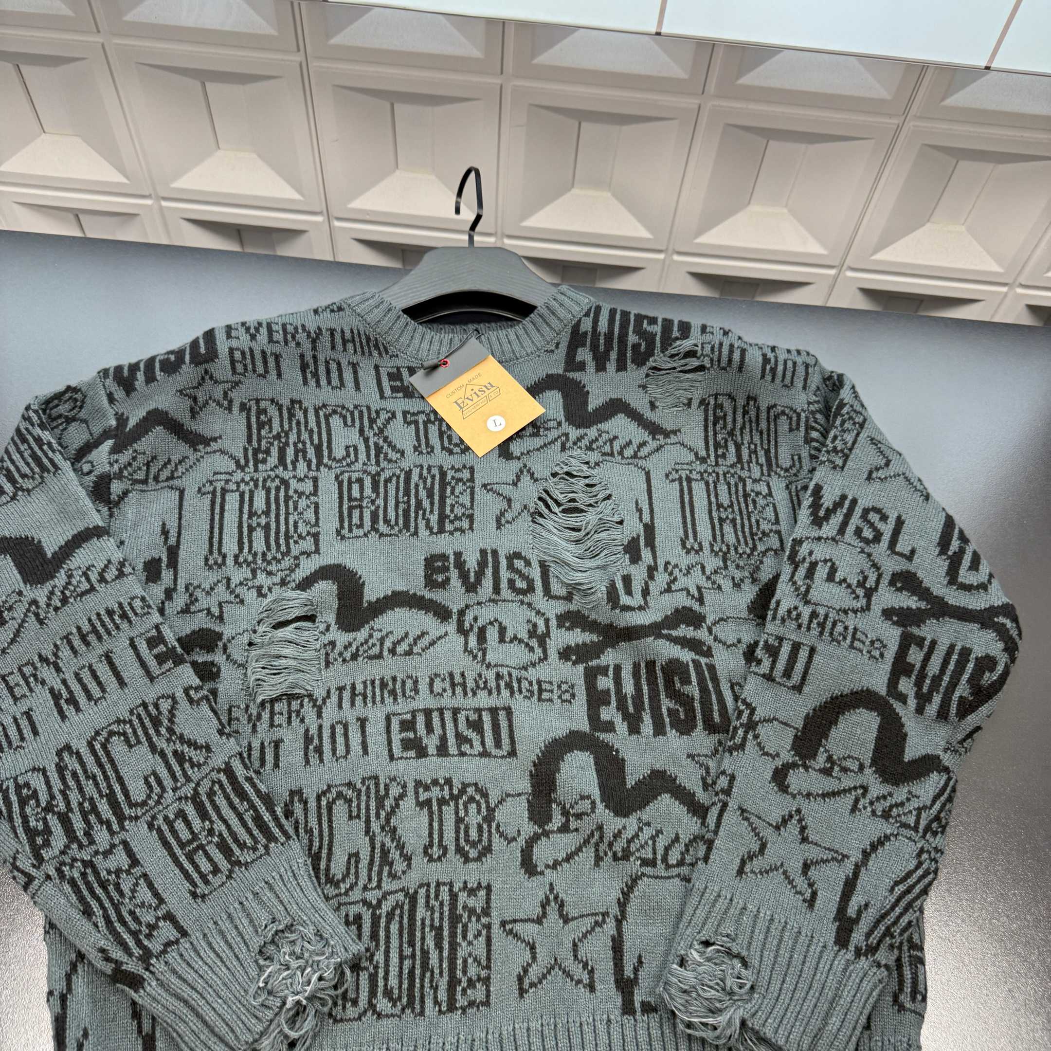 冬季热销爆款网红博主推荐款Evisu福神针织毛衣 满印字母海鸥图案 破坏破洞公园 三标齐全官网一致 放大看细节原相机实物拍摄 颜色 青色 尺码 L 4xl L 80 105斤 XL 105 120斤 2XL 120 140斤 3XL 140 160斤 4XL 160 180斤