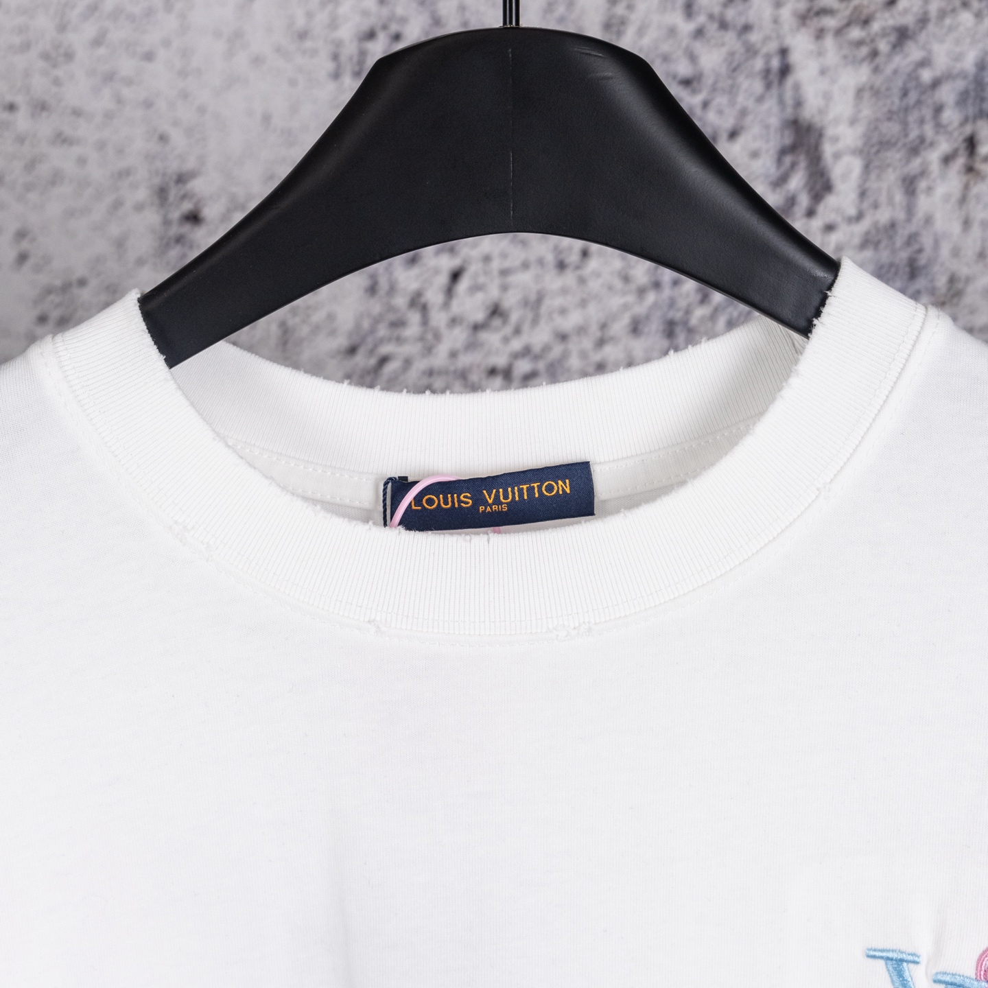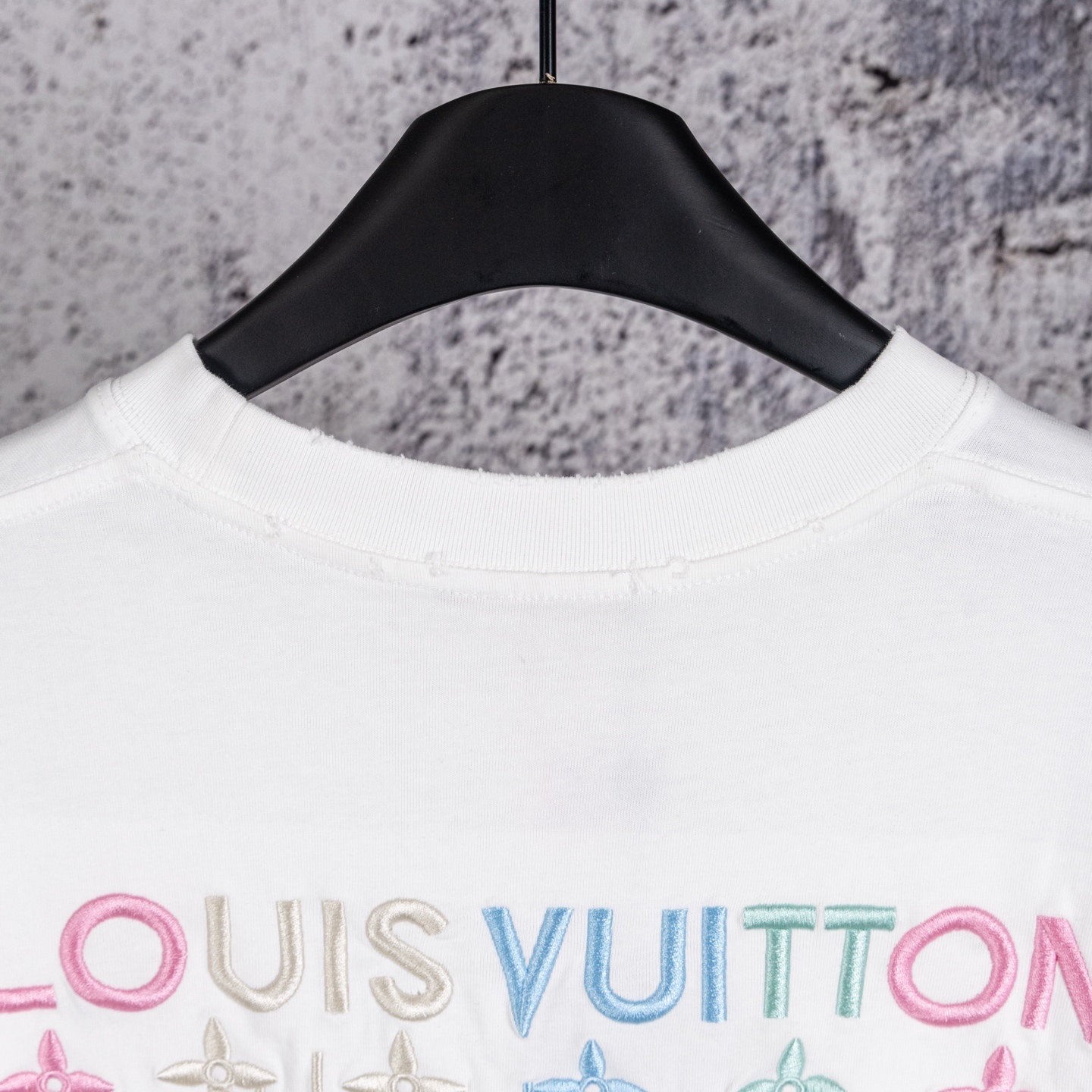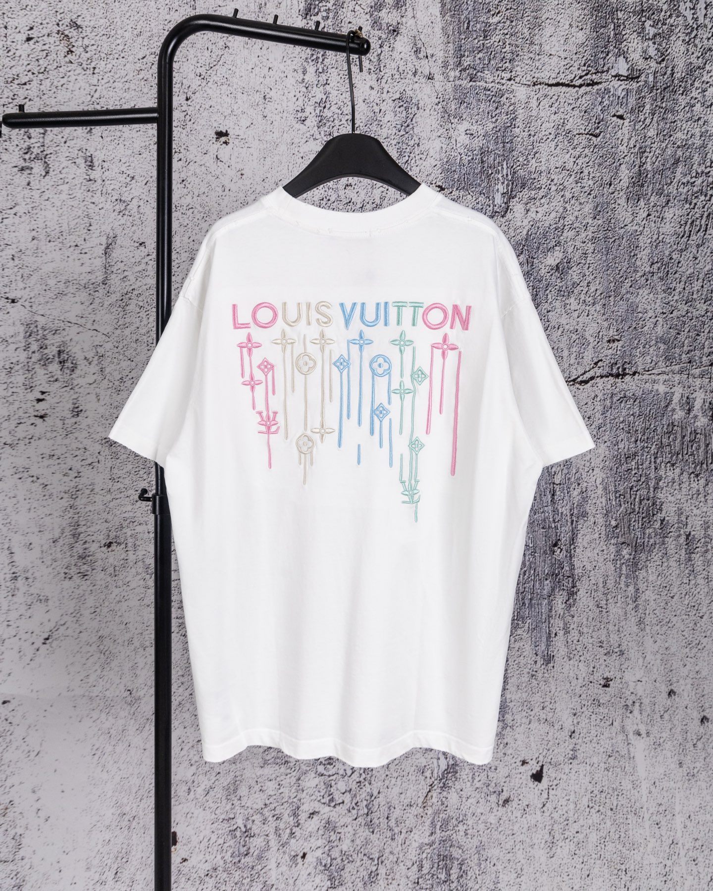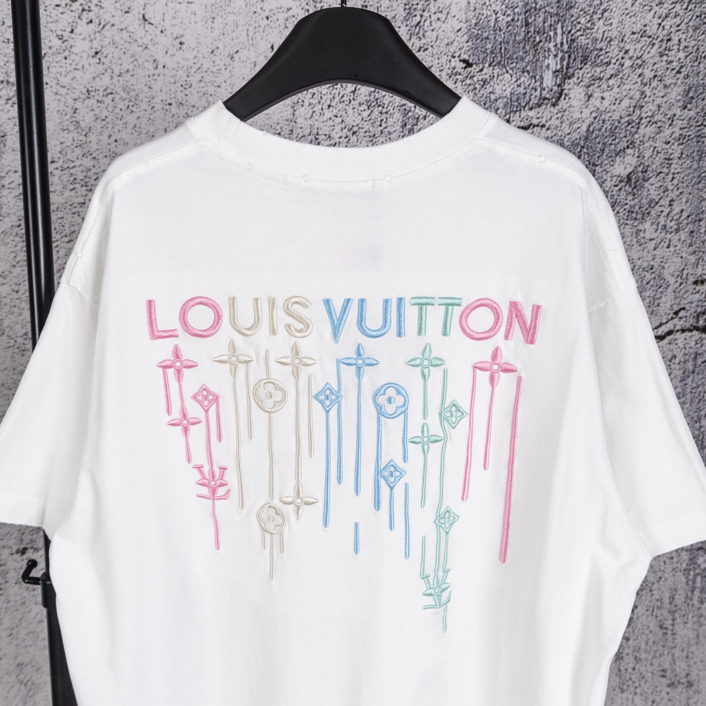 奢潮质感来袭 破洞做旧高级耐看 左胸精致品牌小标低调吸睛 后背满幅LOUIS VUITTON渐变彩色字母logo花卉重工精密刺绣 色彩清新又吸睛 辨识度直接拉满