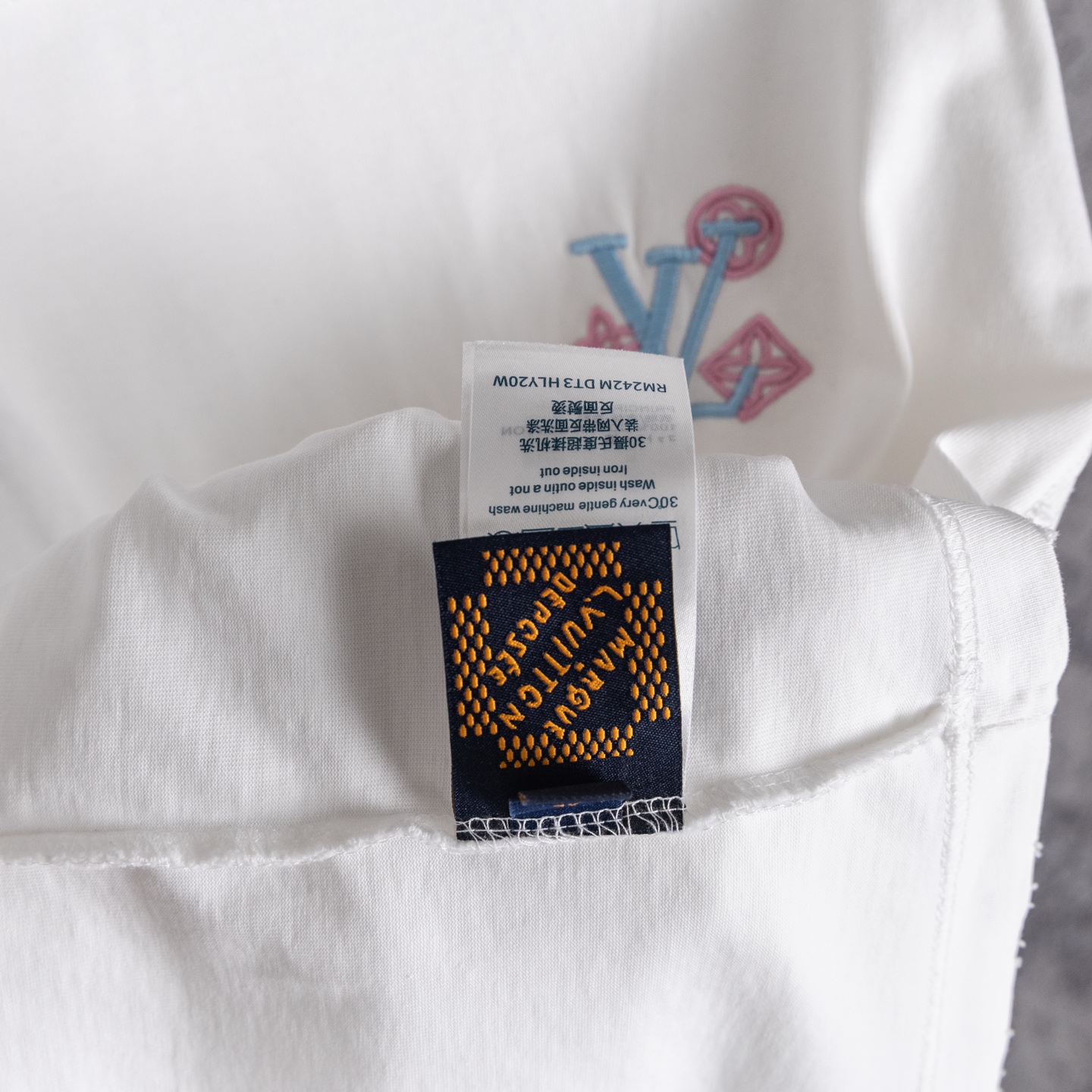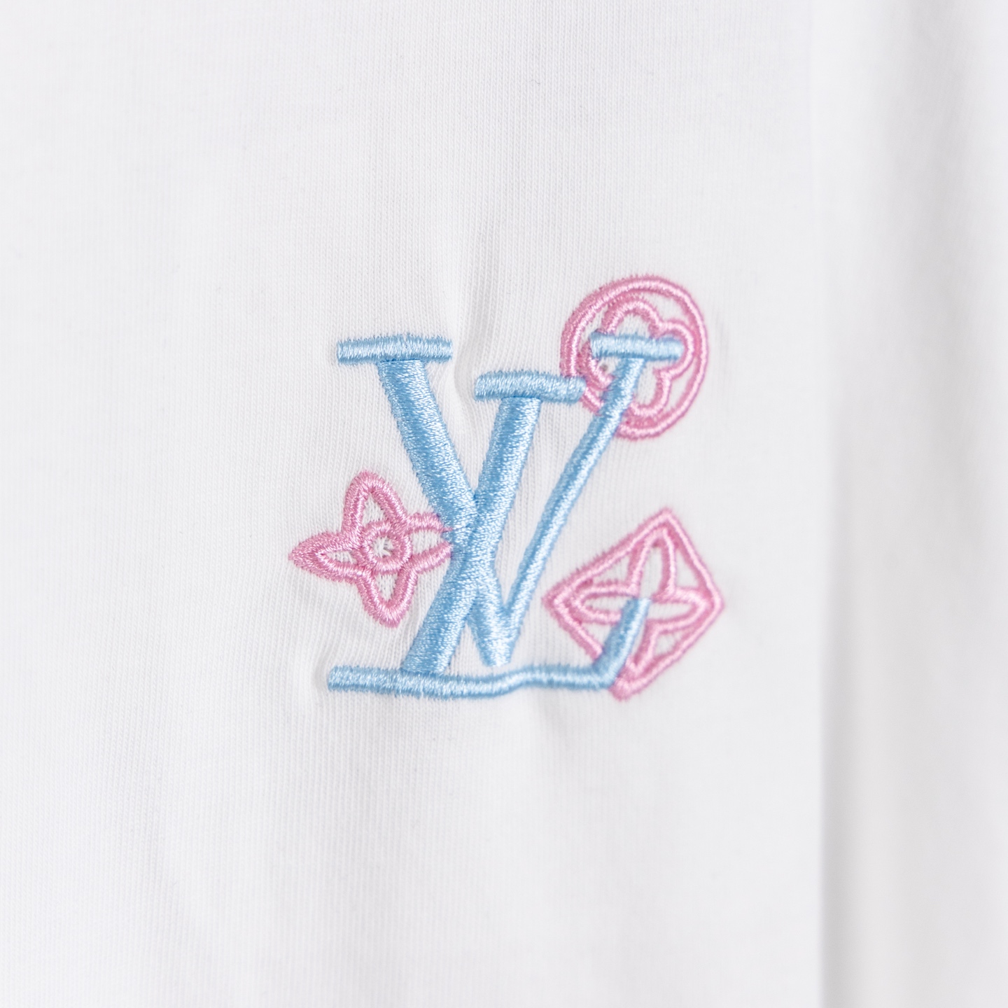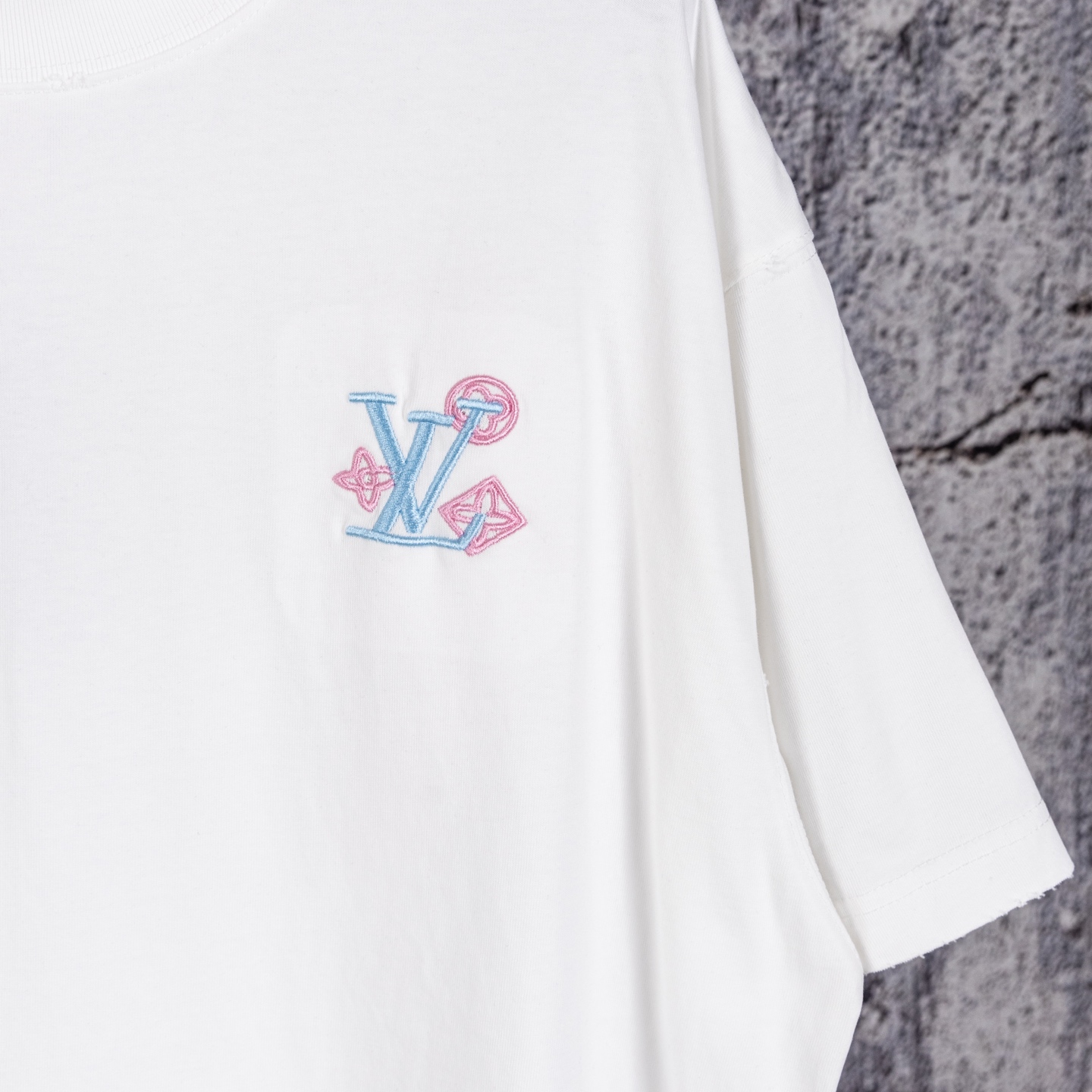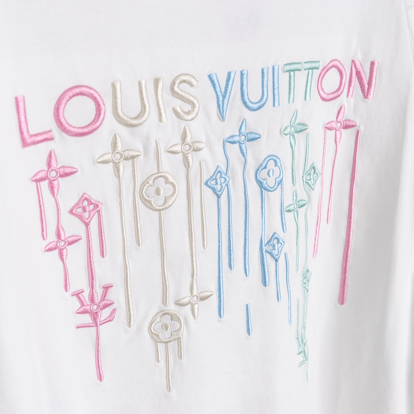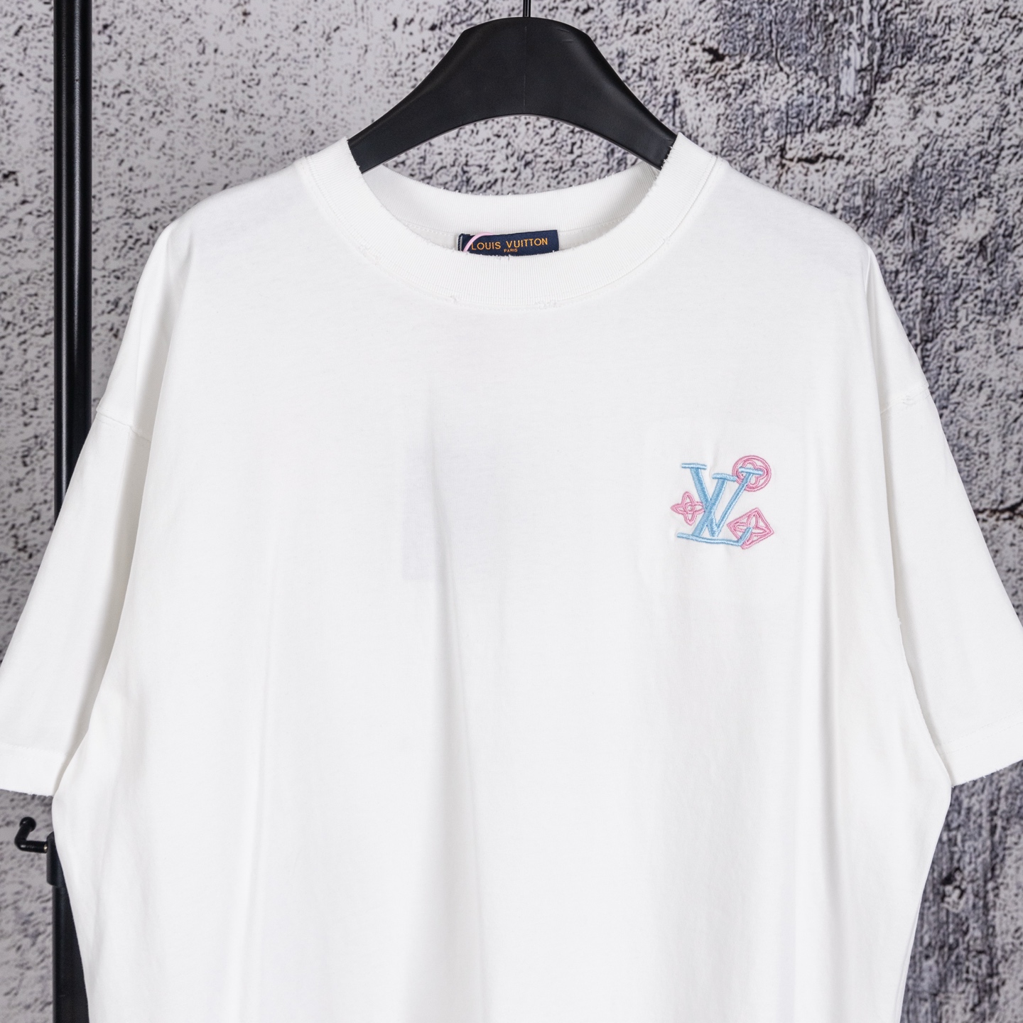 奢潮质感来袭 破洞做旧高级耐看 左胸精致品牌小标低调吸睛 后背满幅LOUIS VUITTON渐变彩色字母logo花卉重工精密刺绣 色彩清新又吸睛 辨识度直接拉满