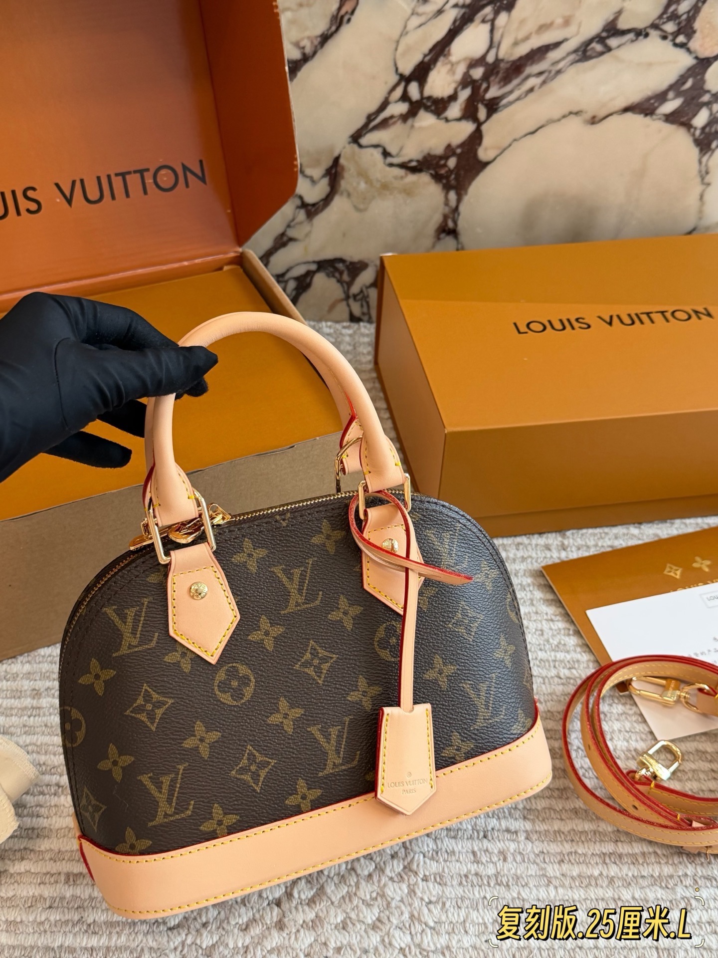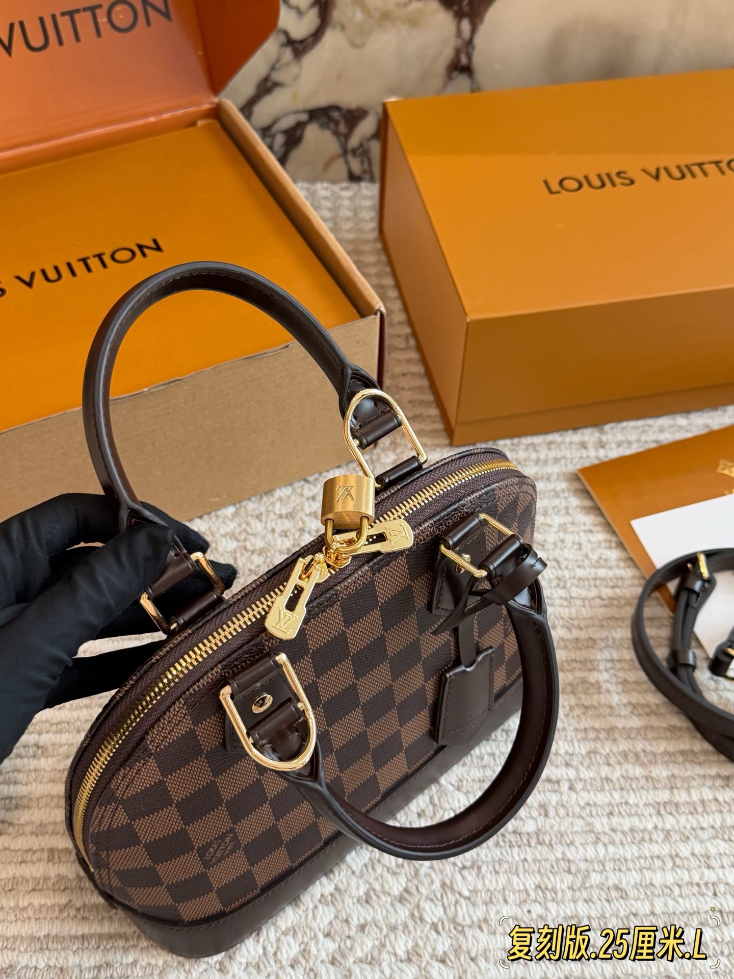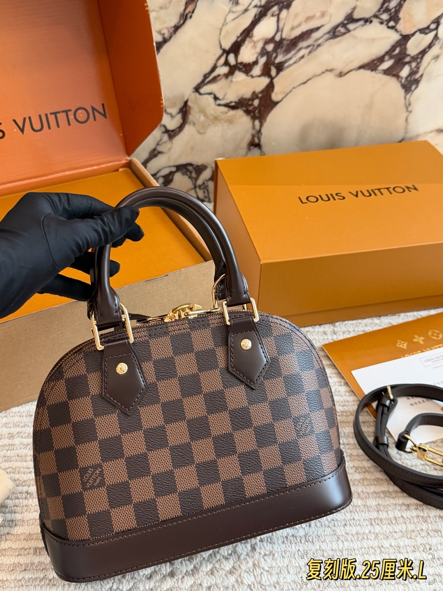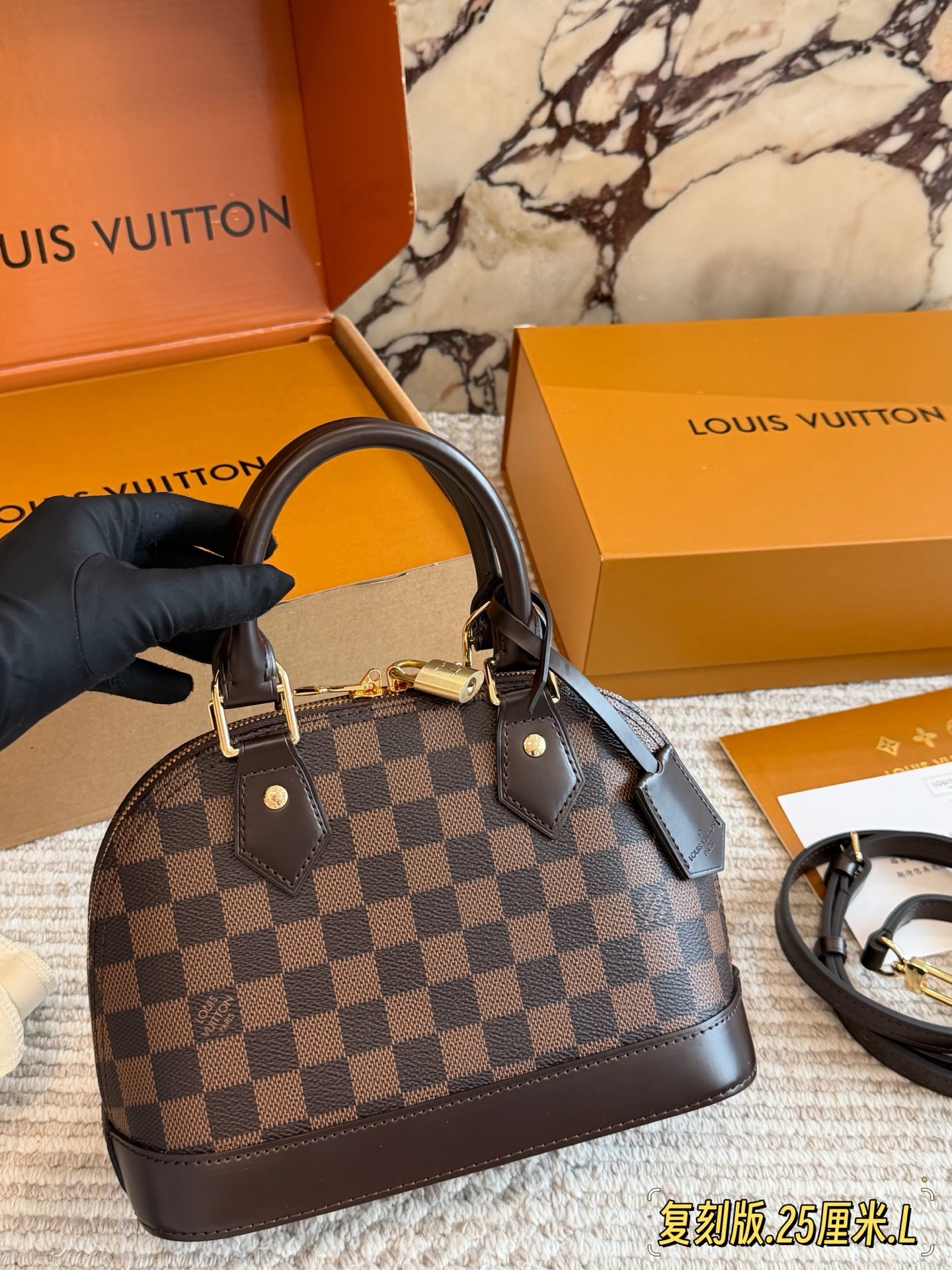 全套折叠盒包装 Lv alma bb老花贝壳包 原版高品质 包包这款Retiro 手袋以标志性的老花面料制成 经典永恒 优雅低调的外形设计和宽敞的包身更加入了实用性 使用说明 变色牛皮饰边 闪亮的纯钢金色五金配件 可调节肩带 配有树糕皮的肩垫 拉链闭合 超细纤维内衬 尺寸24 18cm 收起