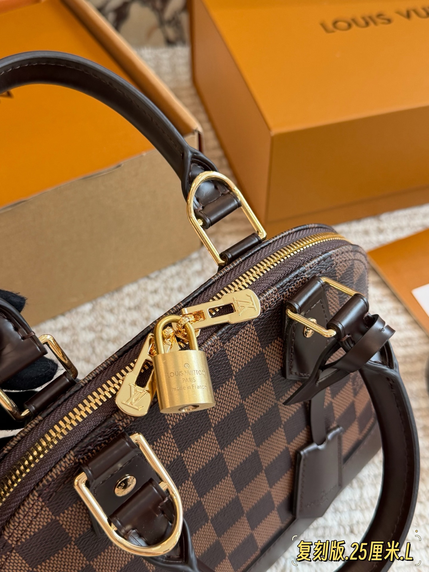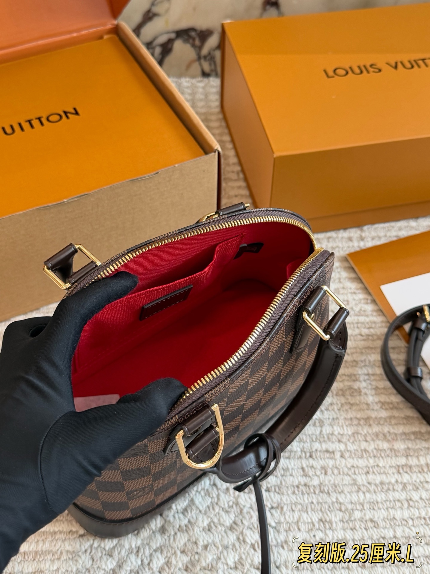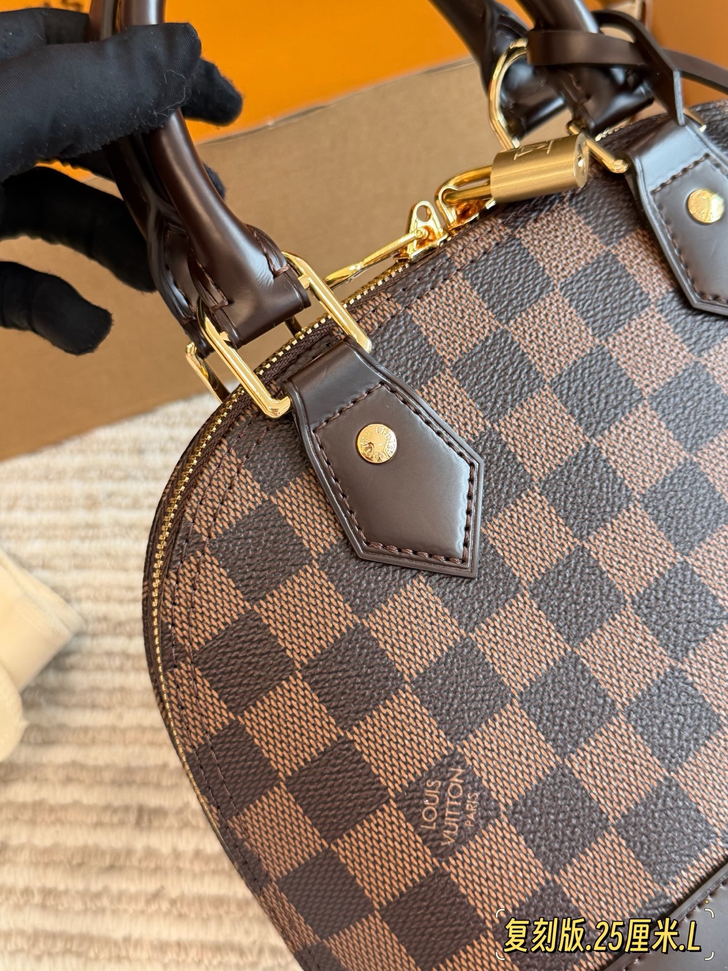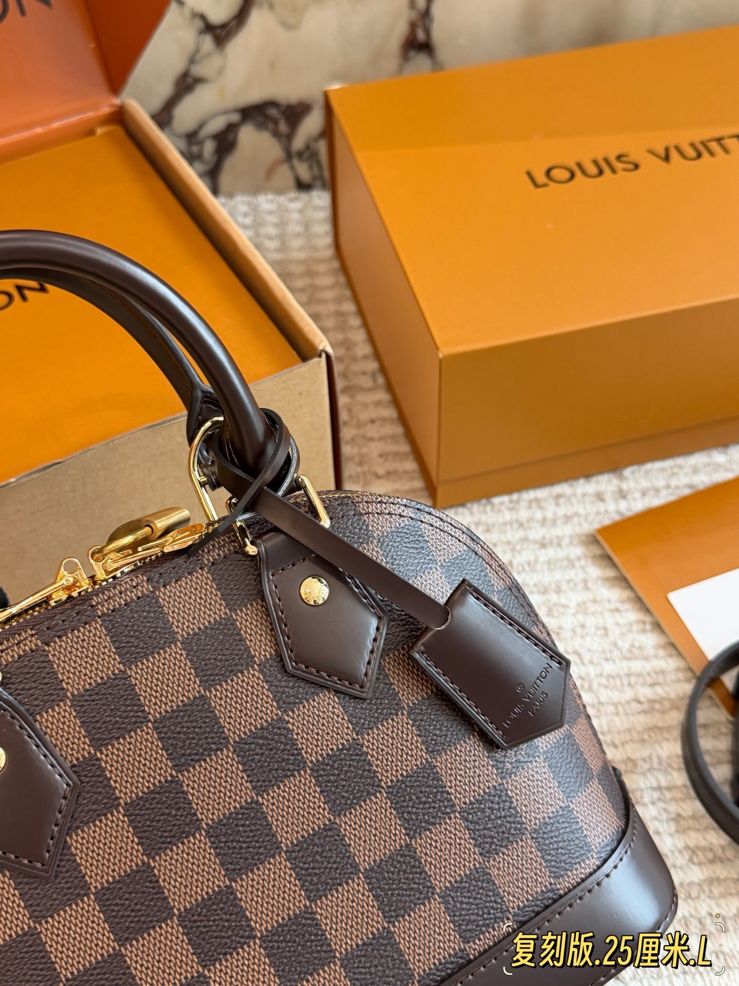 全套折叠盒包装 Lv alma bb老花贝壳包 原版高品质 包包这款Retiro 手袋以标志性的老花面料制成 经典永恒 优雅低调的外形设计和宽敞的包身更加入了实用性 使用说明 变色牛皮饰边 闪亮的纯钢金色五金配件 可调节肩带 配有树糕皮的肩垫 拉链闭合 超细纤维内衬 尺寸24 18cm 收起