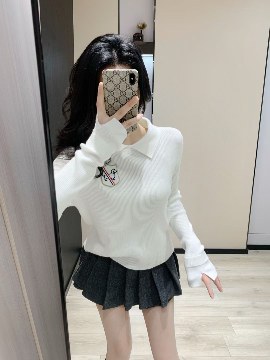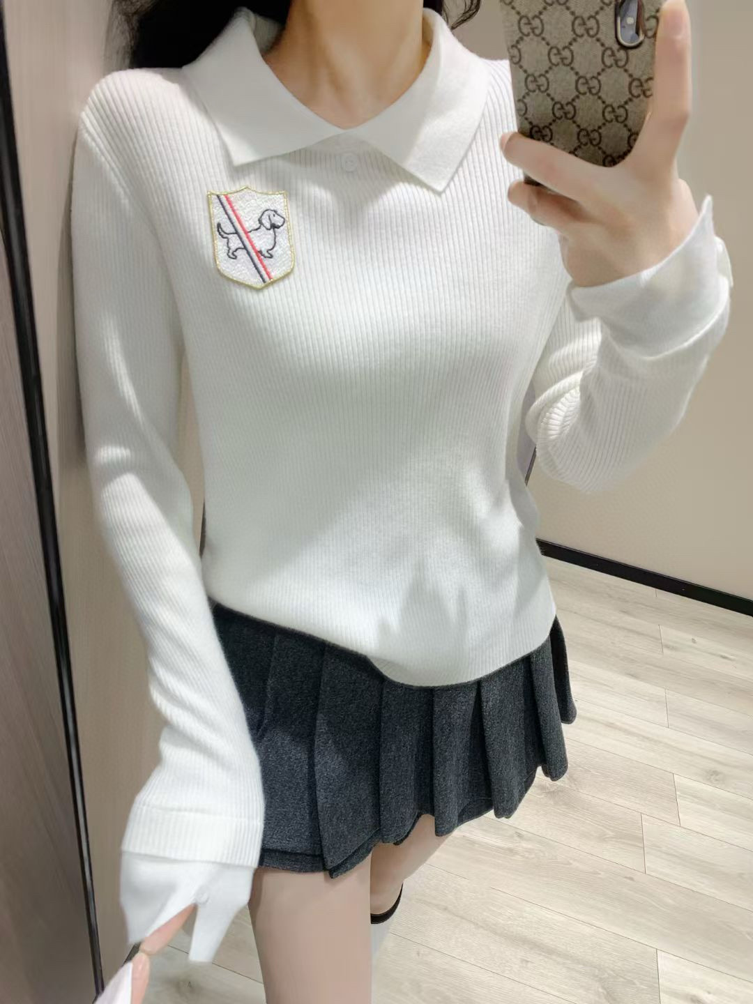 Thom Browne TB小狗刺绣徽章翻领长袖针织毛衣 款 355101