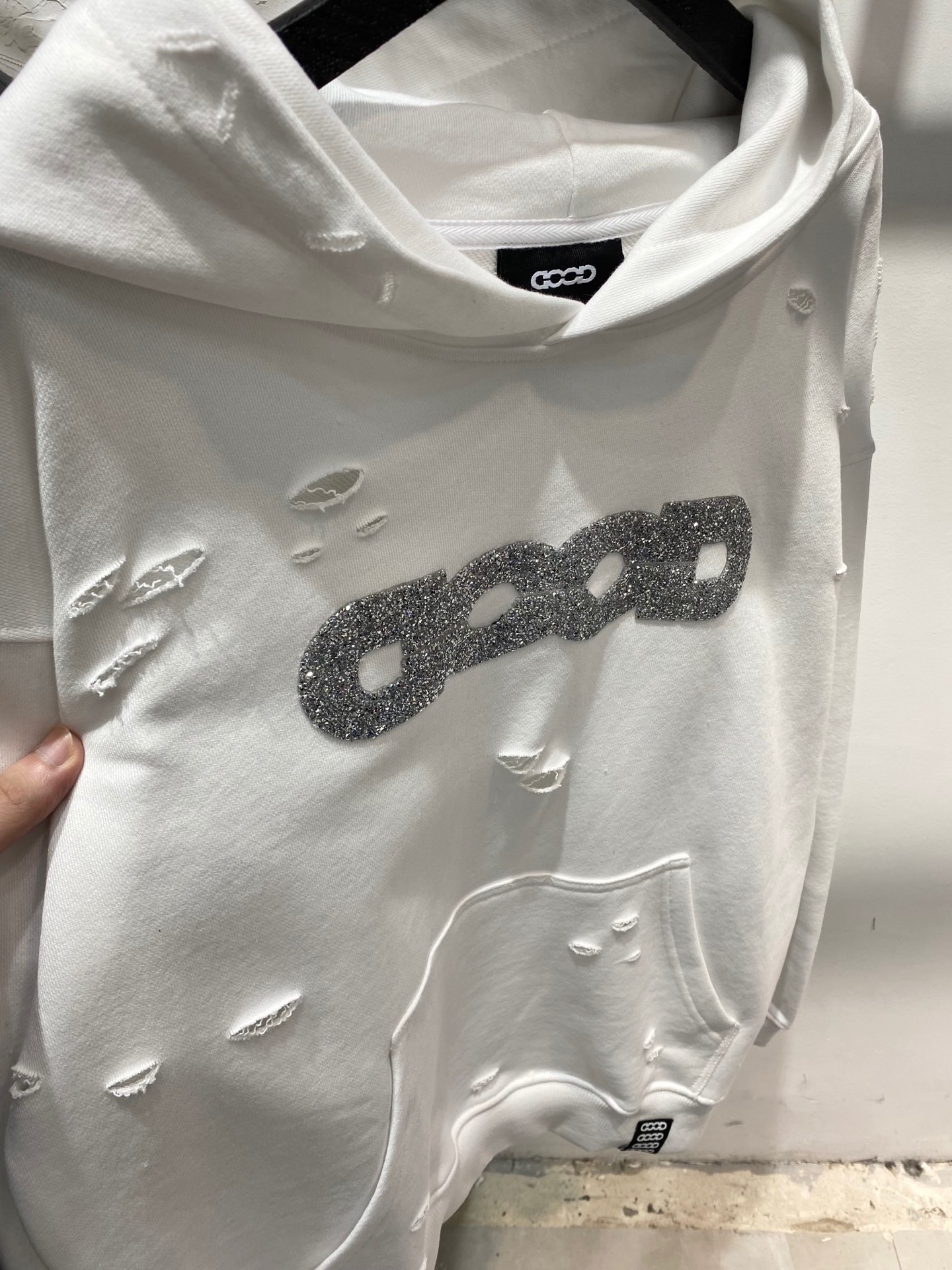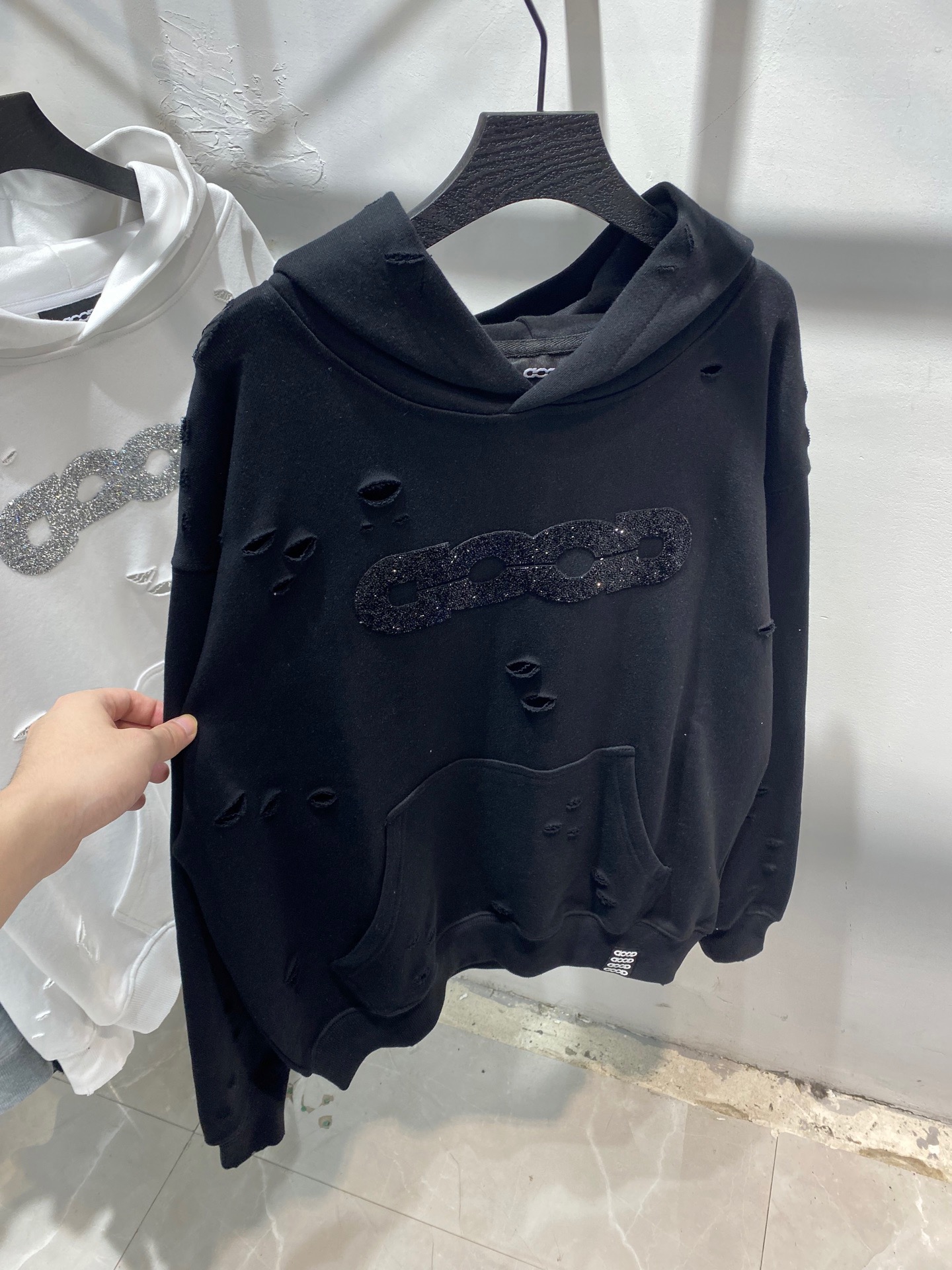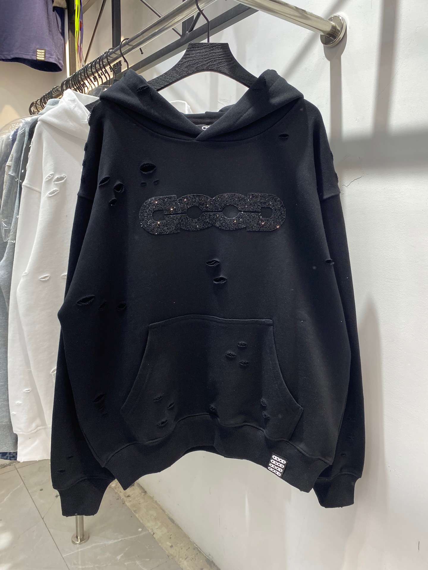GOODBRAND碎钻磨破工艺长袖连帽卫衣