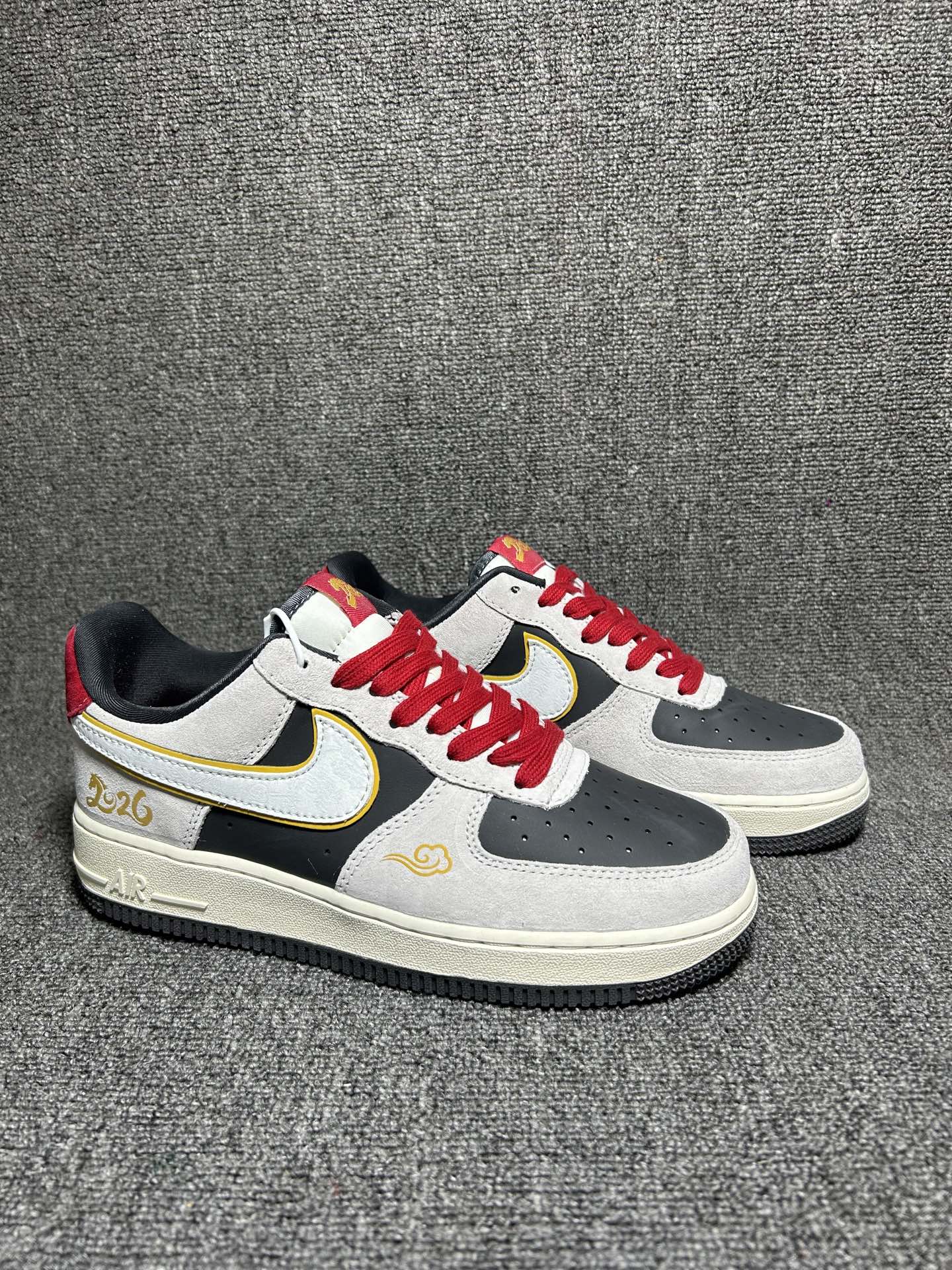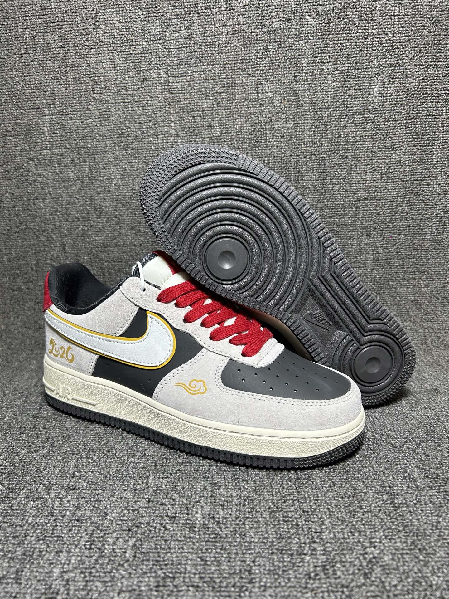 2026新款定制限量发售高端定制Nike Air Force 1 07 Low 马年限定联名 白灰中国风 鞋身侧面印有金色 2026 字样与祥云纹样 鞋盒饰有金色祥云图案 直接呼应2026蛇年的生肖主题