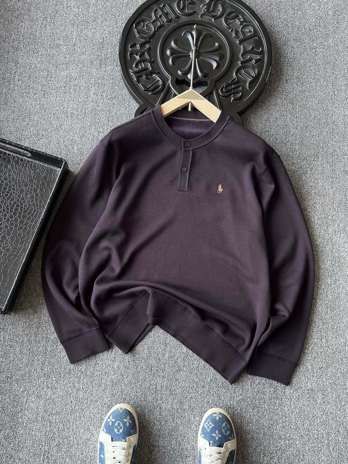细节细节再细节 Ralph Lauren家商场新款加绒毛衣 横机摇片毛衣的织法做成圆领Polo效果 门襟双纽扣设计 胸前立体拉夫劳伦Polo棕标 手绘线条肌理 十分精致 整件衣服所有拼缝全部采用明显四针十六线织法 懂行的都知道这对于机械的精度要求以及车工的精湛手法很有讲究