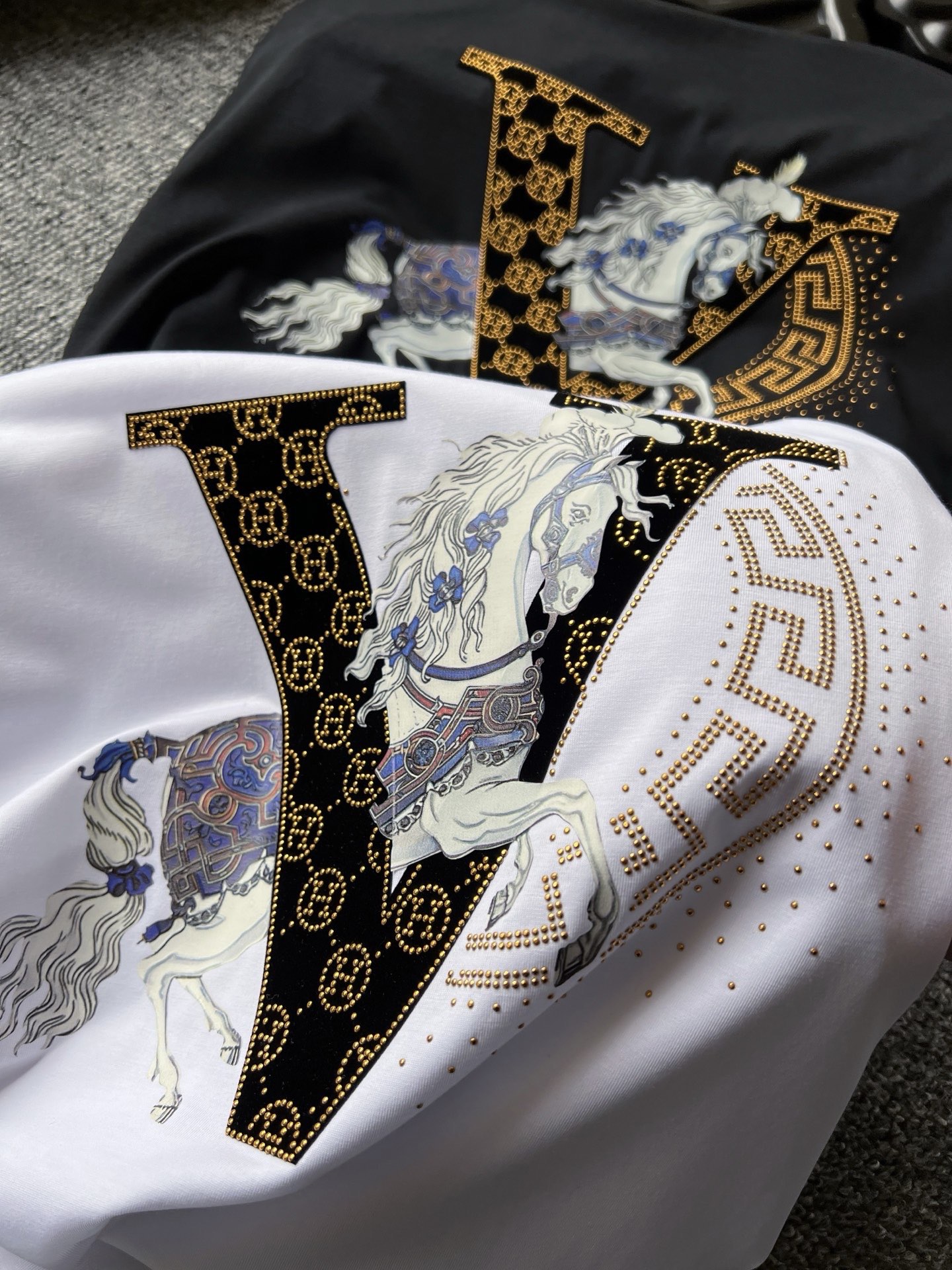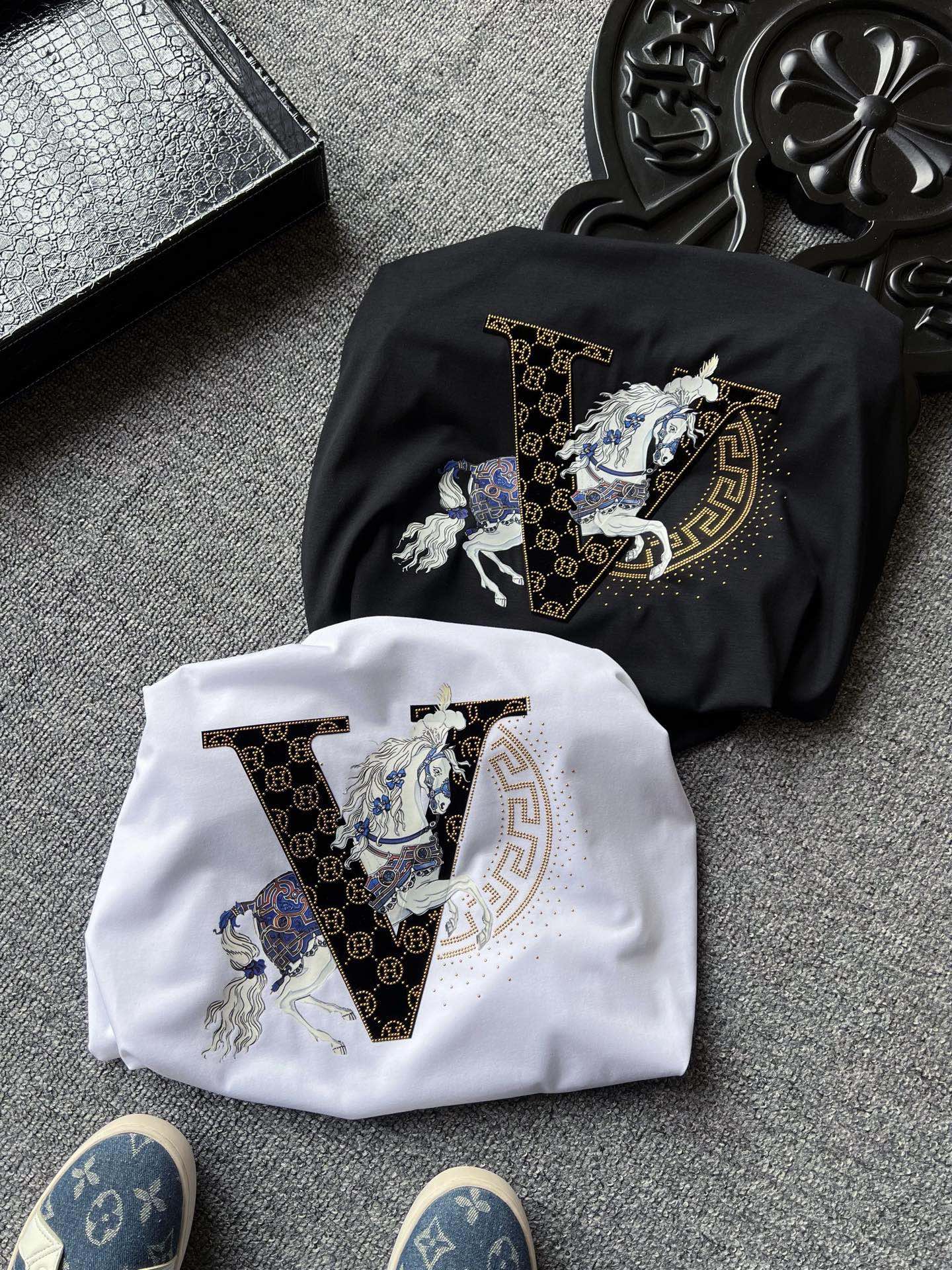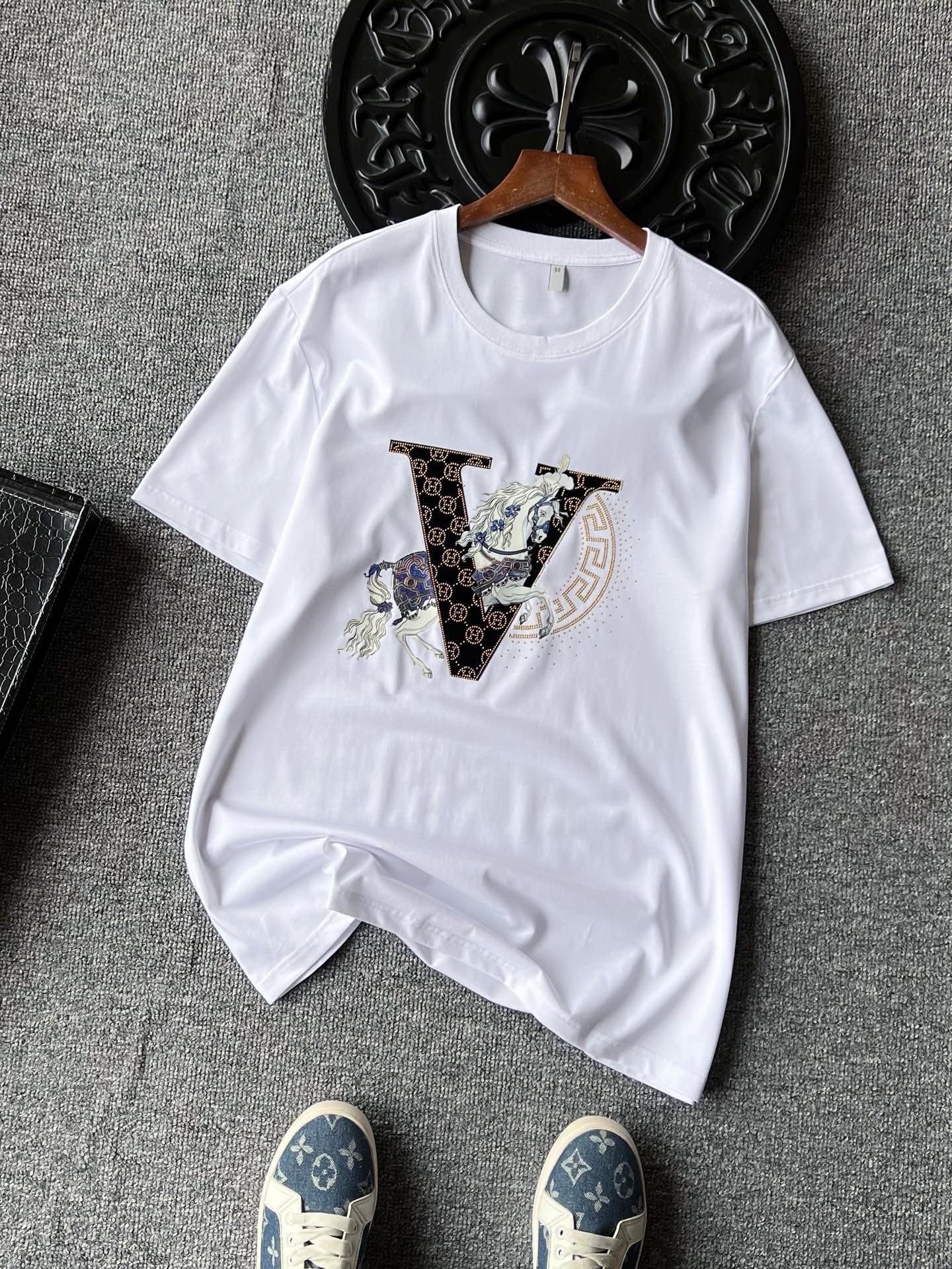 细节细节再细节 Hermes家流量爆款双色T恤 4道组合重工工序 胸前植绒V标镶嵌爱马仕H金钻小标 彩标白马贯穿布局 右侧半弧形欧货金钻细节配合喷墨式细钻点缀 整体十分精致 双本针领口精湛做工 无可挑剔