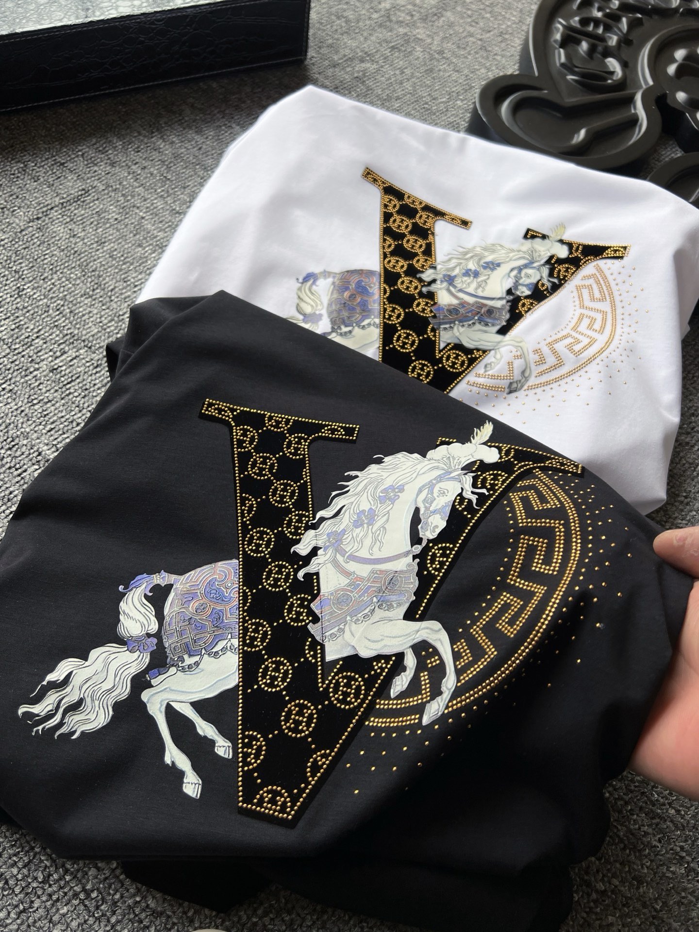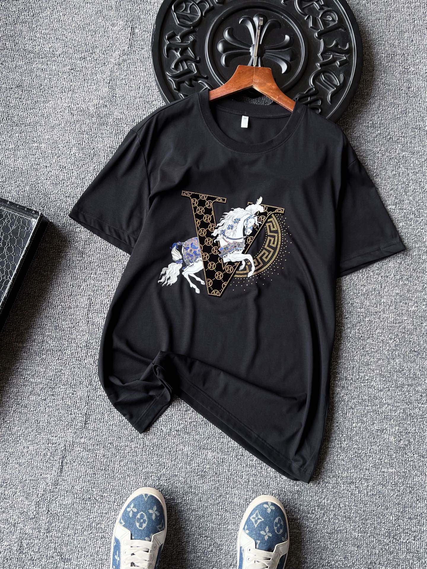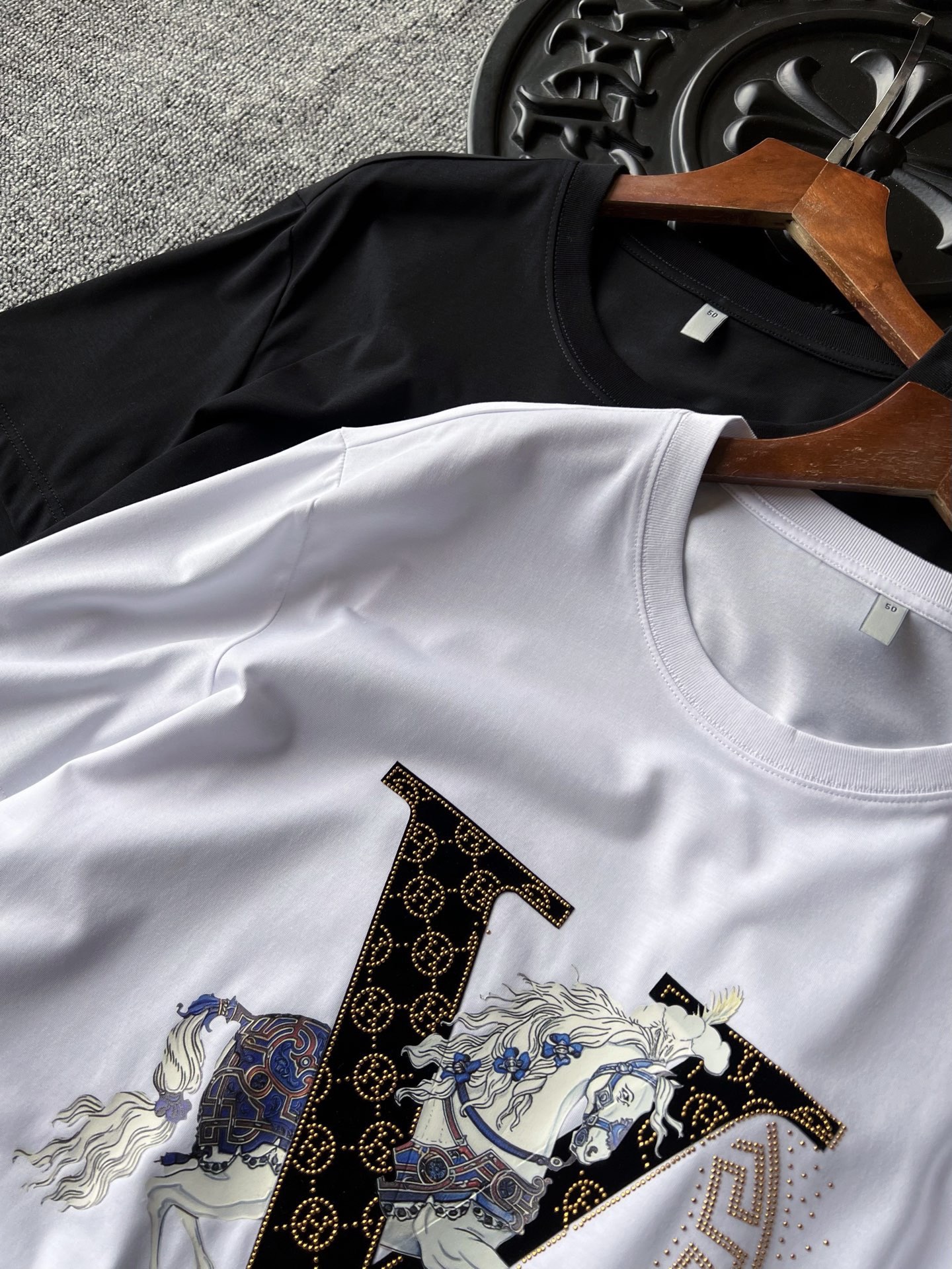 细节细节再细节 Hermes家流量爆款双色T恤 4道组合重工工序 胸前植绒V标镶嵌爱马仕H金钻小标 彩标白马贯穿布局 右侧半弧形欧货金钻细节配合喷墨式细钻点缀 整体十分精致 双本针领口精湛做工 无可挑剔
