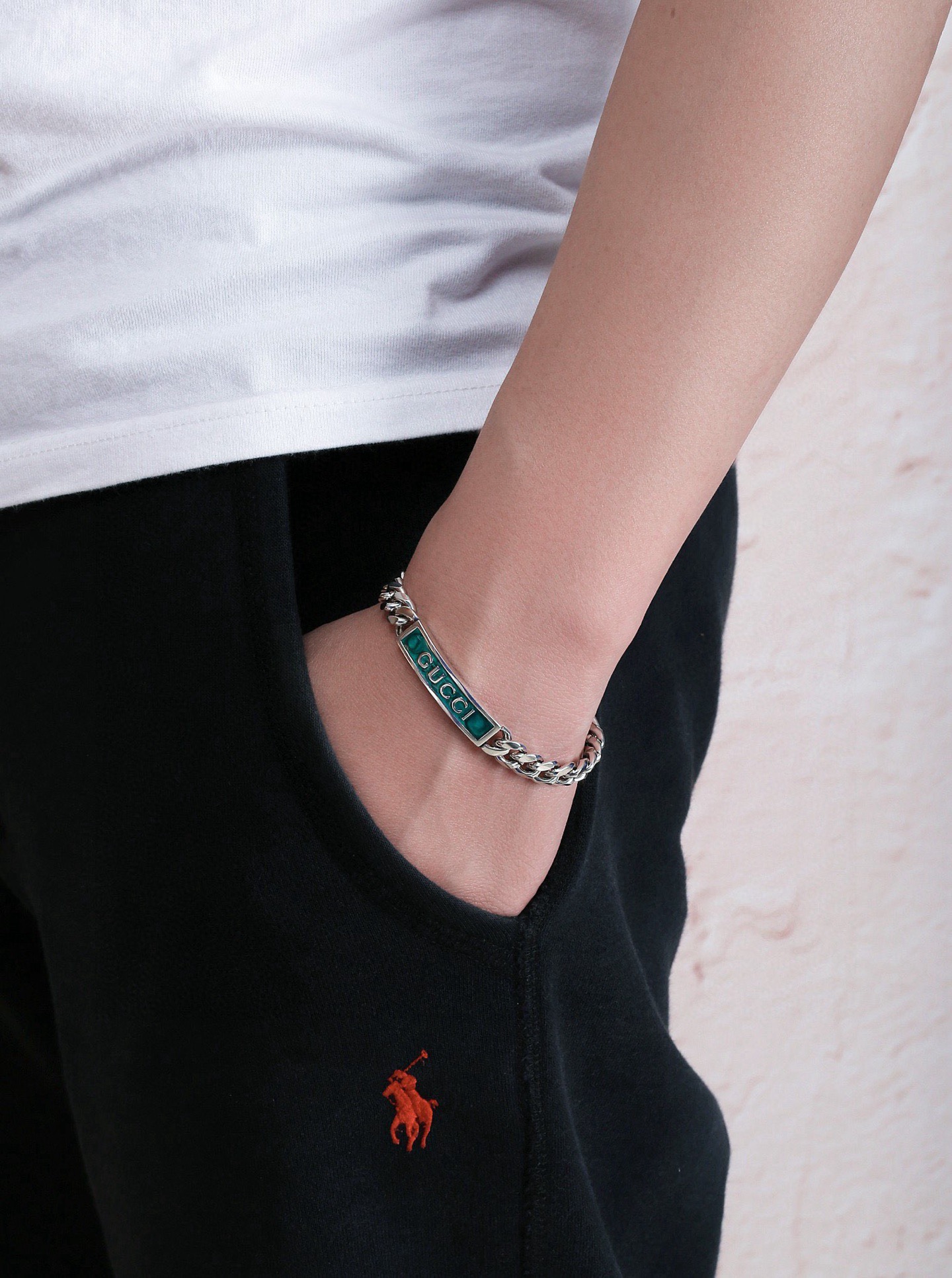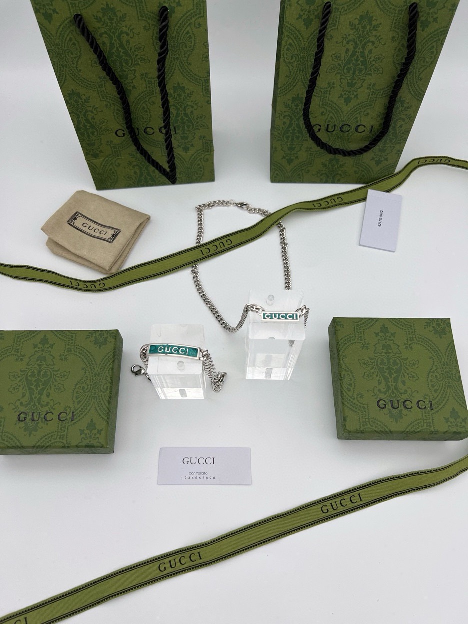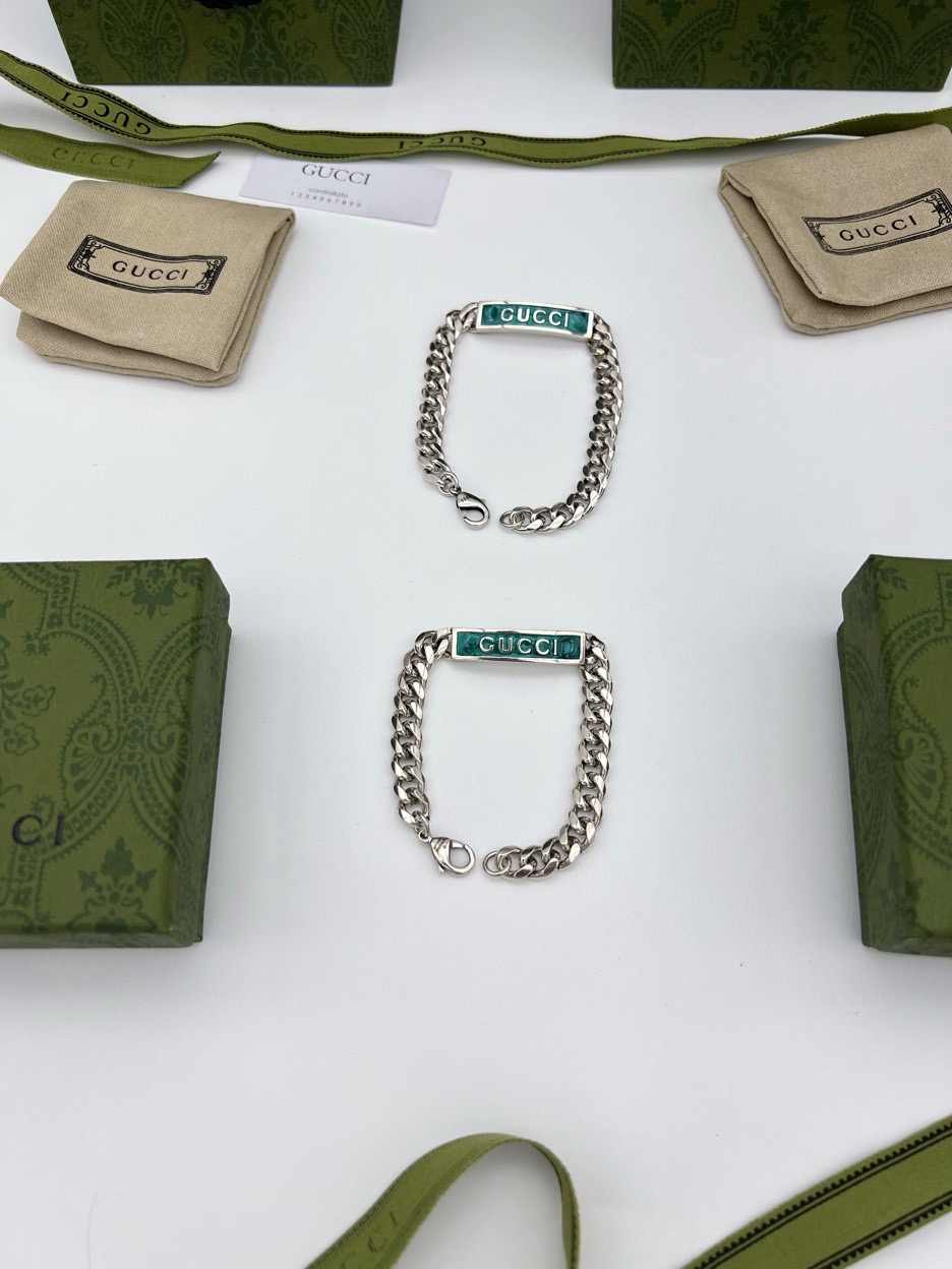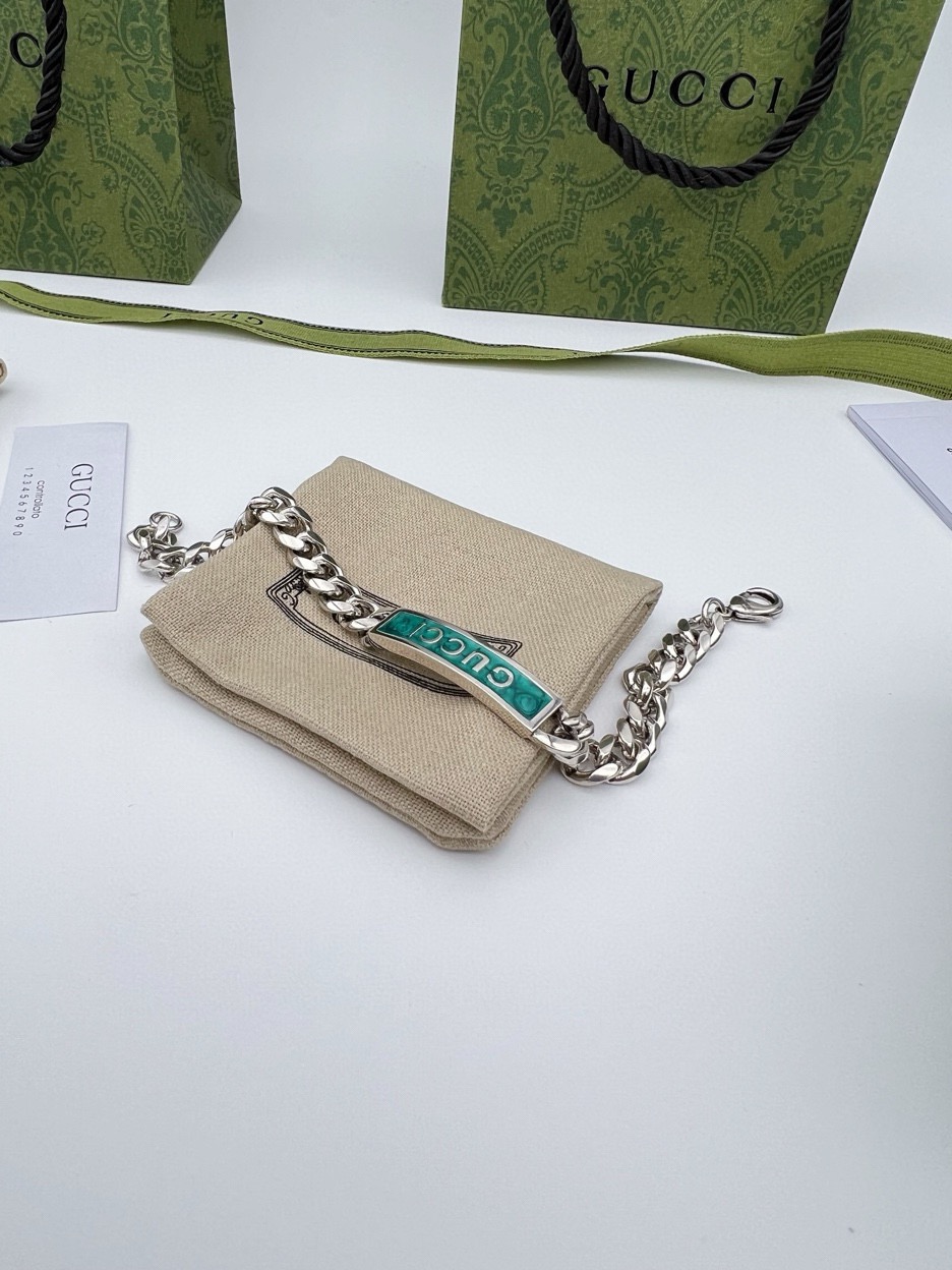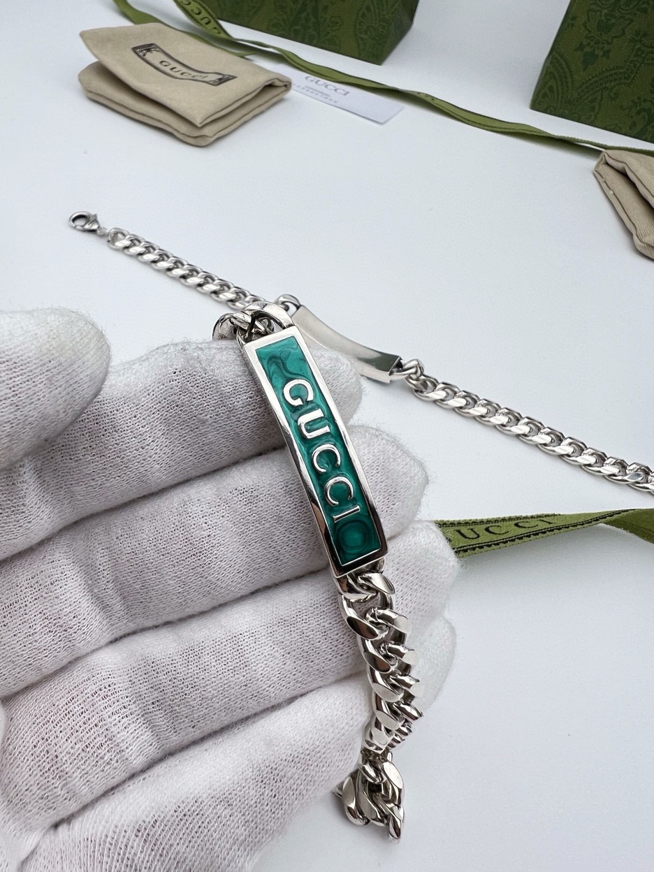 这款泰银手链匠心融入Gucci标识和宝石绿色珐琅细节 鲜艳明快的色调与大气粗犷的马衔索链交相映衬 于现代感中流露出优雅气息