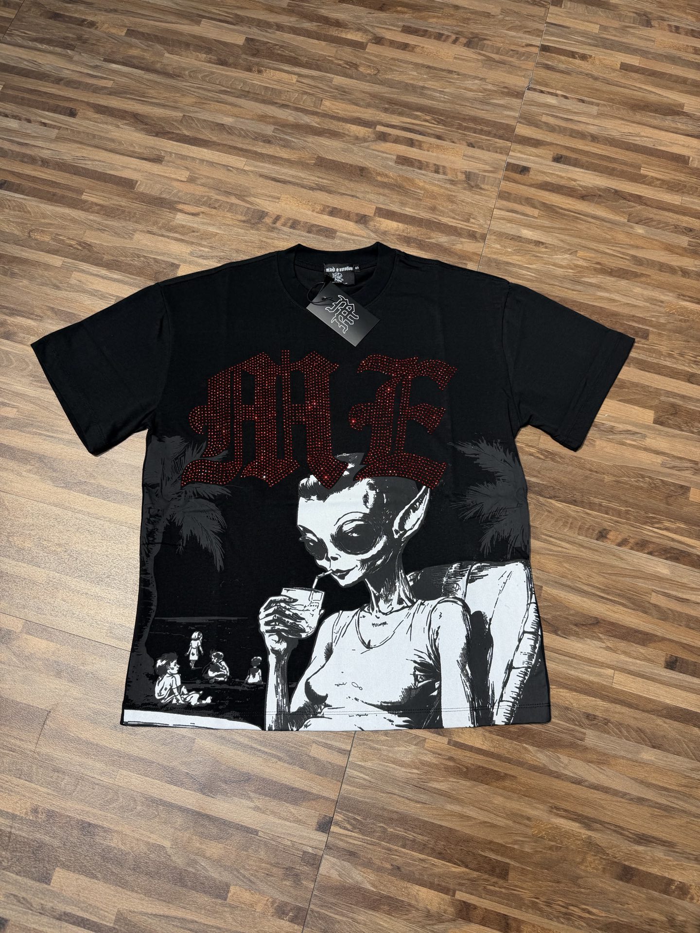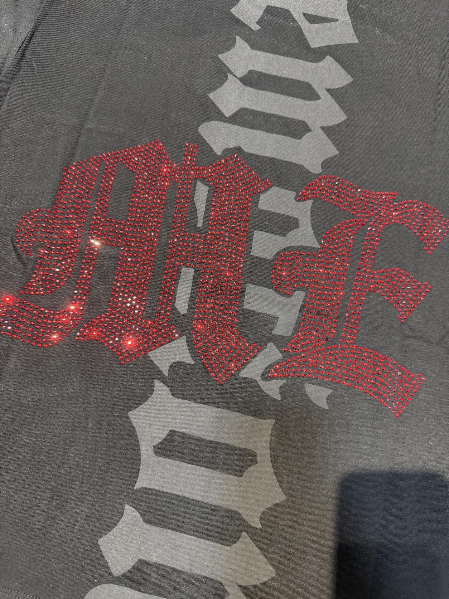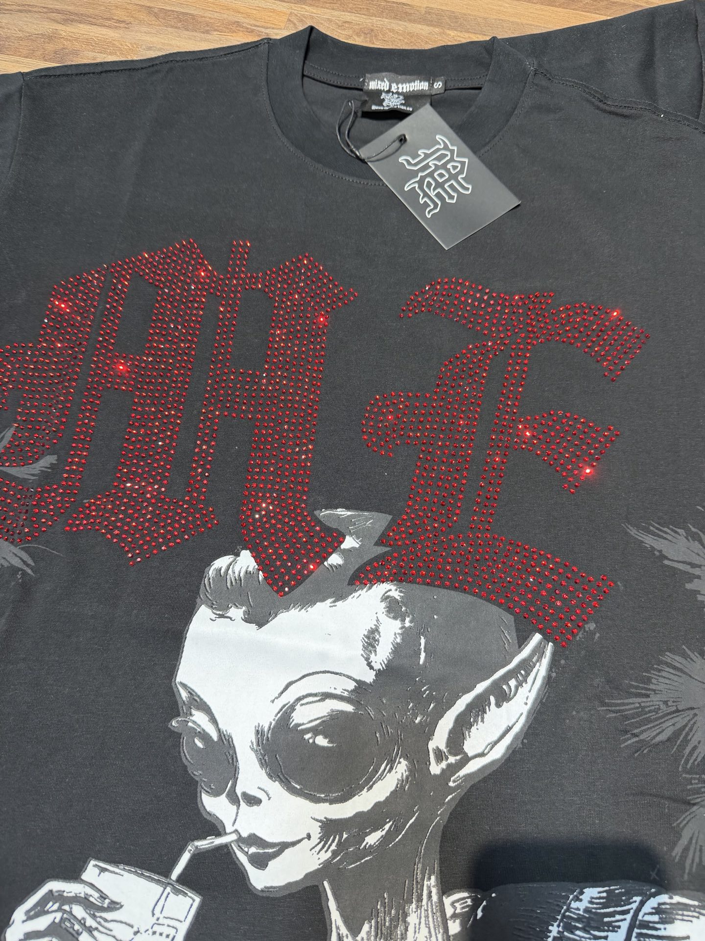 杏色 活性黑 MIXED EMOTION 现货实拍 烫进口澳钻 美式潮牌宽松休闲T恤 面料 fabric 32支270克重精梳双纱纯棉 码数 size S M L X L 工艺 高清印花 颜色 colour 杏色 活性黑