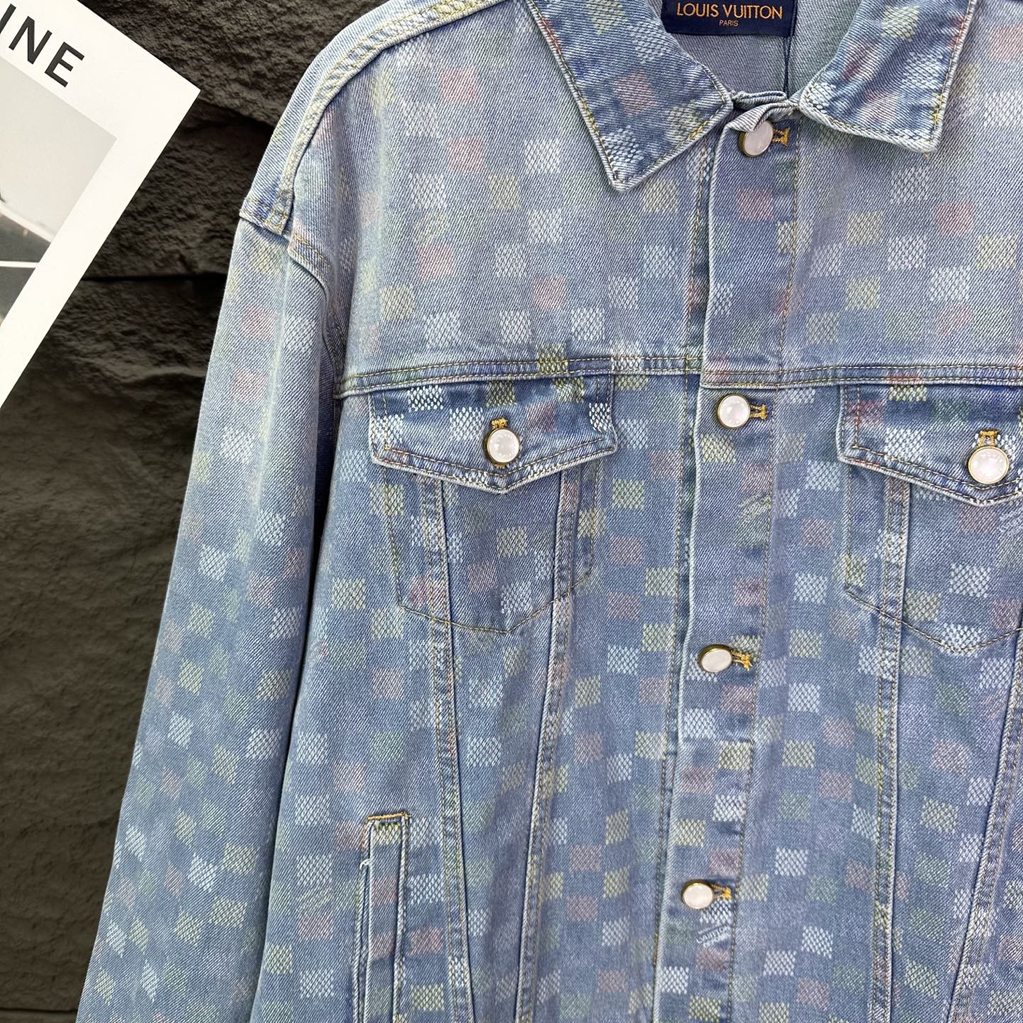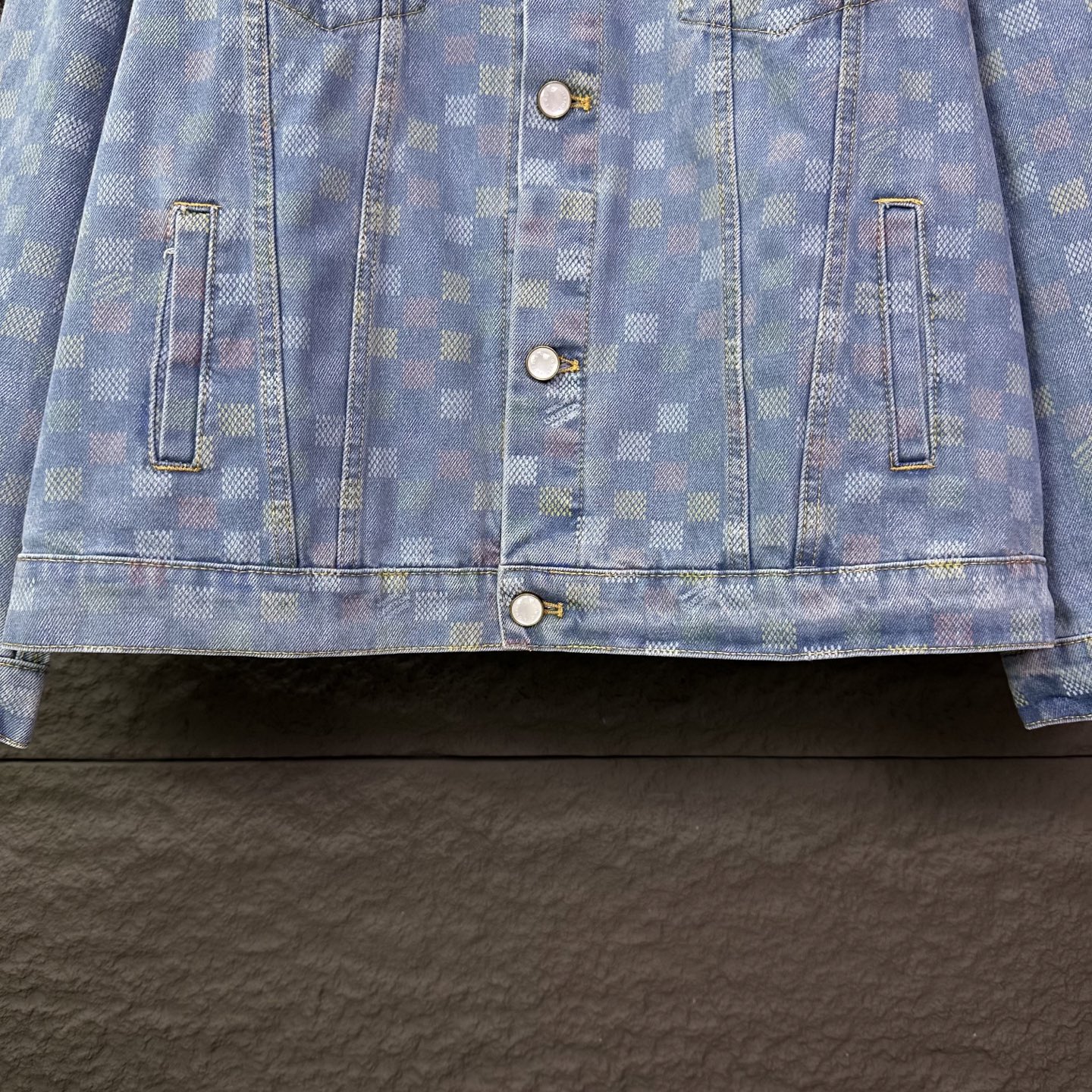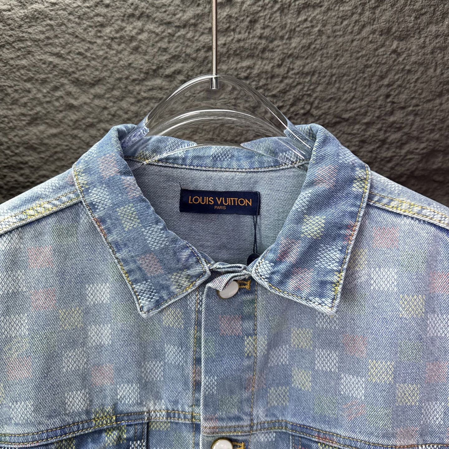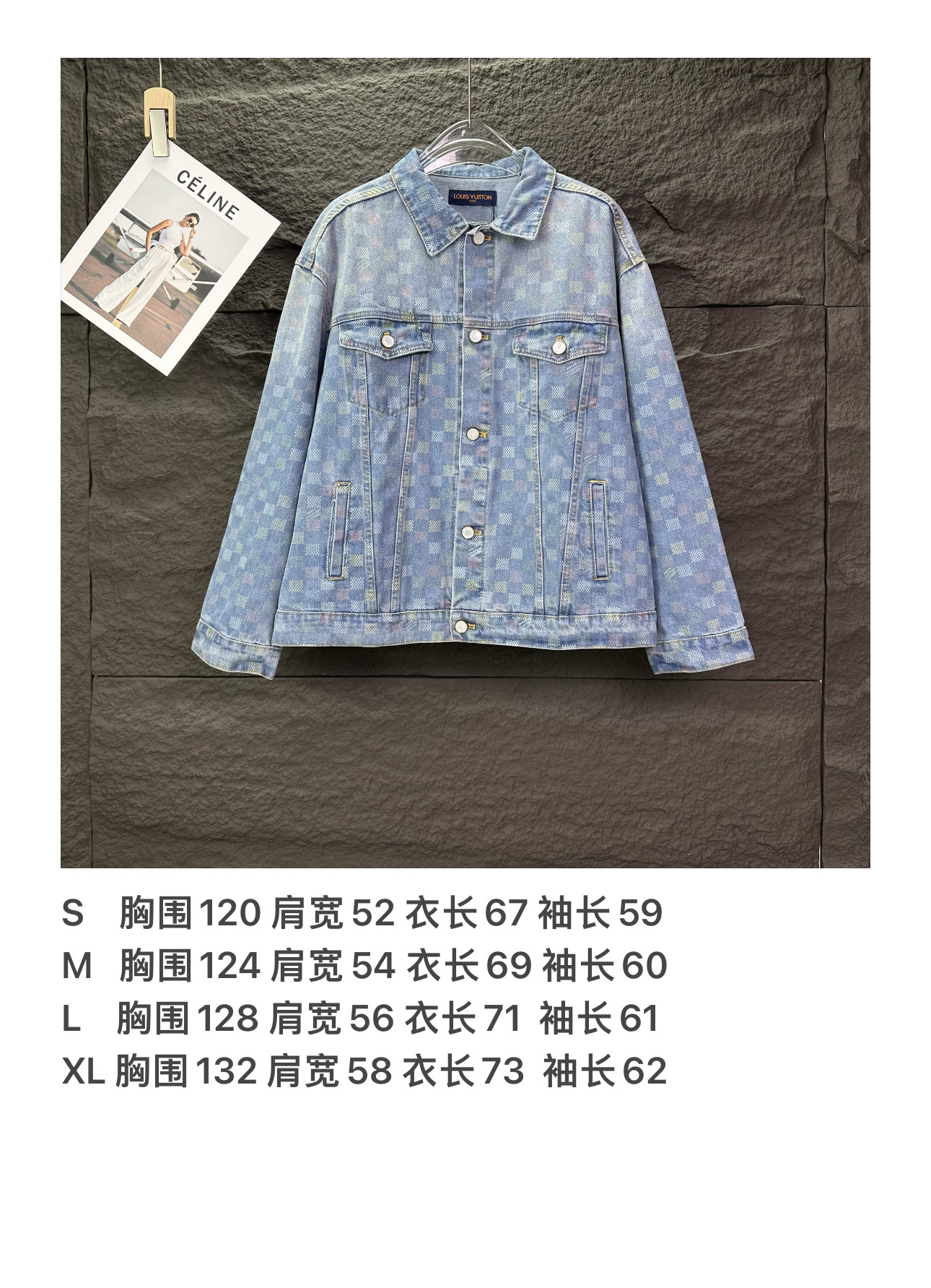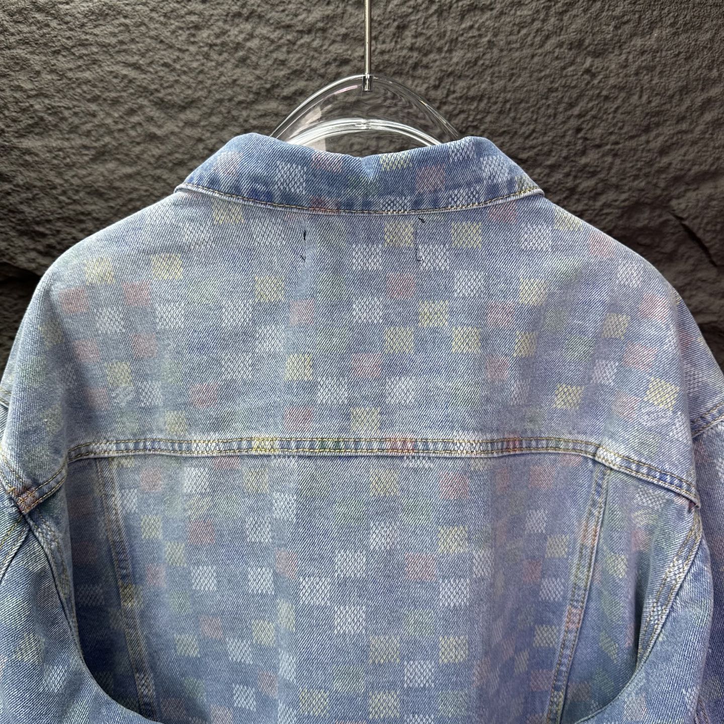 驴家2025新款彩色棋盘格情侣款水洗牛仔外套 高版本高版本 原版定制五金辅料 网红明星同款高级牛仔面料 定制YKK五金纽扣 全身彩色满印棋盘格图案设计 很高档 很有范儿 面料手感非常舒服 超级百搭好看的一款牛仔外套 三标齐全 男女同款 人手必备款 颜色 浅蓝色 尺码 S XL