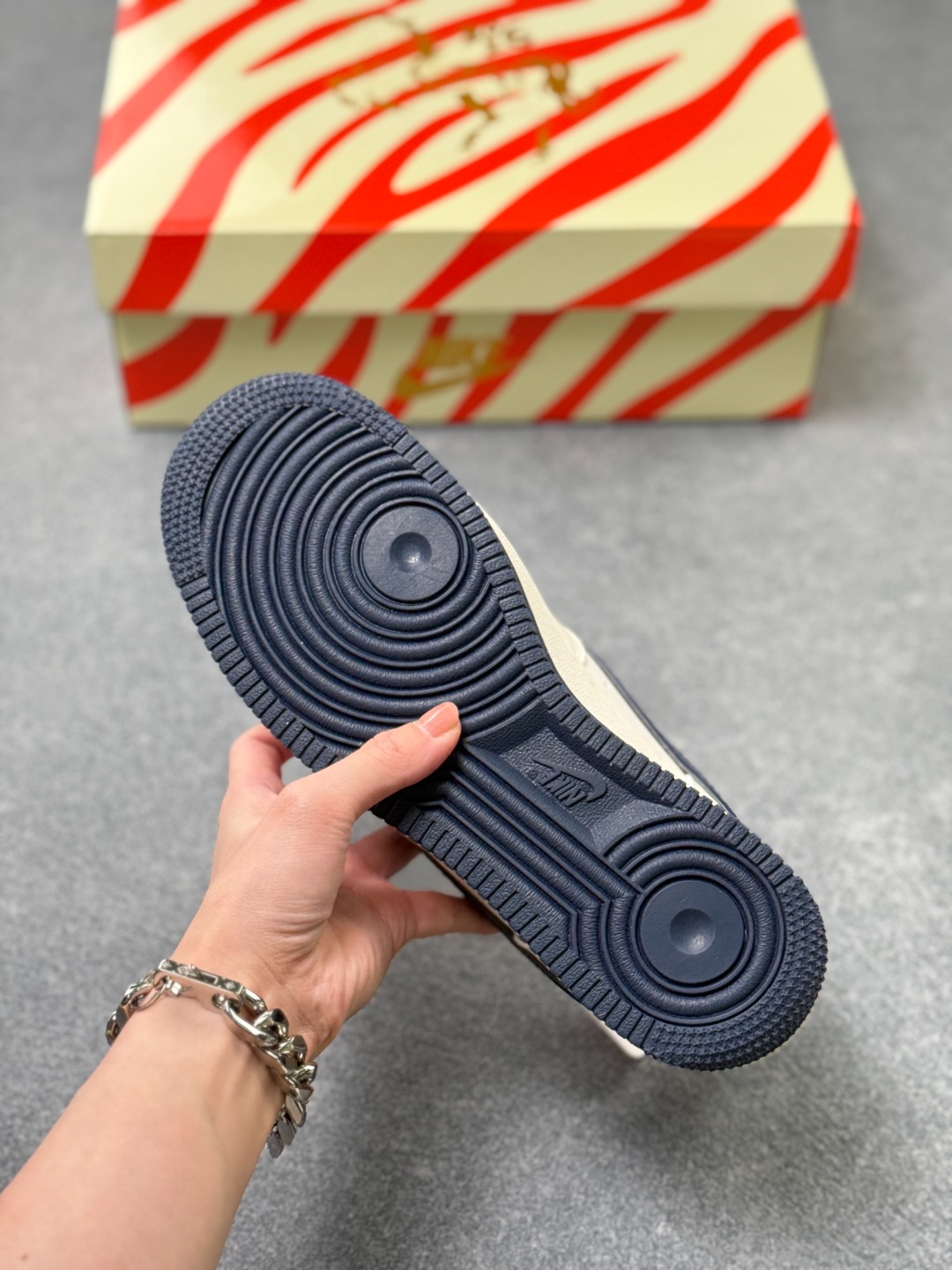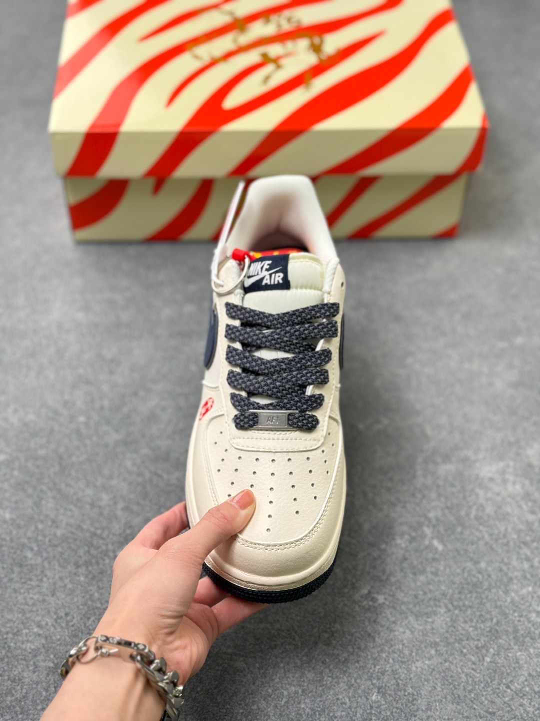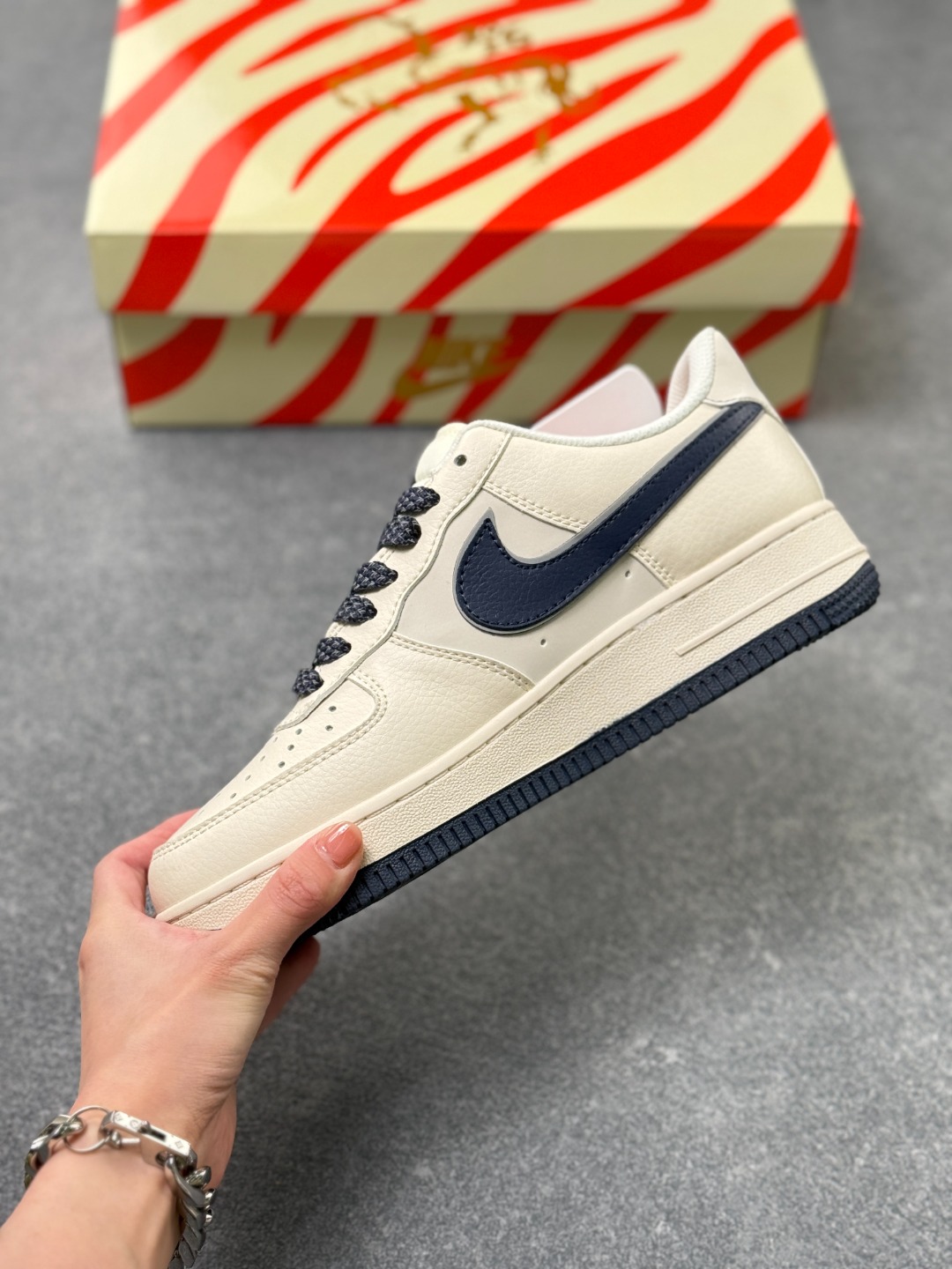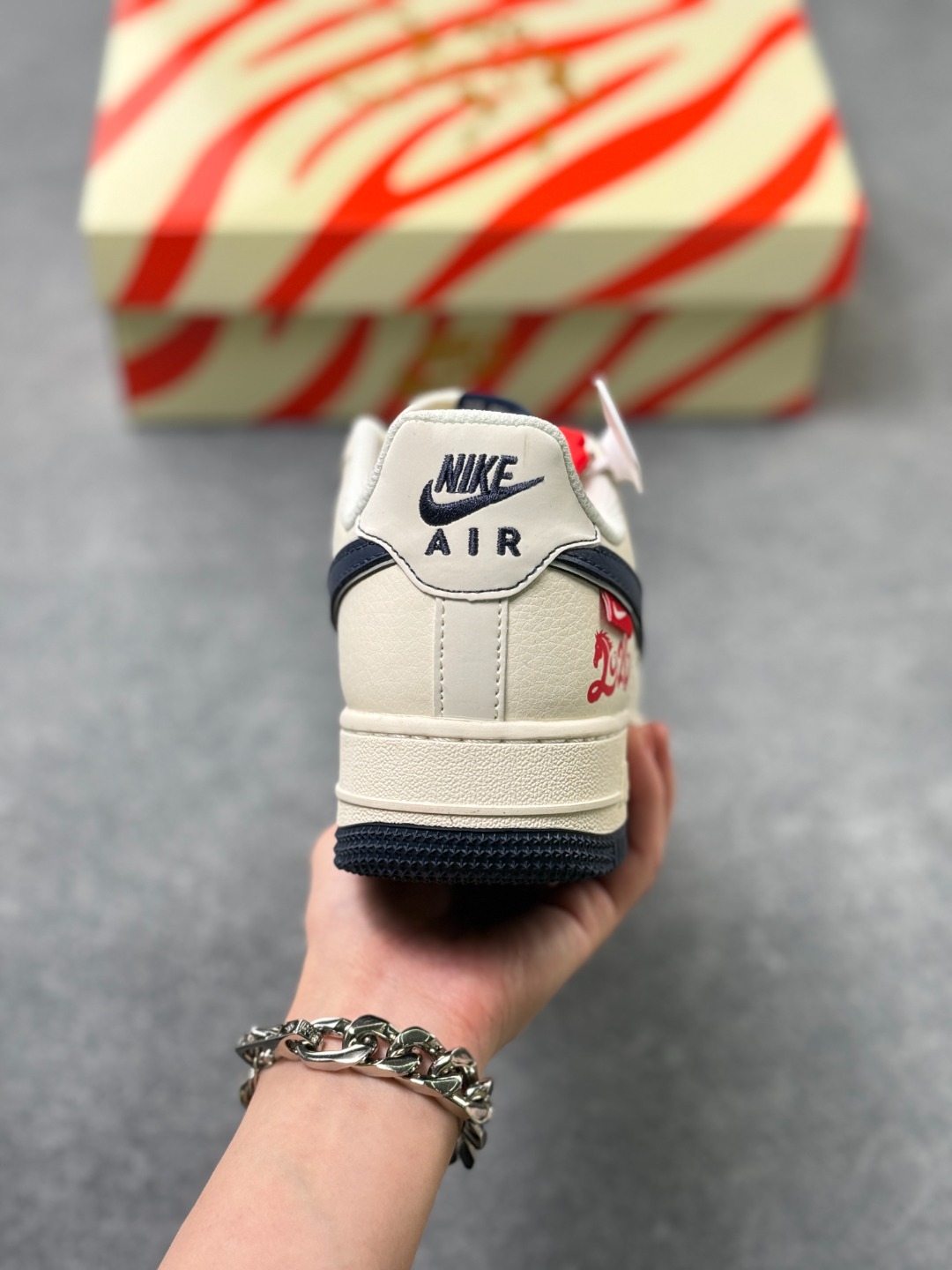 主体采用米白色皮革 搭配藏蓝色Swoosh标志与鞋底 红黑撞色点缀细节 材质延续空军一号经典的荔枝纹皮革 质感扎实