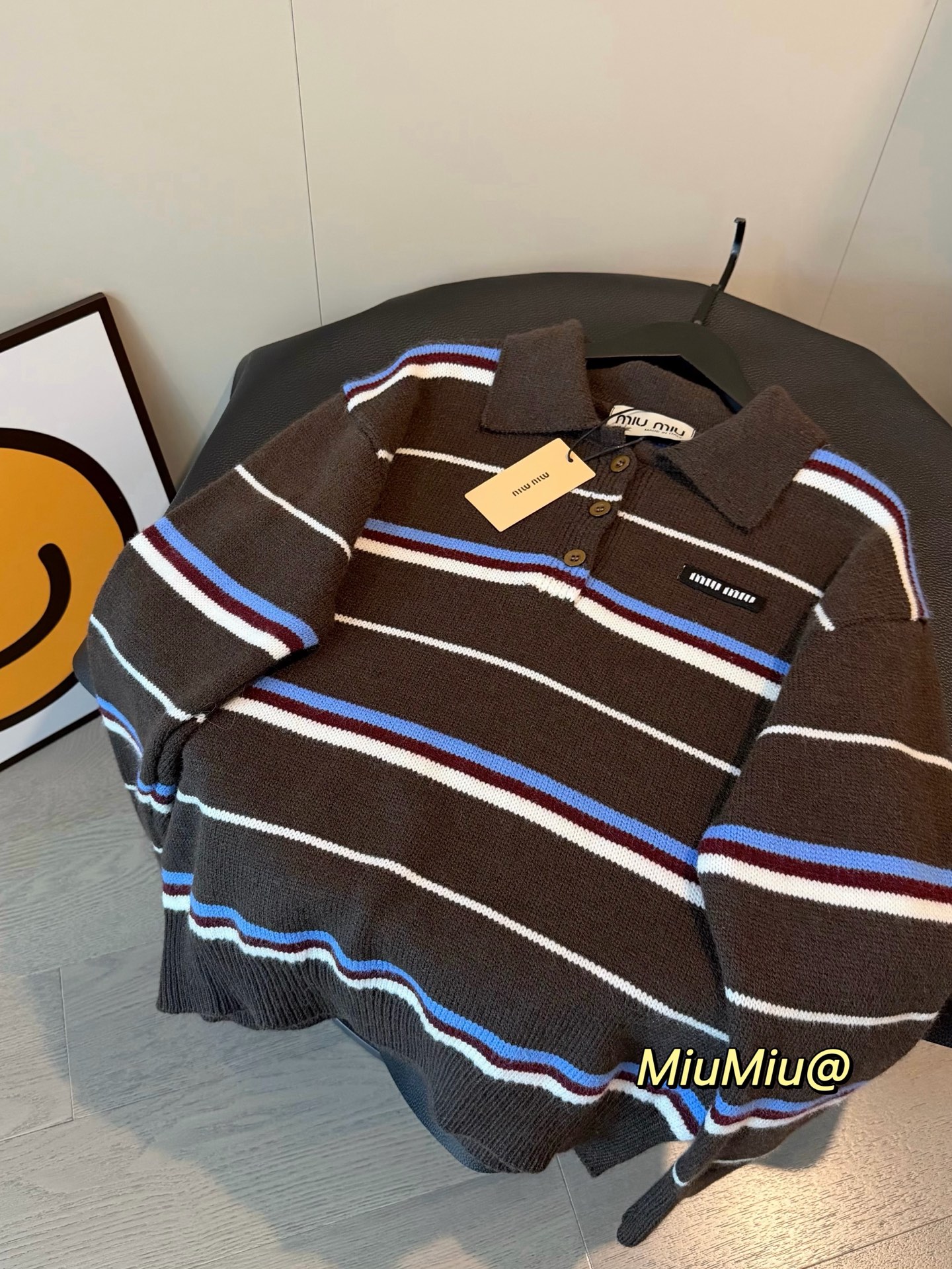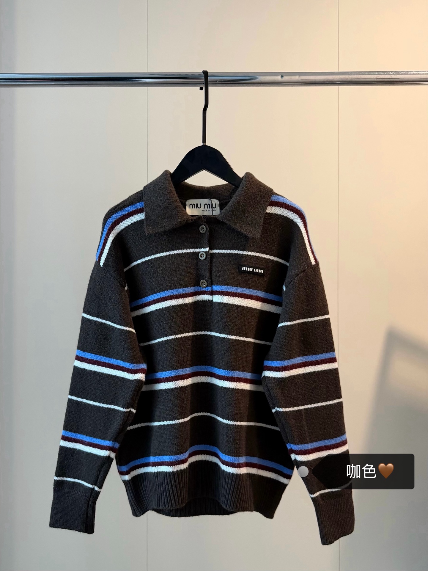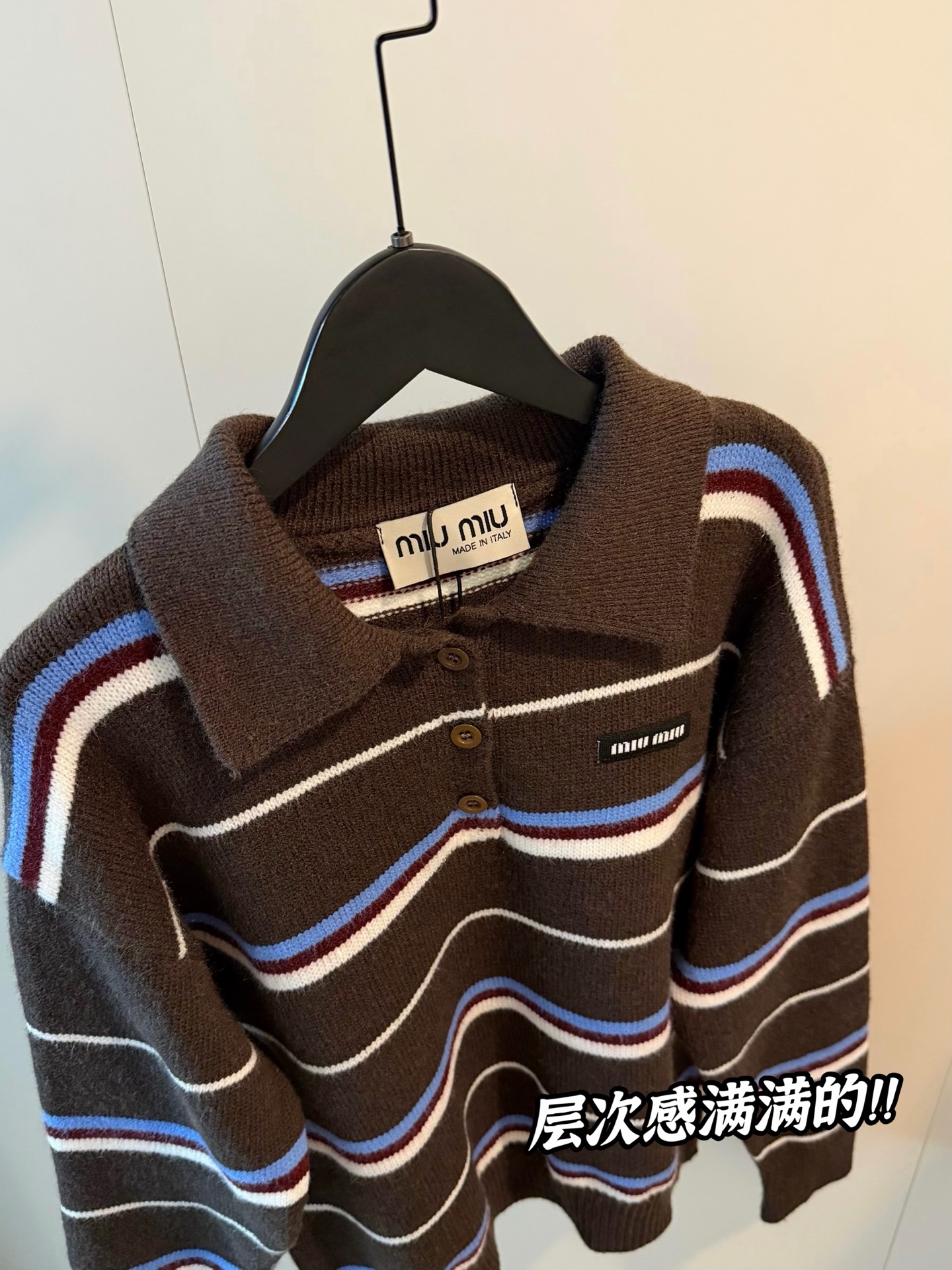 Miumiu缪缪家新款撞色条纹针织翻领polo长袖毛衣
