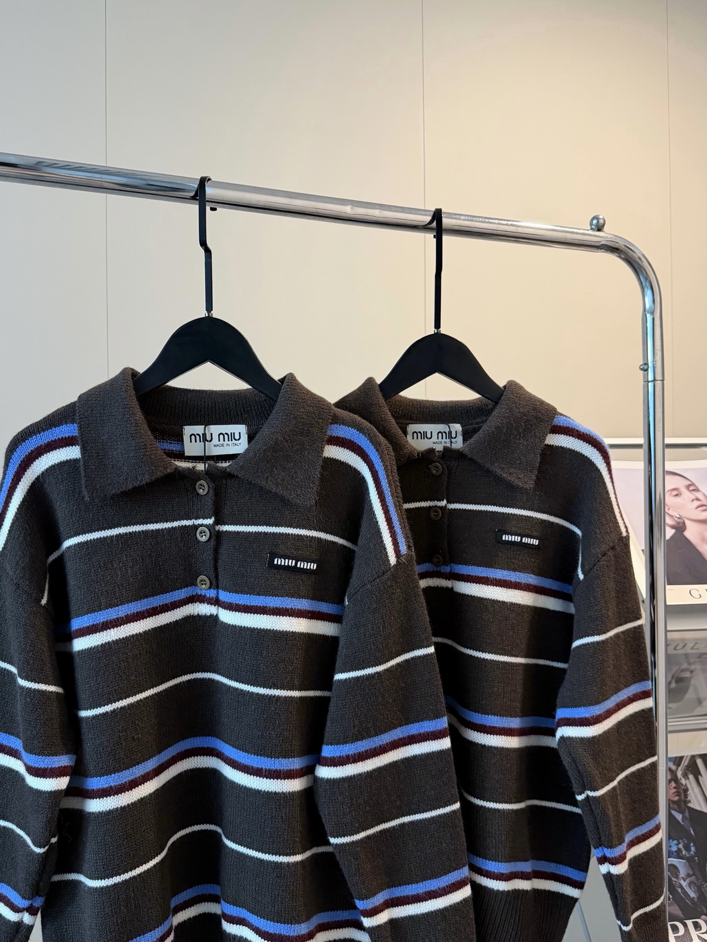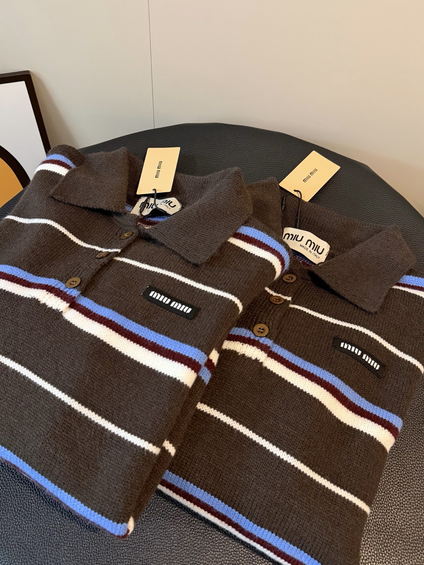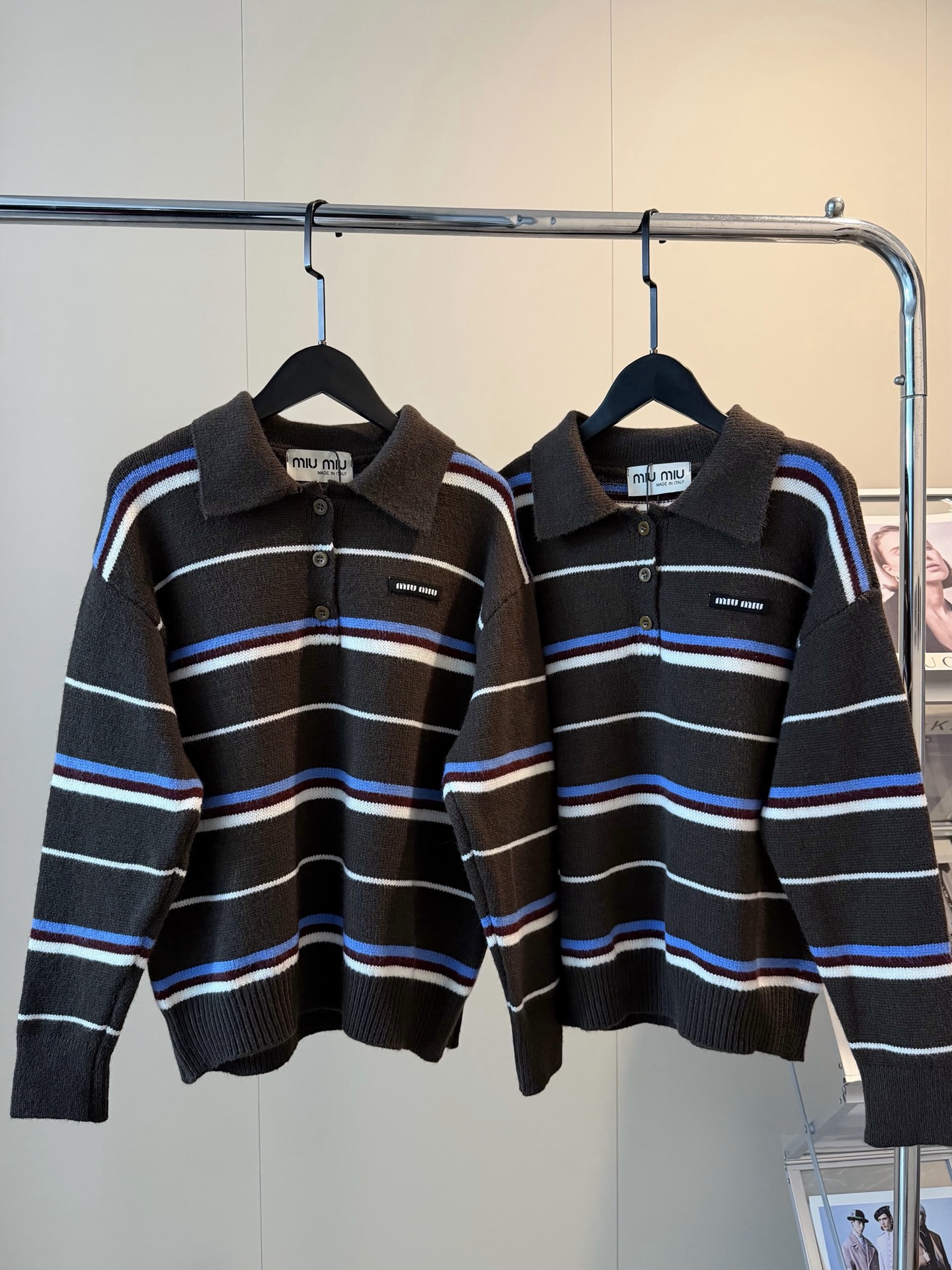 Miumiu缪缪家新款撞色条纹针织翻领polo长袖毛衣