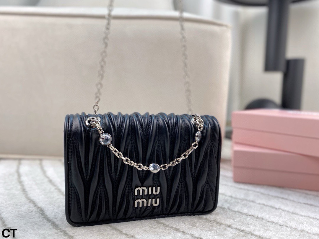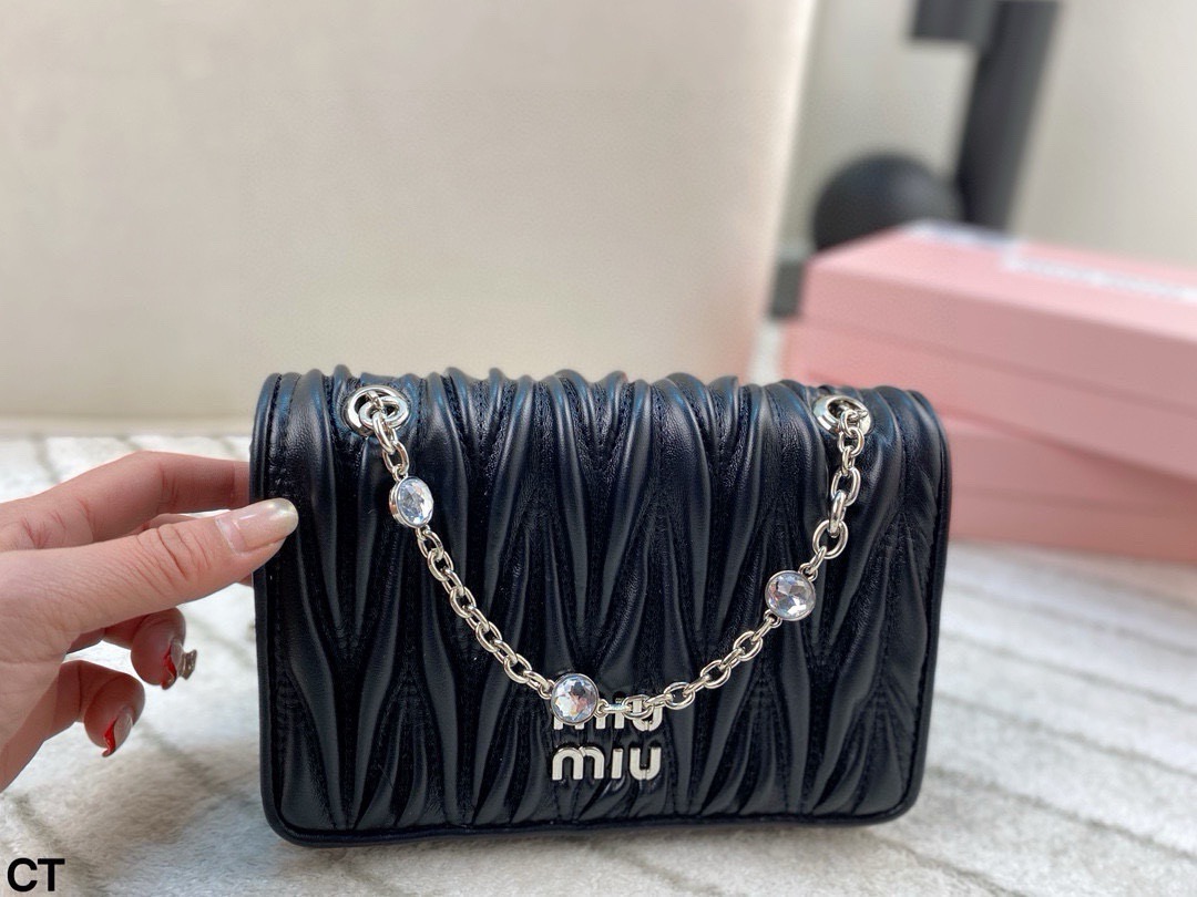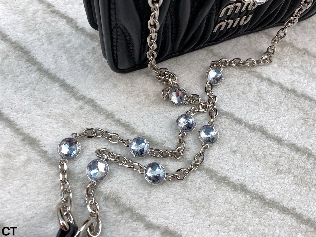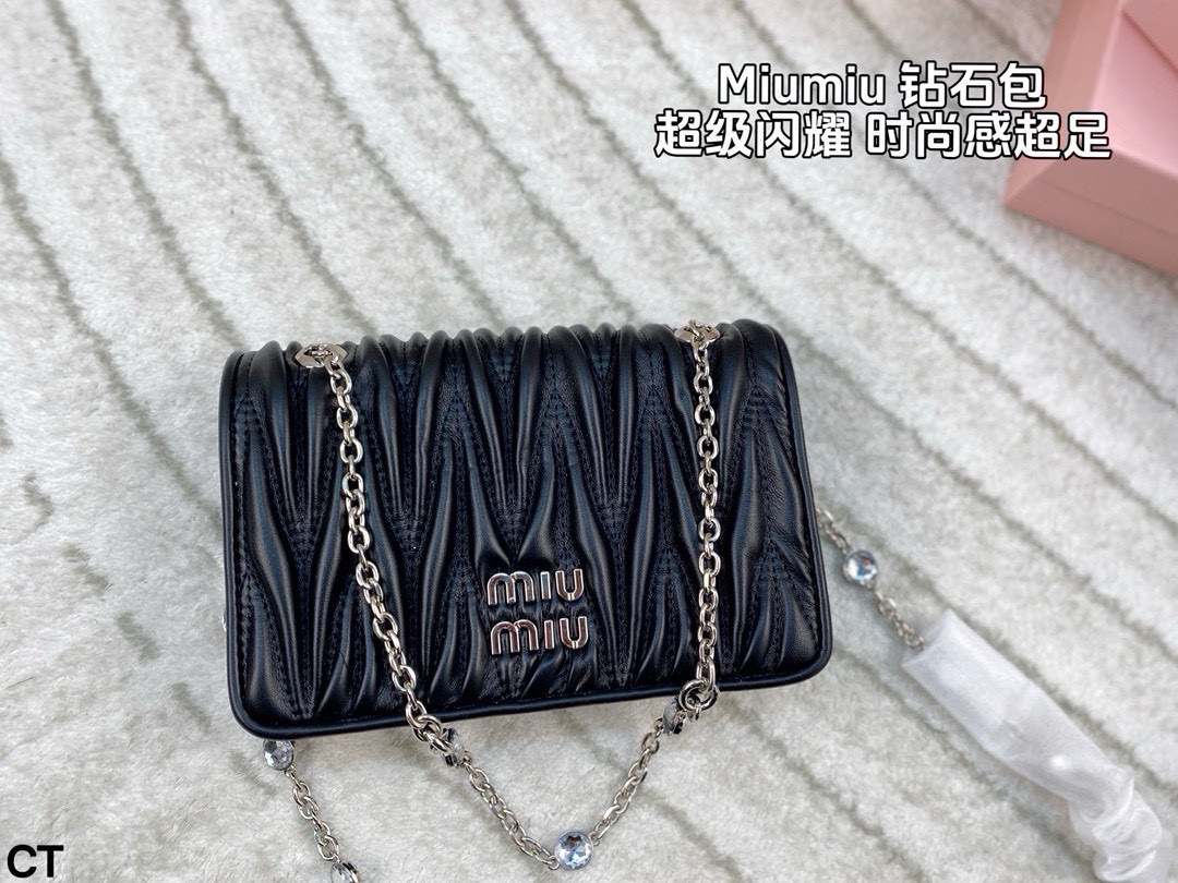 Miumiu钻石斜挎包 大气经典褶皱设计 包型大小适中 线条简约 滑动式金属肩带饰以仿水晶配肩垫 闪耀熠熠光泽 包包轻巧不累赘 翻盖磁扣扣合设计方便使用 并增添时尚感 颇具优雅风范 可搭配比较正式的服装 简约大气 也可以搭配休闲风格 可爱俏皮 亦能搭配有型的风格 时髦有魅力 尺寸 20 13