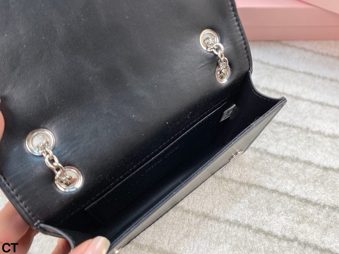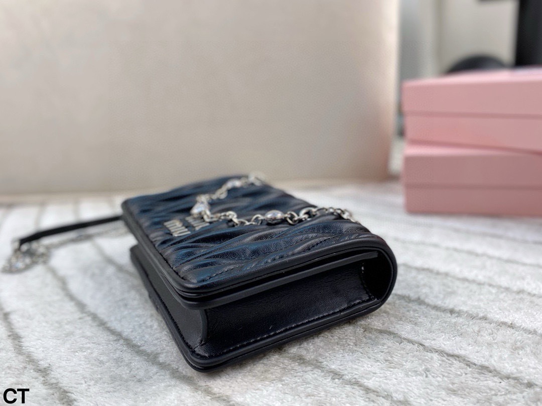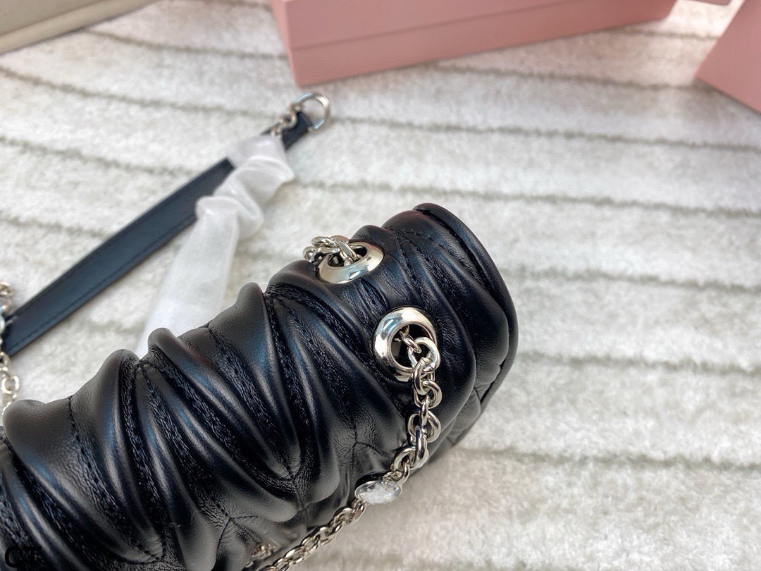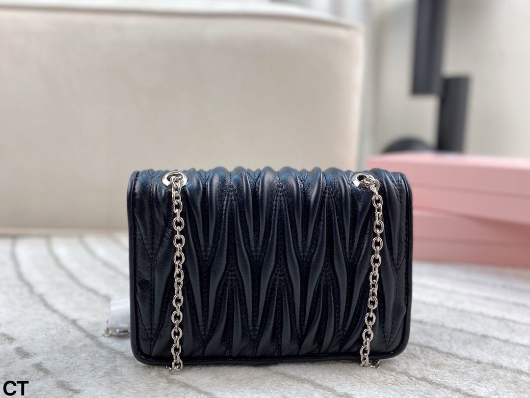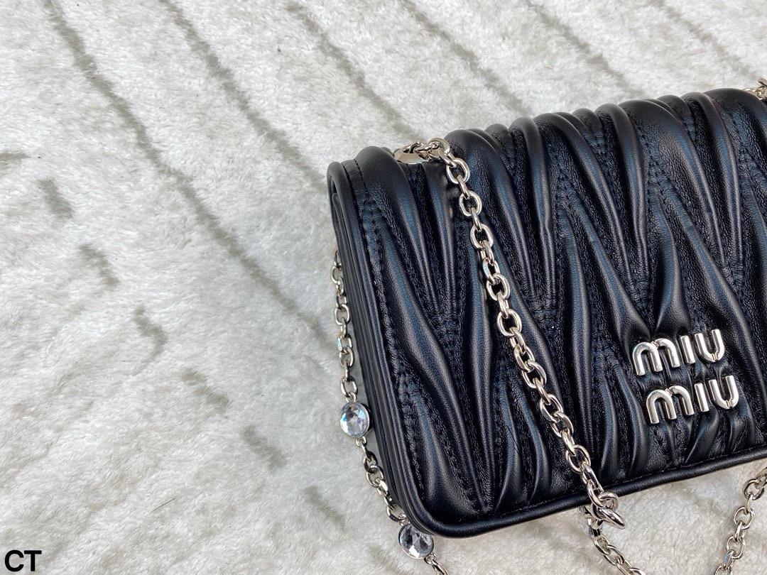 Miumiu钻石斜挎包 大气经典褶皱设计 包型大小适中 线条简约 滑动式金属肩带饰以仿水晶配肩垫 闪耀熠熠光泽 包包轻巧不累赘 翻盖磁扣扣合设计方便使用 并增添时尚感 颇具优雅风范 可搭配比较正式的服装 简约大气 也可以搭配休闲风格 可爱俏皮 亦能搭配有型的风格 时髦有魅力 尺寸 20 13