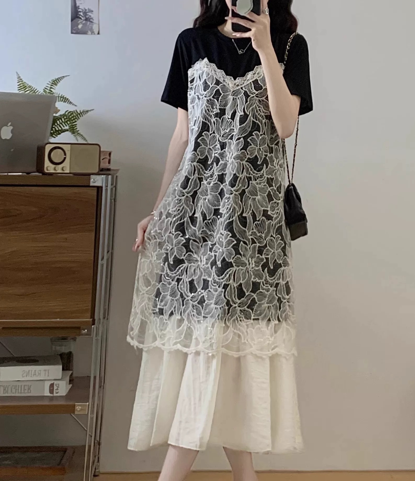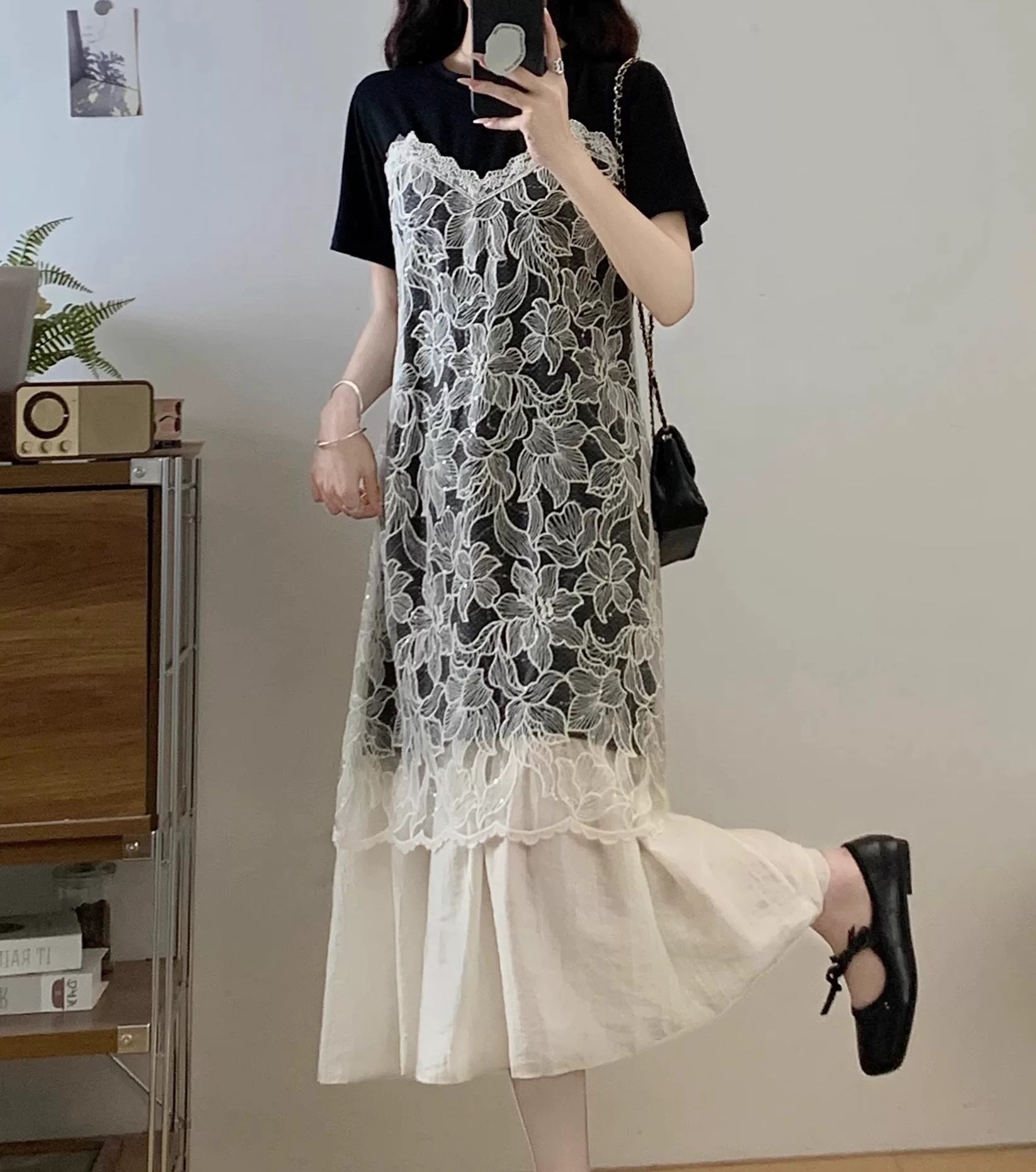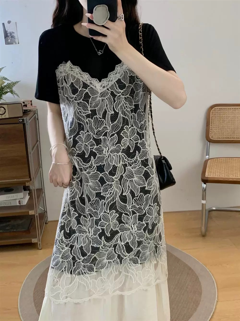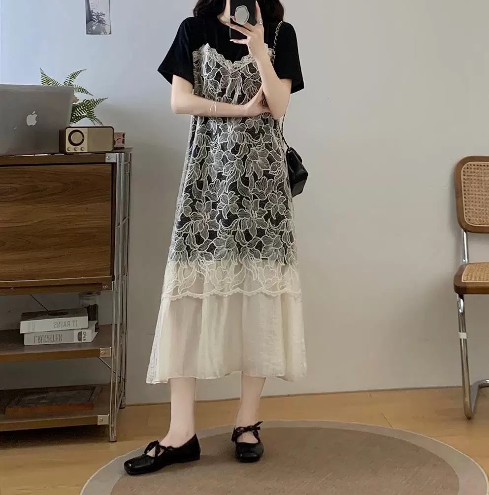 批 法式蕾丝吊带裙叠穿正肩连衣裙2026夏季新款假两件t恤裙 黑与白的温柔碰撞 蕾丝是藏在细节里的浪漫