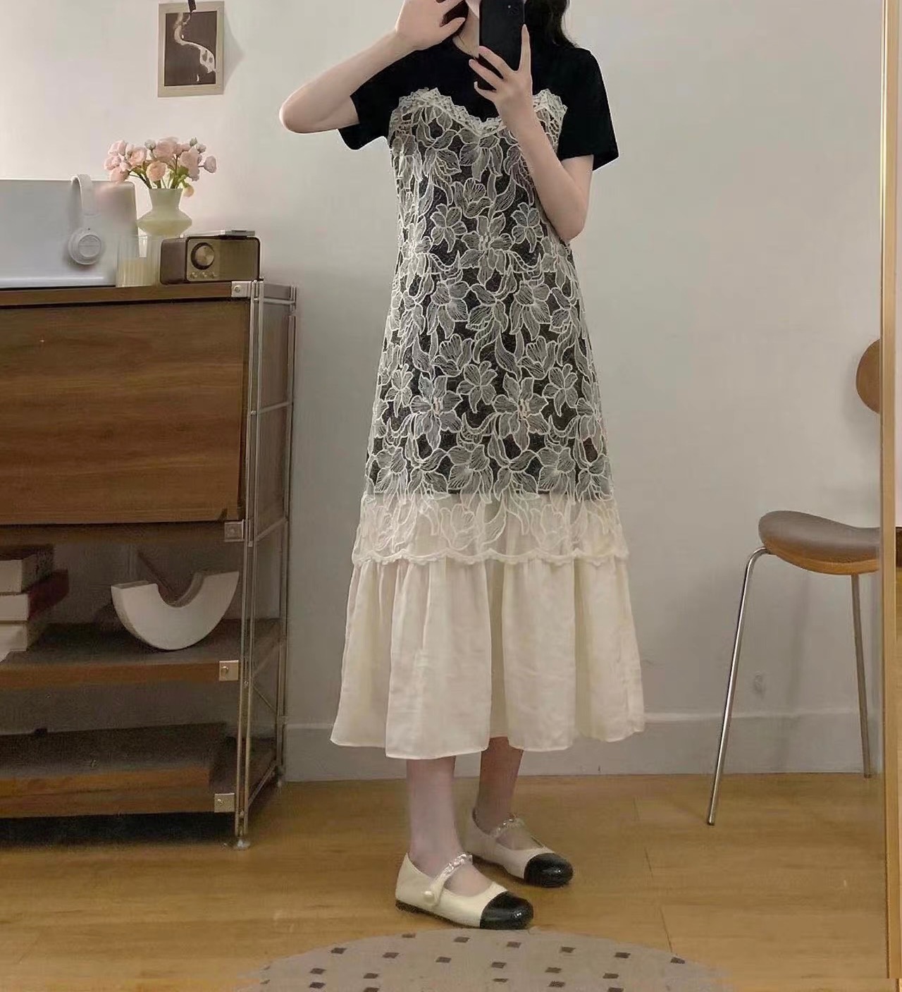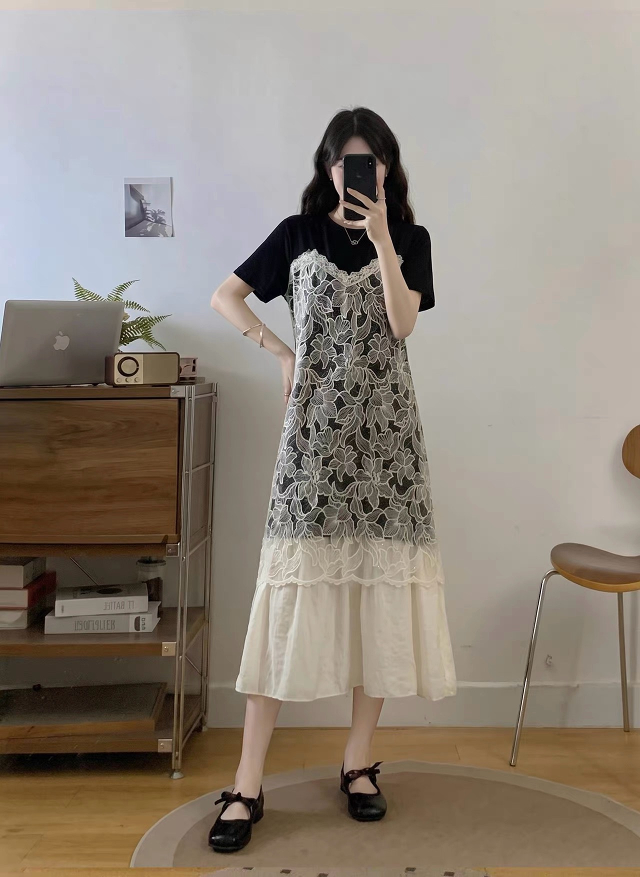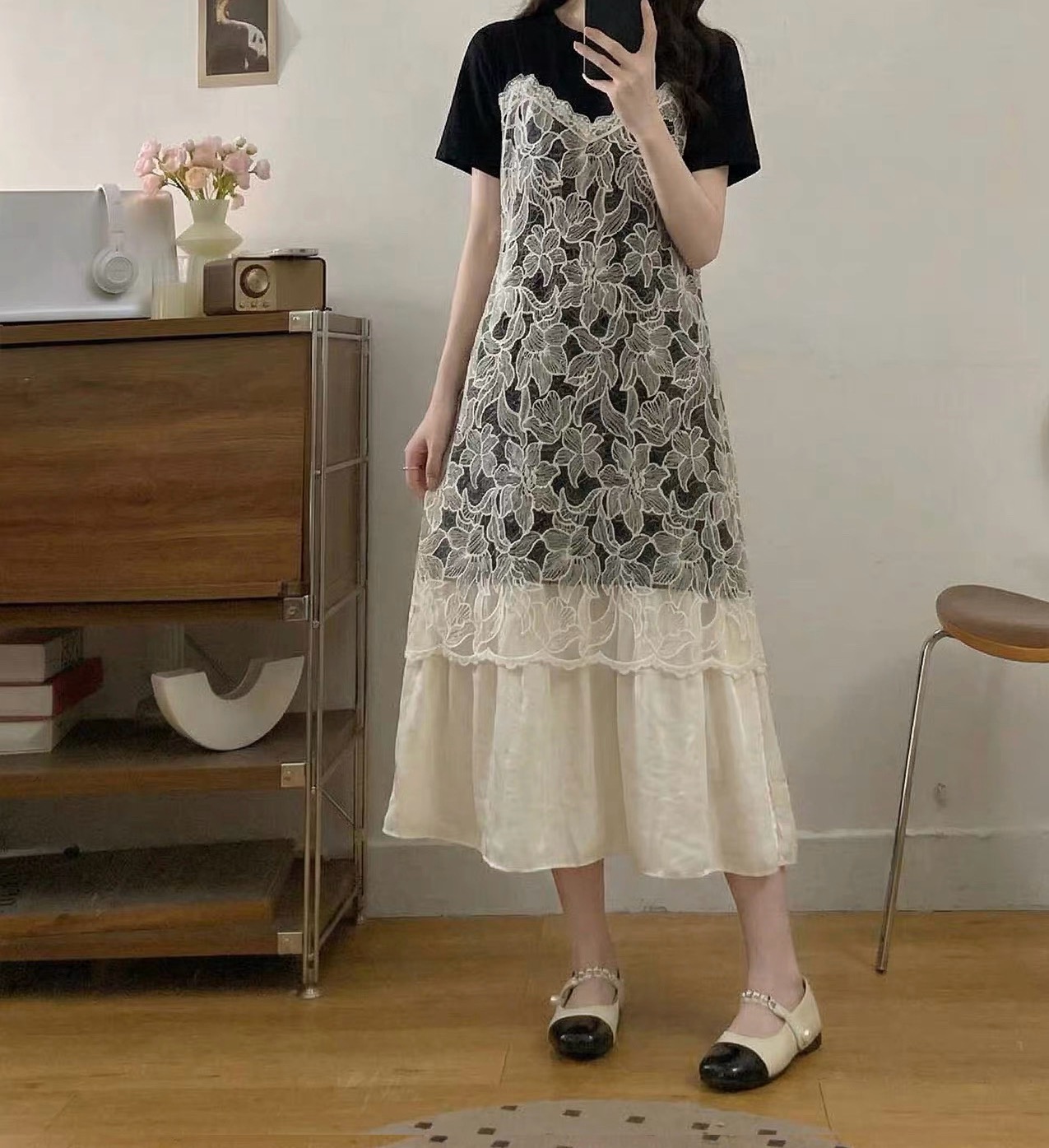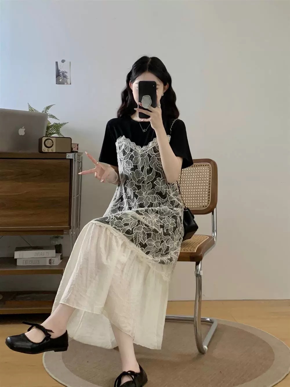 假两件设计太懂女生了 上半部分像件软乎乎的T恤 藏肉又舒服 中间蕾丝像层温柔滤镜 把腰线悄悄修饰 奶杏色裙摆垂下来 走路都带风