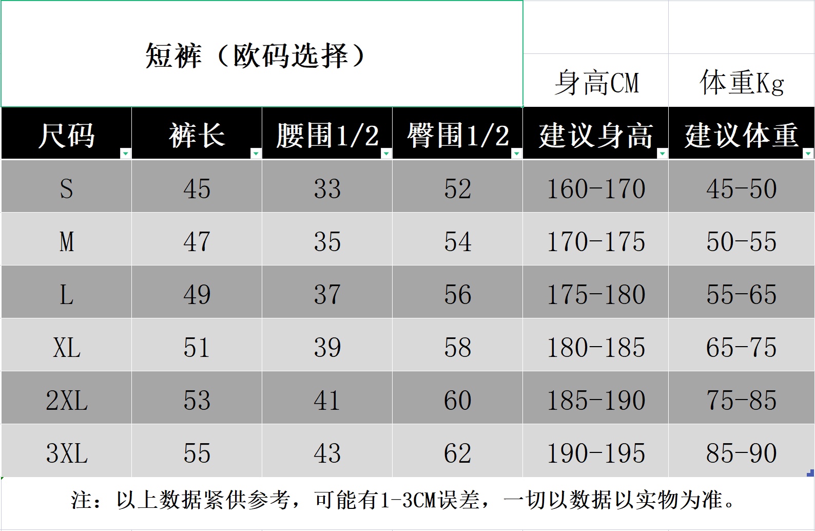 尺码 S 3XL