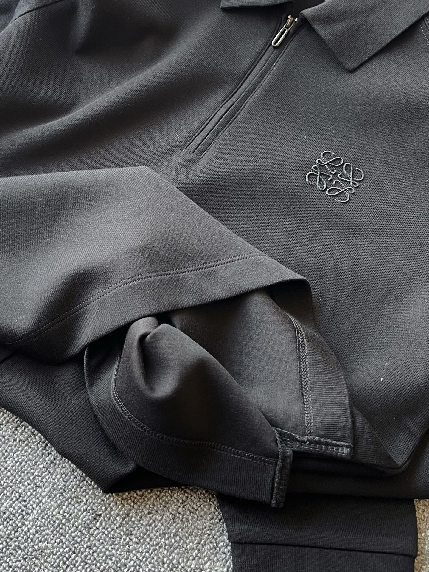 细节细节再细节 Loewe家商场新款卫衣款长袖翻领Polo衫 半拉链设计 非常有味道 YKK代工哑光烤漆金属拉手袢 胸前3D立体浮雕罗意威硅胶小标 表层做了激光浮雕工艺 十分精致 双肩下方做了拼接以及双针压线 高端设计
