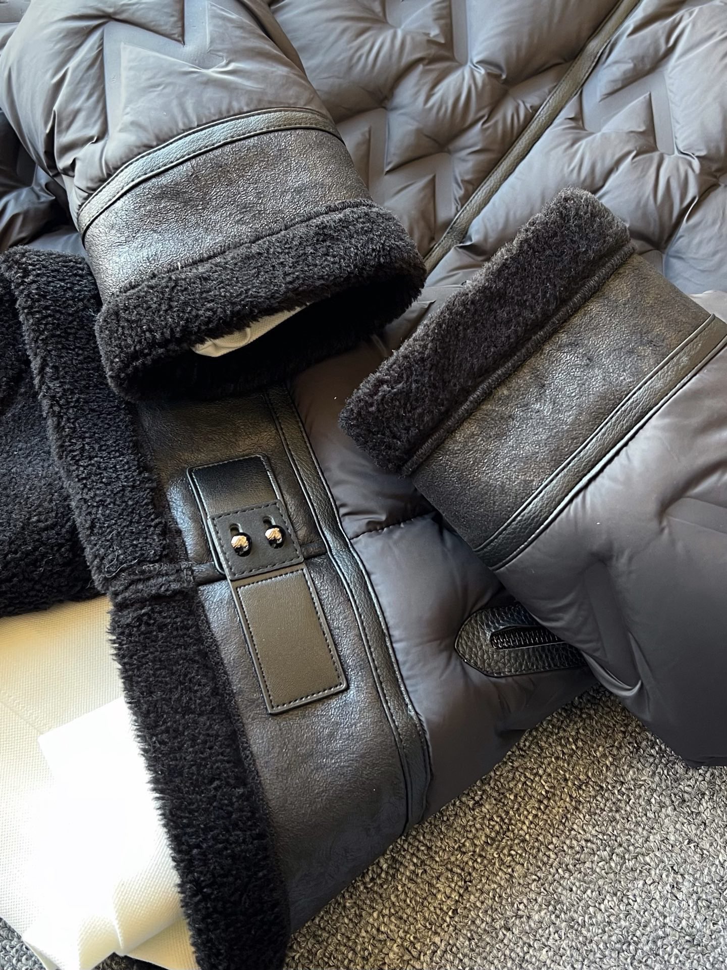 细节细节再细节 Gucci家商场新款机车绵羊毛翻领羽绒服 设计师精工切割条分仓锁绒工艺 极具设计感的视觉效果 Gucci双G浮雕金属拉链 多处拼接皮设计 做工极为复杂 后背做了纵向皮质压线 更加贴合后背增强立体质感 机车羽绒服中的天花板