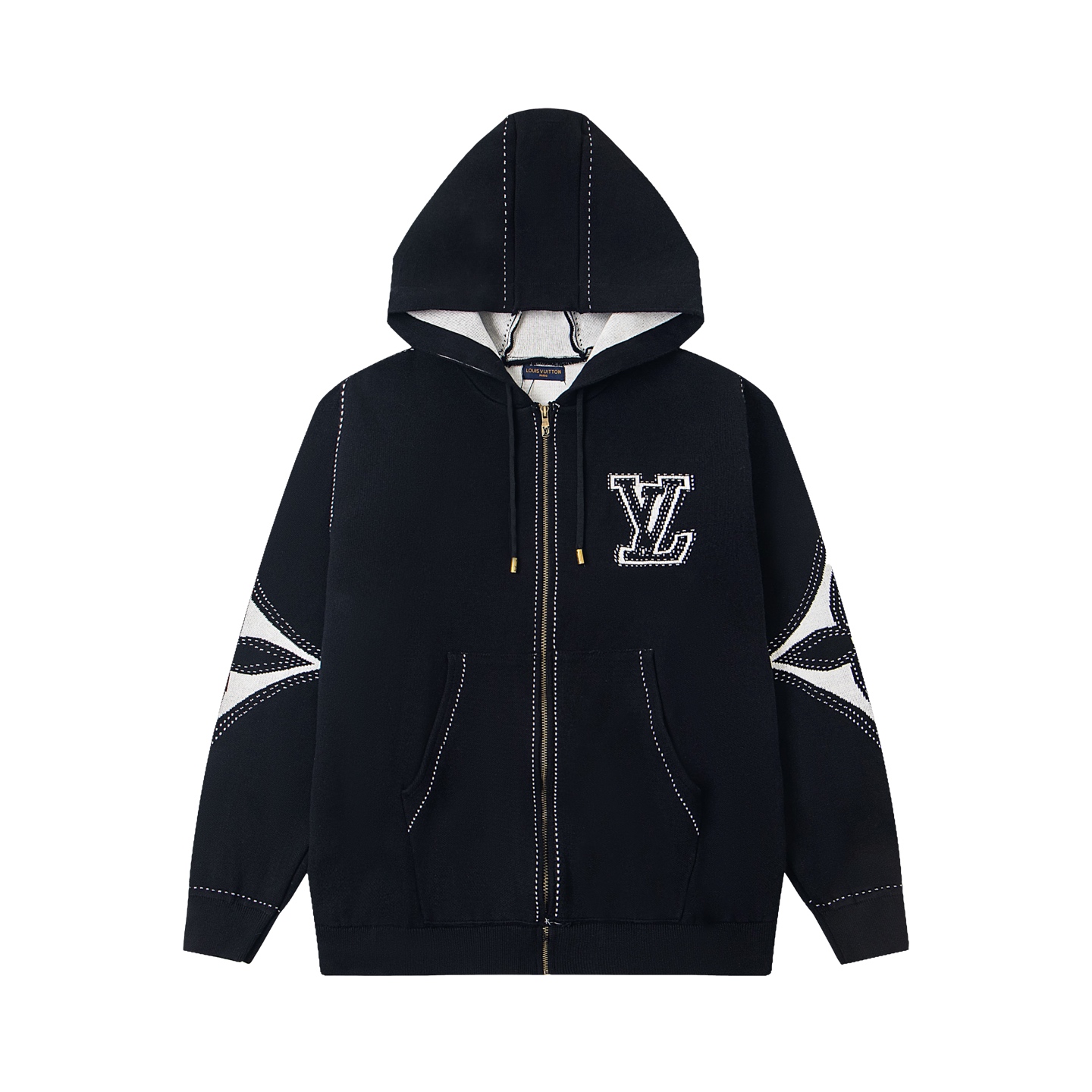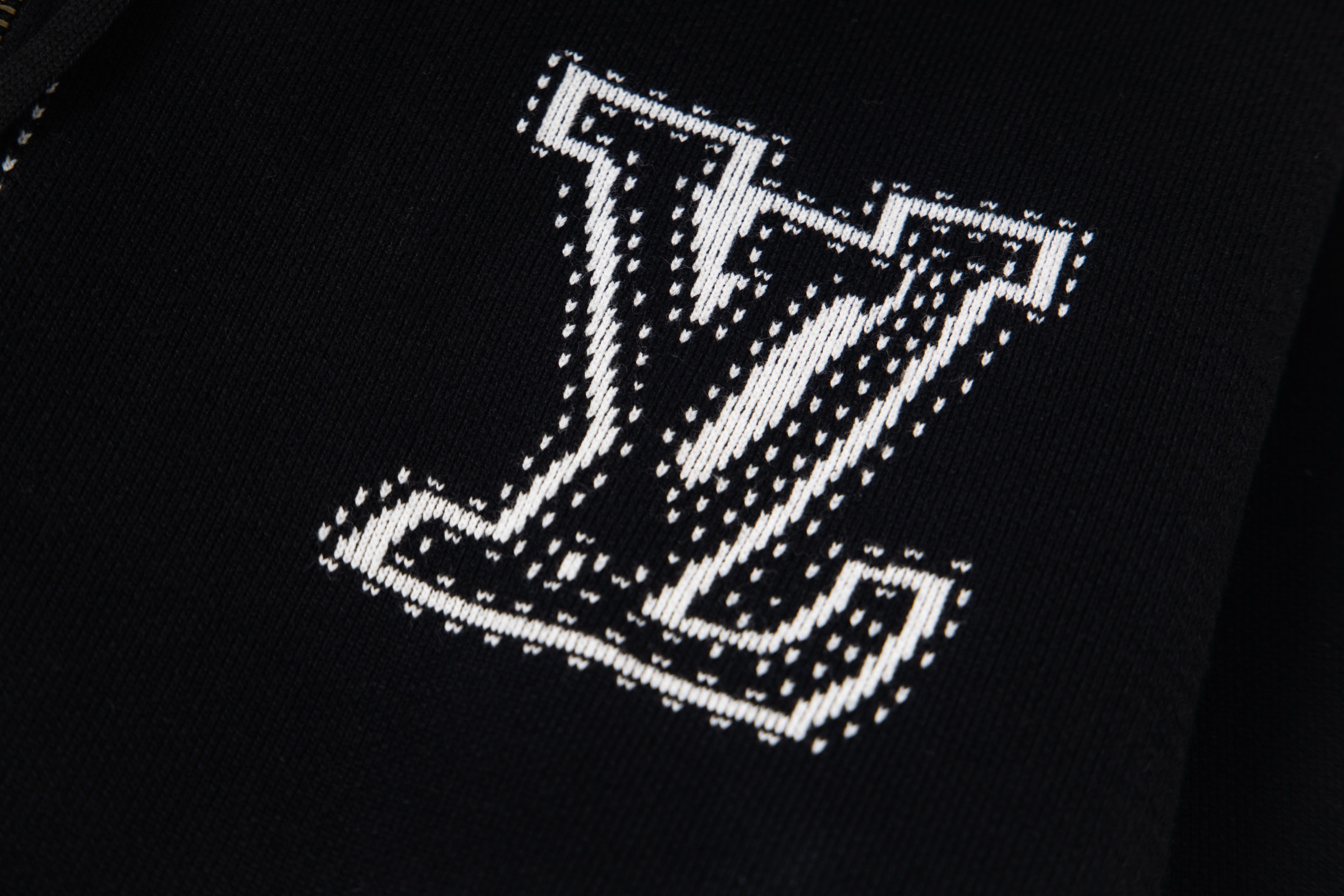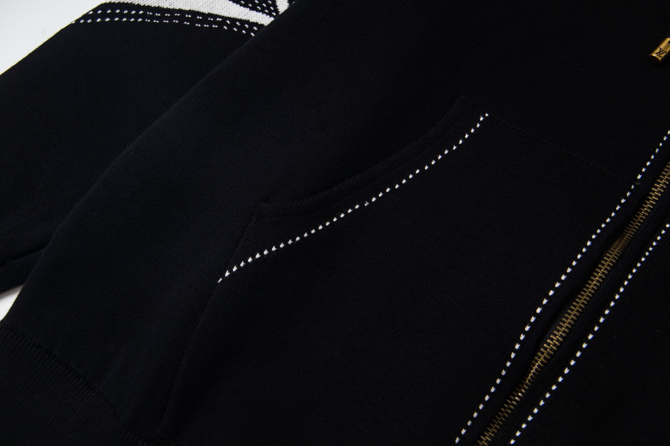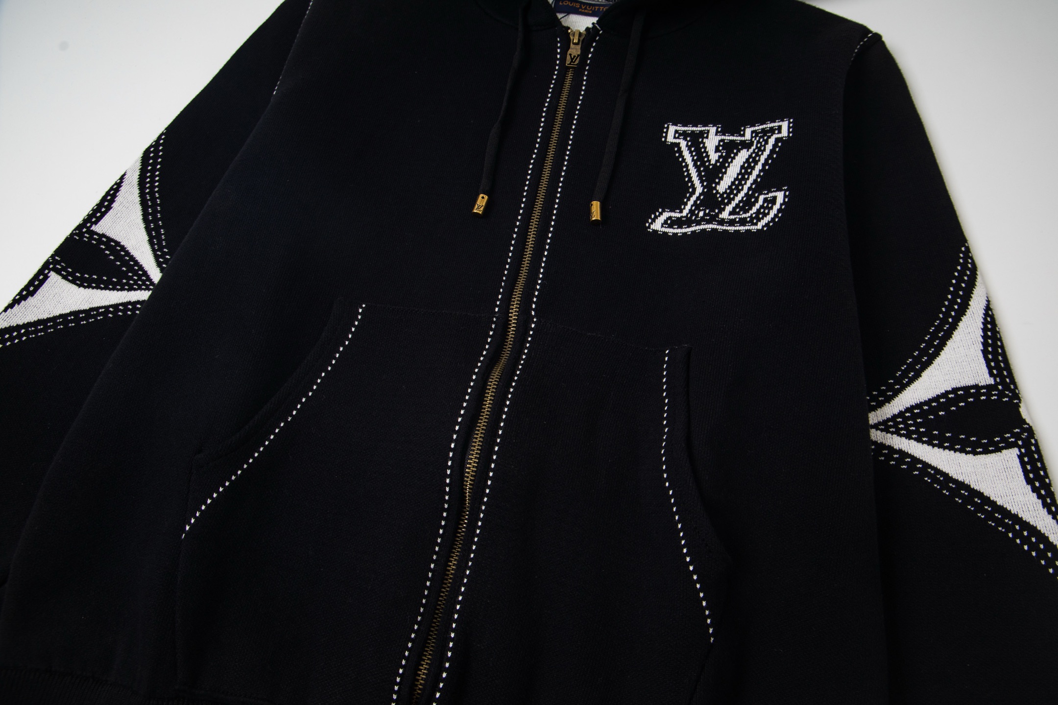 LV超高版本 克重拉满 很高级很顶的滑雪版本 设计感很强的一款 拉链针织羊毛连帽为轻盈廓形融入繁复嵌花织纹 于正面和肘部呈现 数械裏针 monogram嵌花花卉图案散发迷人时尚魅力黑白拼色体现完美撞色设计