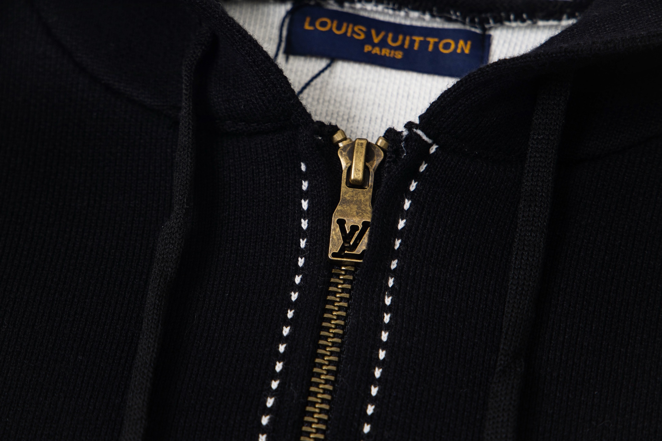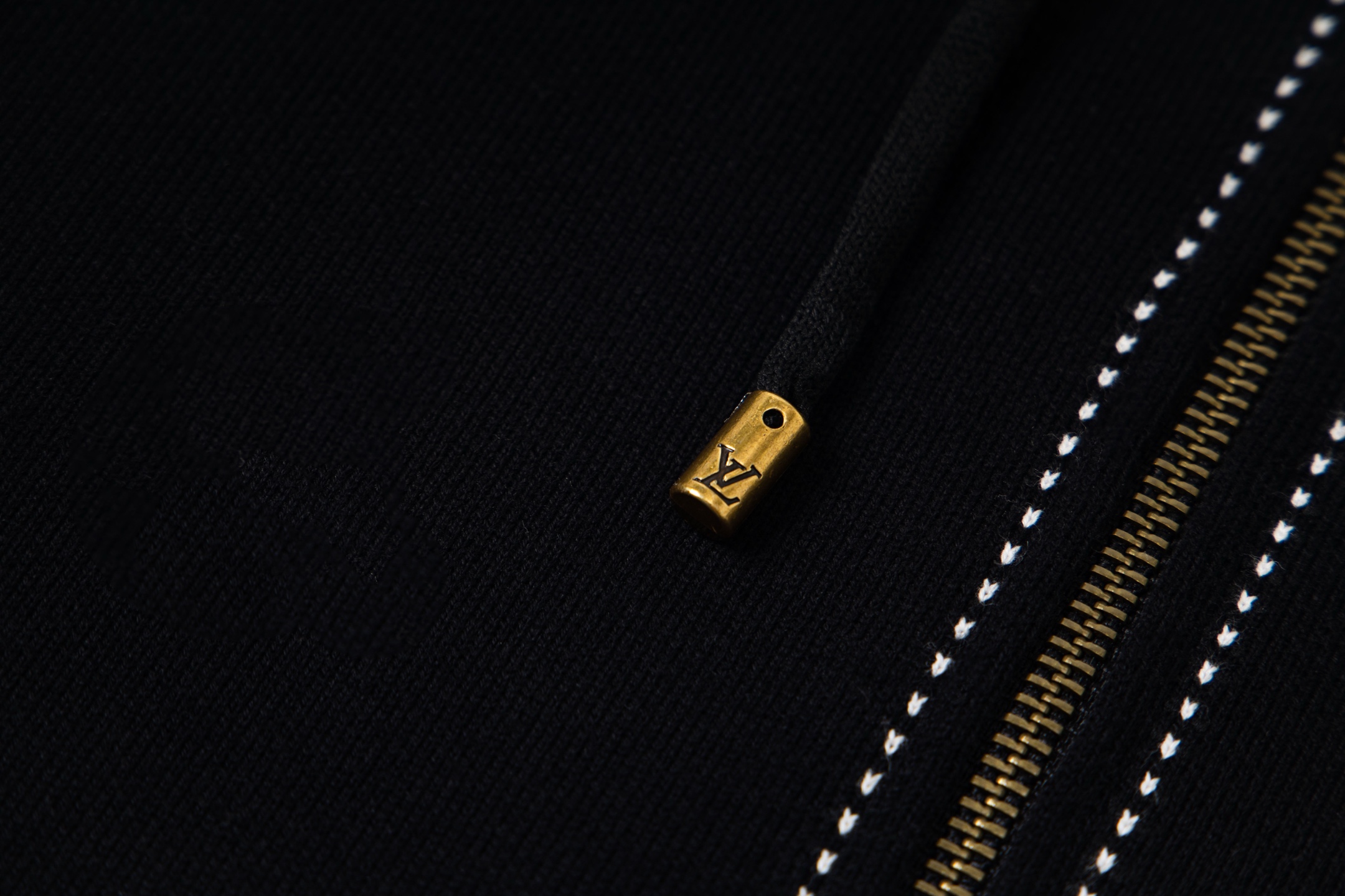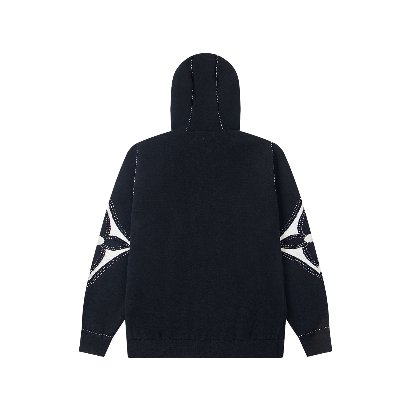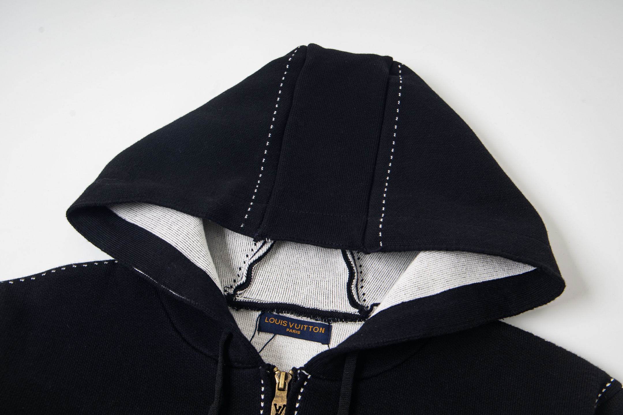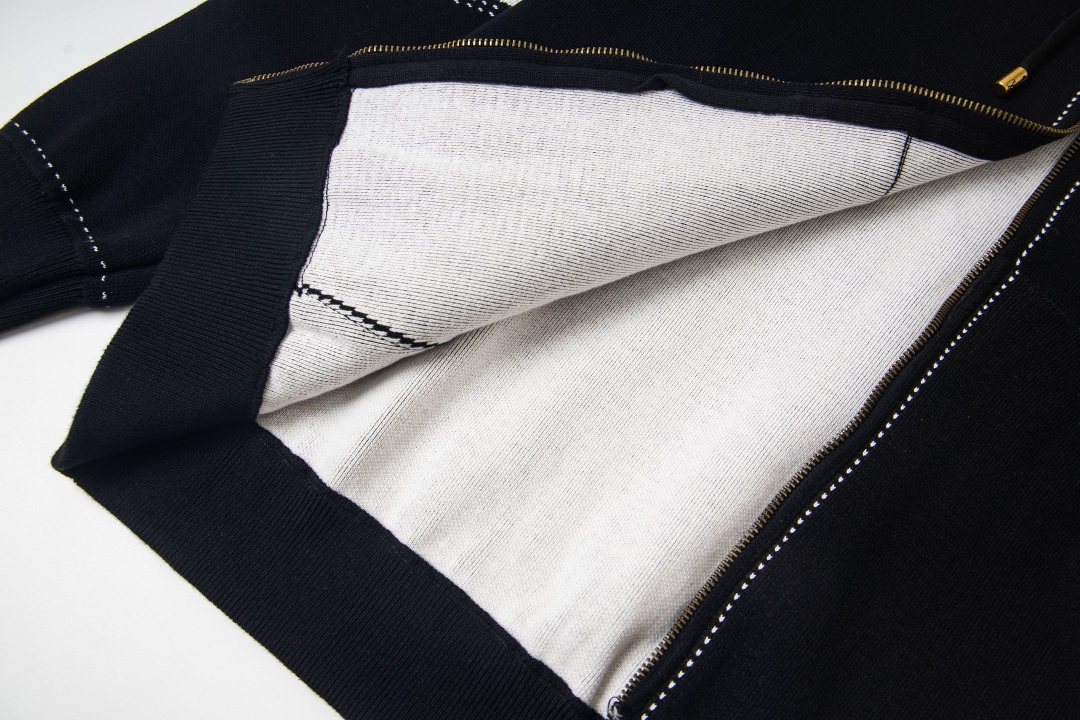 LV超高版本 克重拉满 很高级很顶的滑雪版本 设计感很强的一款 拉链针织羊毛连帽为轻盈廓形融入繁复嵌花织纹 于正面和肘部呈现 数械裏针 monogram嵌花花卉图案散发迷人时尚魅力黑白拼色体现完美撞色设计