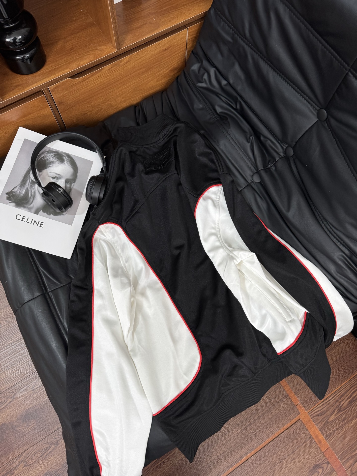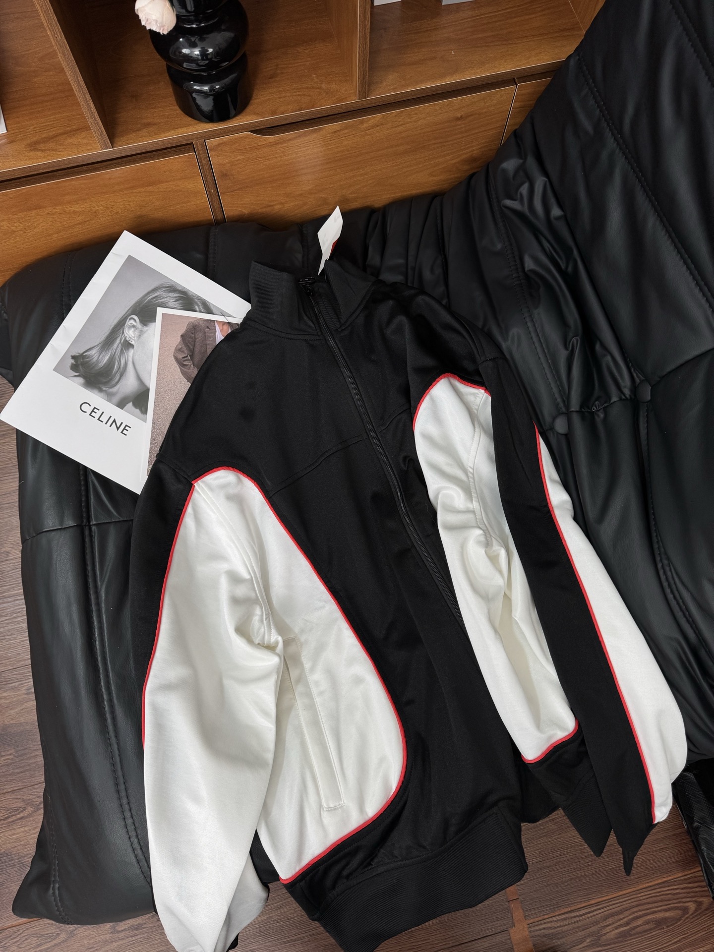 黑白红的颜色比较经典好搭配也完全适配这样的单品类型朴宰范穿了之后人气暴涨 短款版型设计更加显高显身材 确实很凹造型