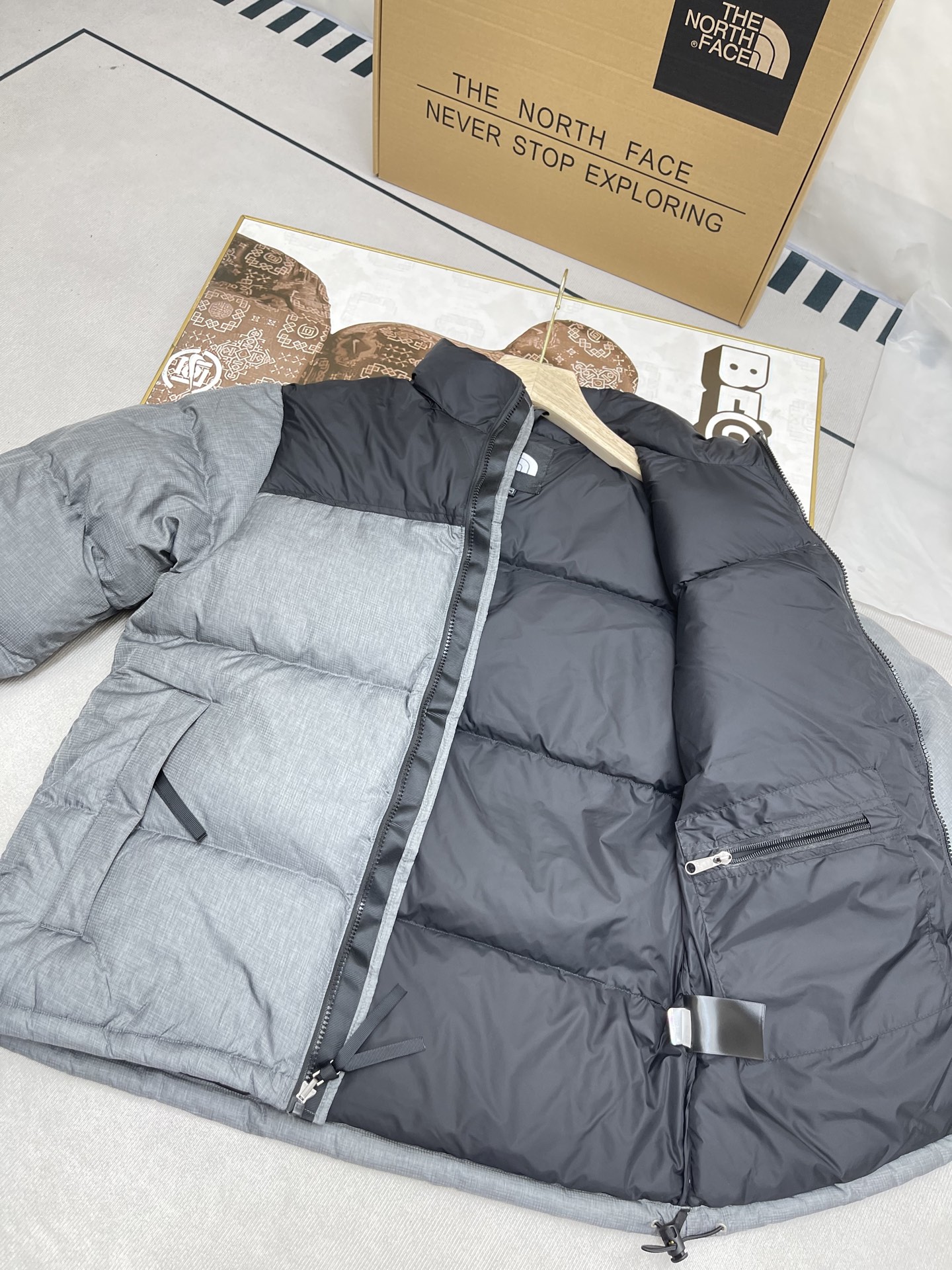 原厂定制40D格子四级防水布料 独家采用原版一致单层布料做法 非市面通货内加胆布 采用单层布料考验了布料及羽绒必须要达标 防止跑绒 并保证手感及膨松度 内里采用尼龙nylon双重双层封禁设计 不会出现任何跑绒现象 内置抽拉绳扣的可调节下摆 可防风防寒