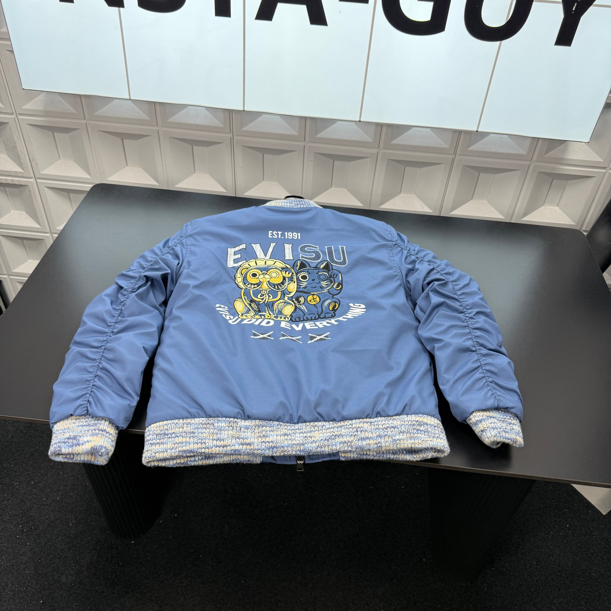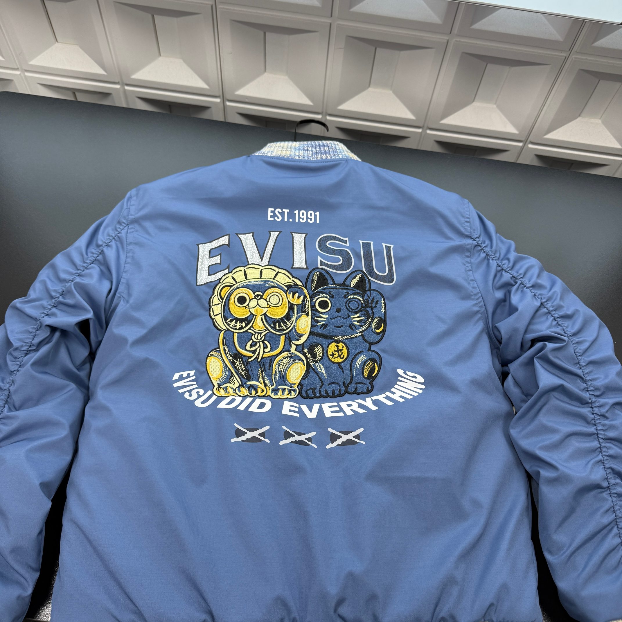 冬季热销爆款网红博主推荐款Evisu福神立领棉服外套 胸前刺绣海鸥Logo 后背满印招财猫图案 三标齐全官网一致 放大看细节原相机实物拍摄 颜色 蓝色 尺码 L 4xl L 80 105斤 XL 105 120斤 2XL 120 140斤 3XL 140 160斤 4XL 160 180斤