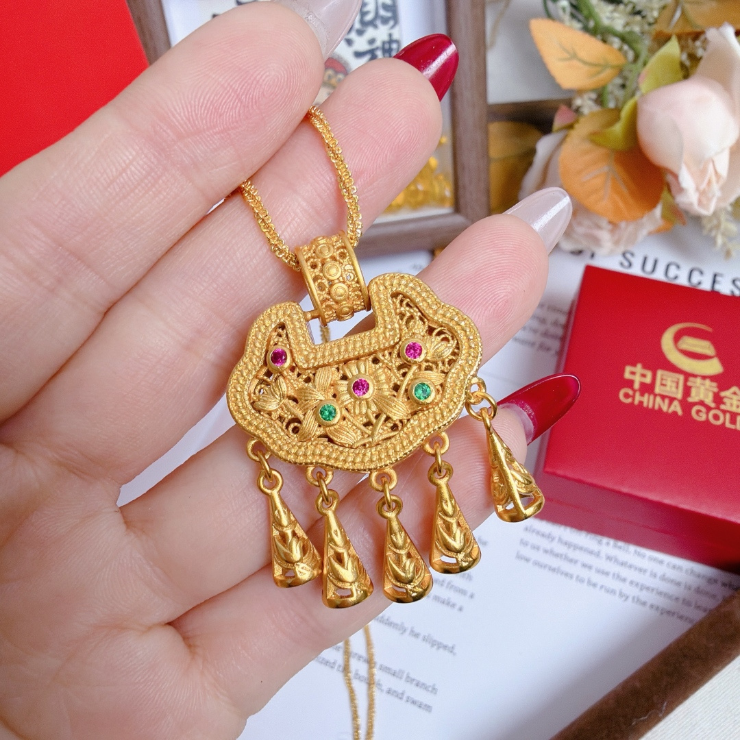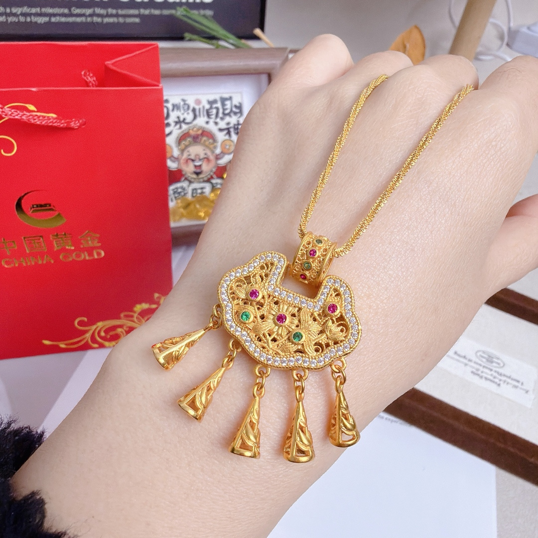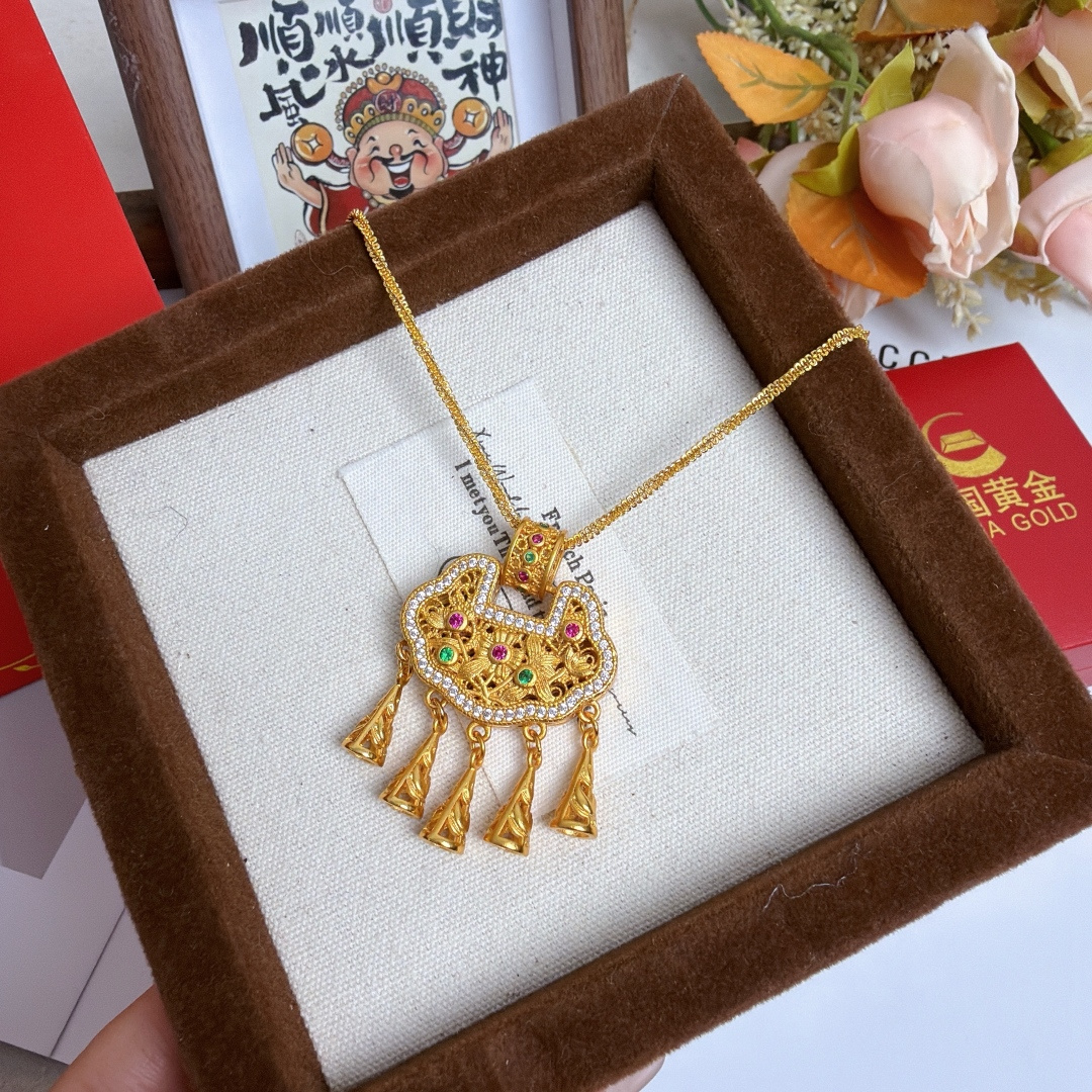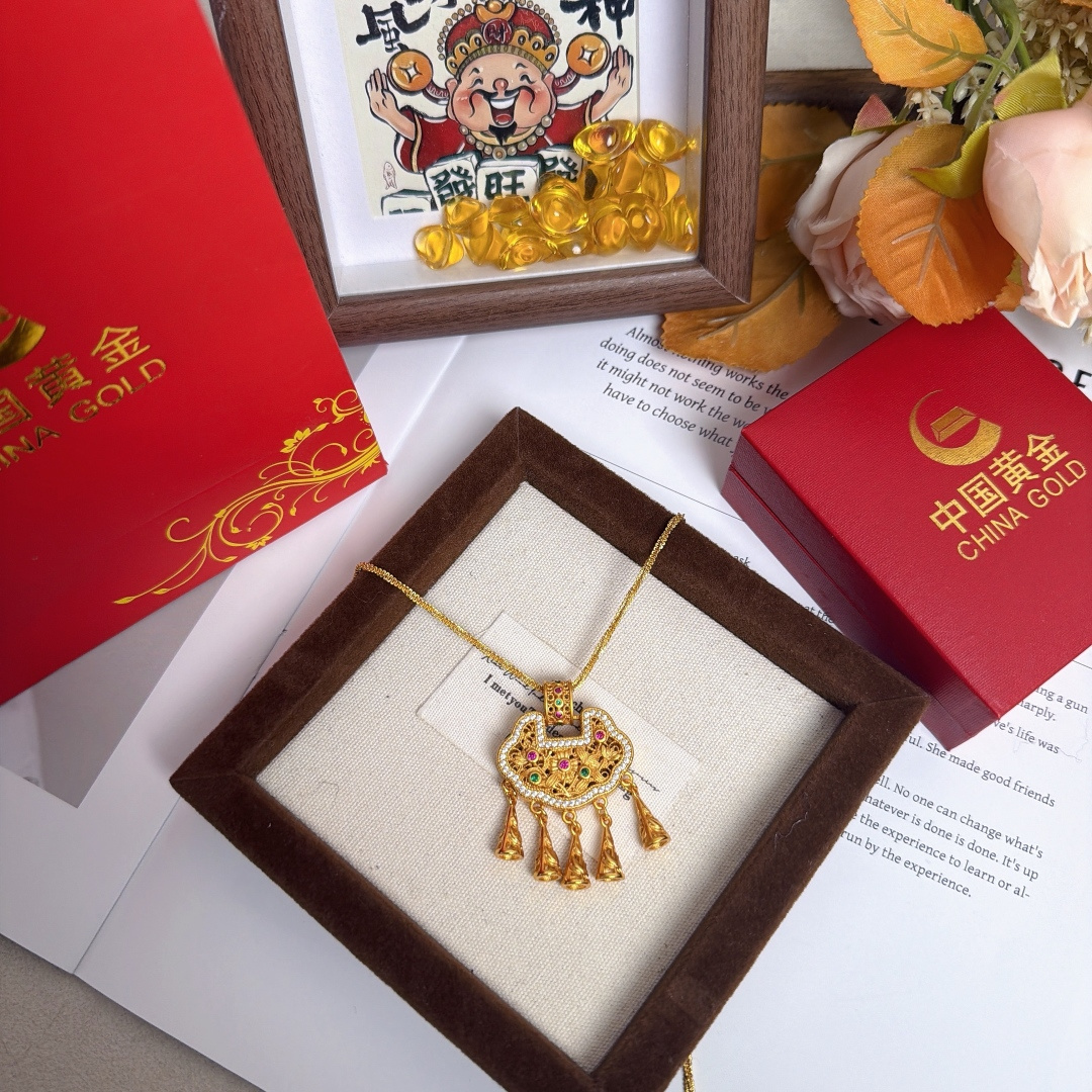 所见所得高品质礼盒全套 中国黄金同款花丝平安锁配万能项链 爆闪加长万能链 链长60cm 这款花丝平安锁项链也太绝了 镂空花丝工艺精致到骨子里 镶钻搭配彩宝点缀 贵气又灵动 流苏坠子晃起来超有氛围感 平安锁寓意岁岁平安 不管是自留戴还是送闺蜜 送女儿当成人礼 都是拿得出手的心意款 黄金保值又好看 闭眼冲不亏