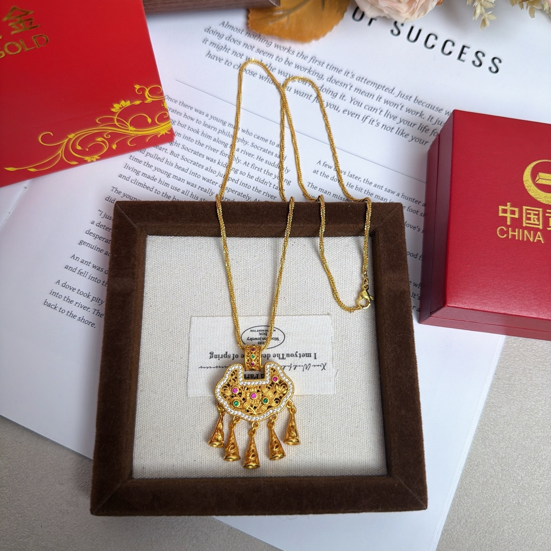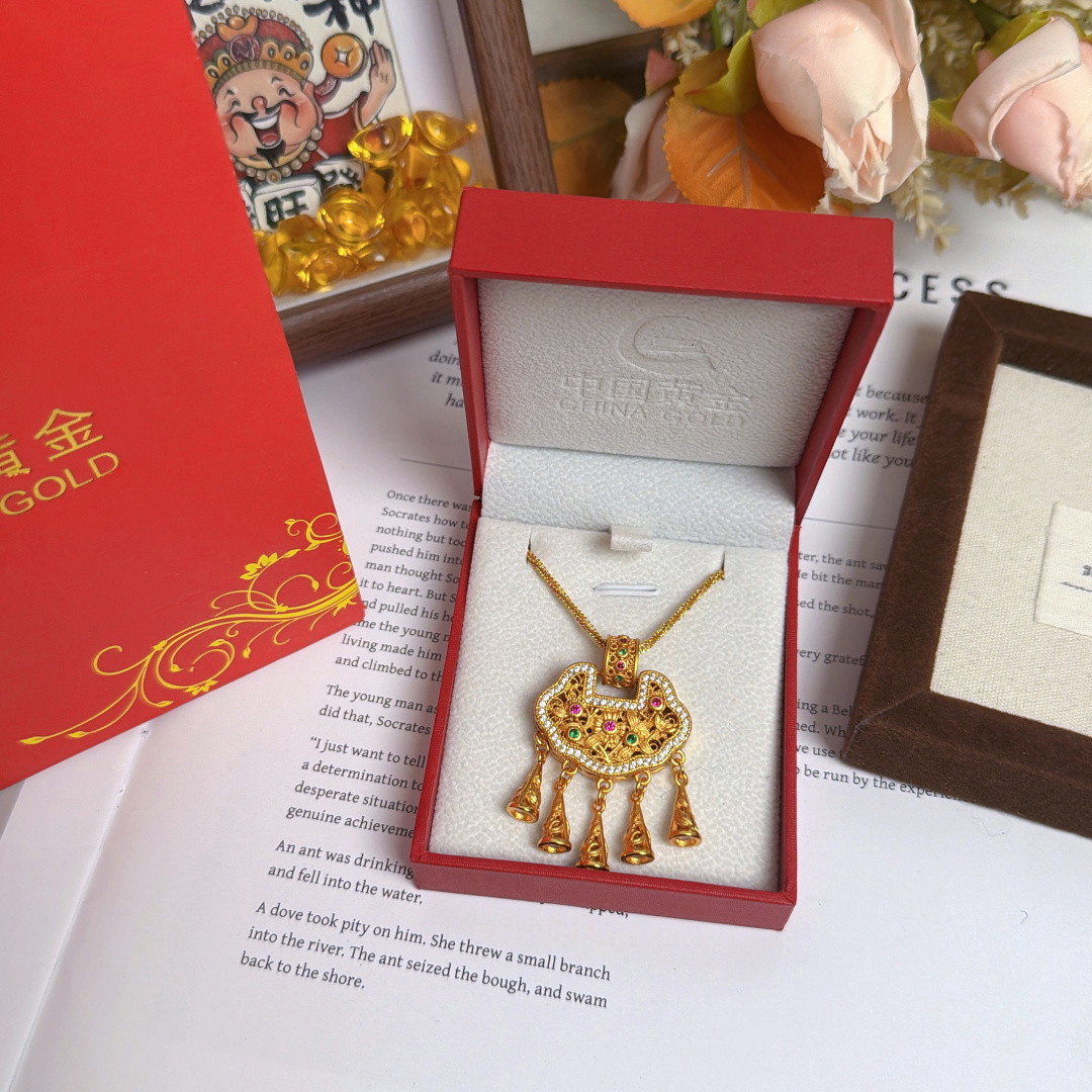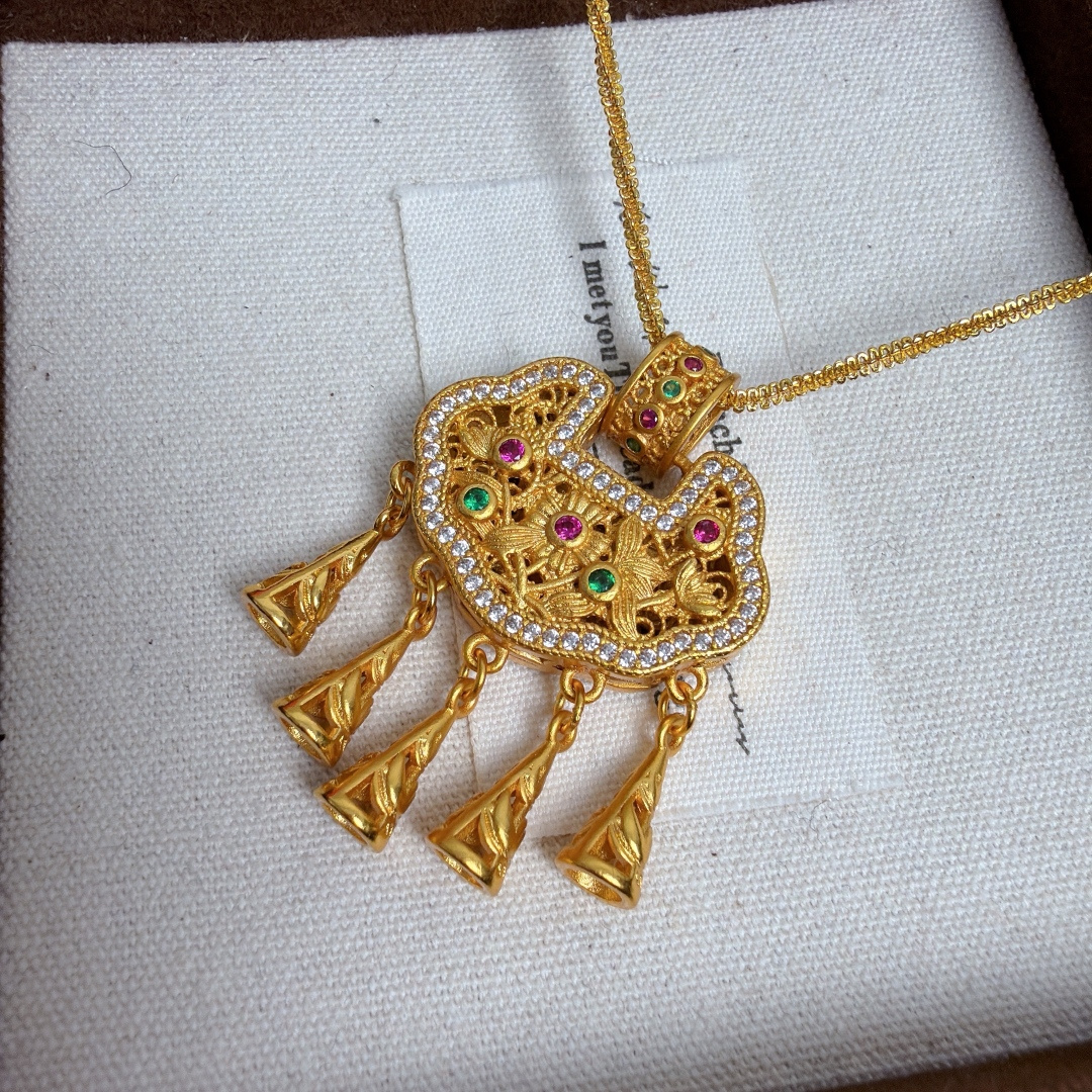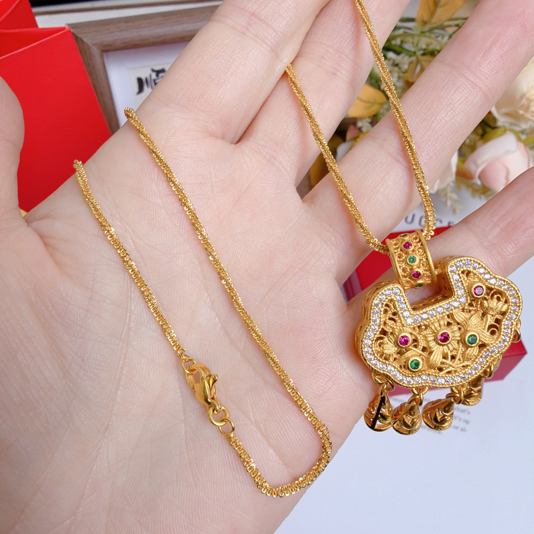 所见所得高品质礼盒全套 中国黄金同款花丝平安锁配万能项链 爆闪加长万能链 链长60cm 这款花丝平安锁项链也太绝了 镂空花丝工艺精致到骨子里 镶钻搭配彩宝点缀 贵气又灵动 流苏坠子晃起来超有氛围感 平安锁寓意岁岁平安 不管是自留戴还是送闺蜜 送女儿当成人礼 都是拿得出手的心意款 黄金保值又好看 闭眼冲不亏