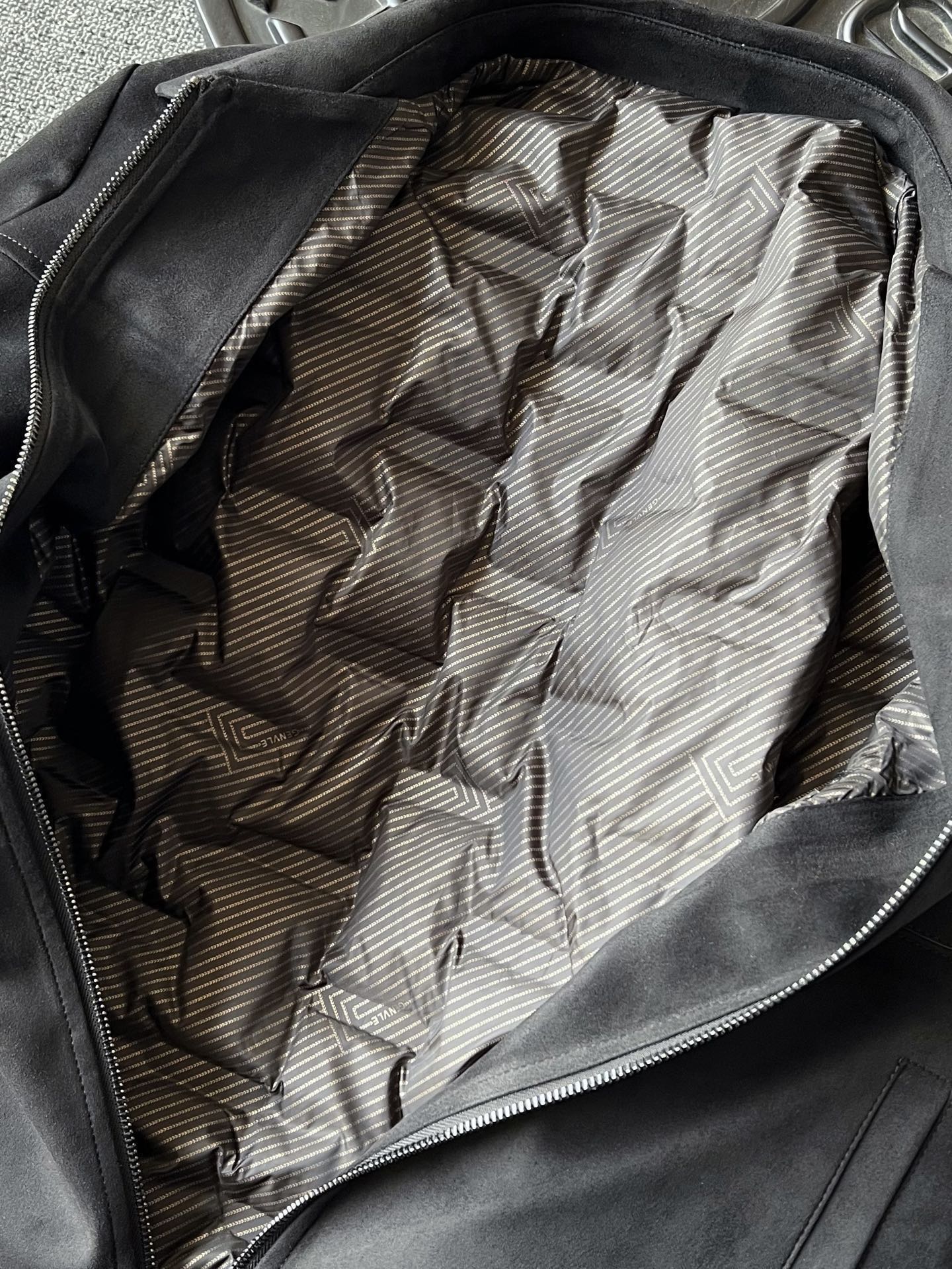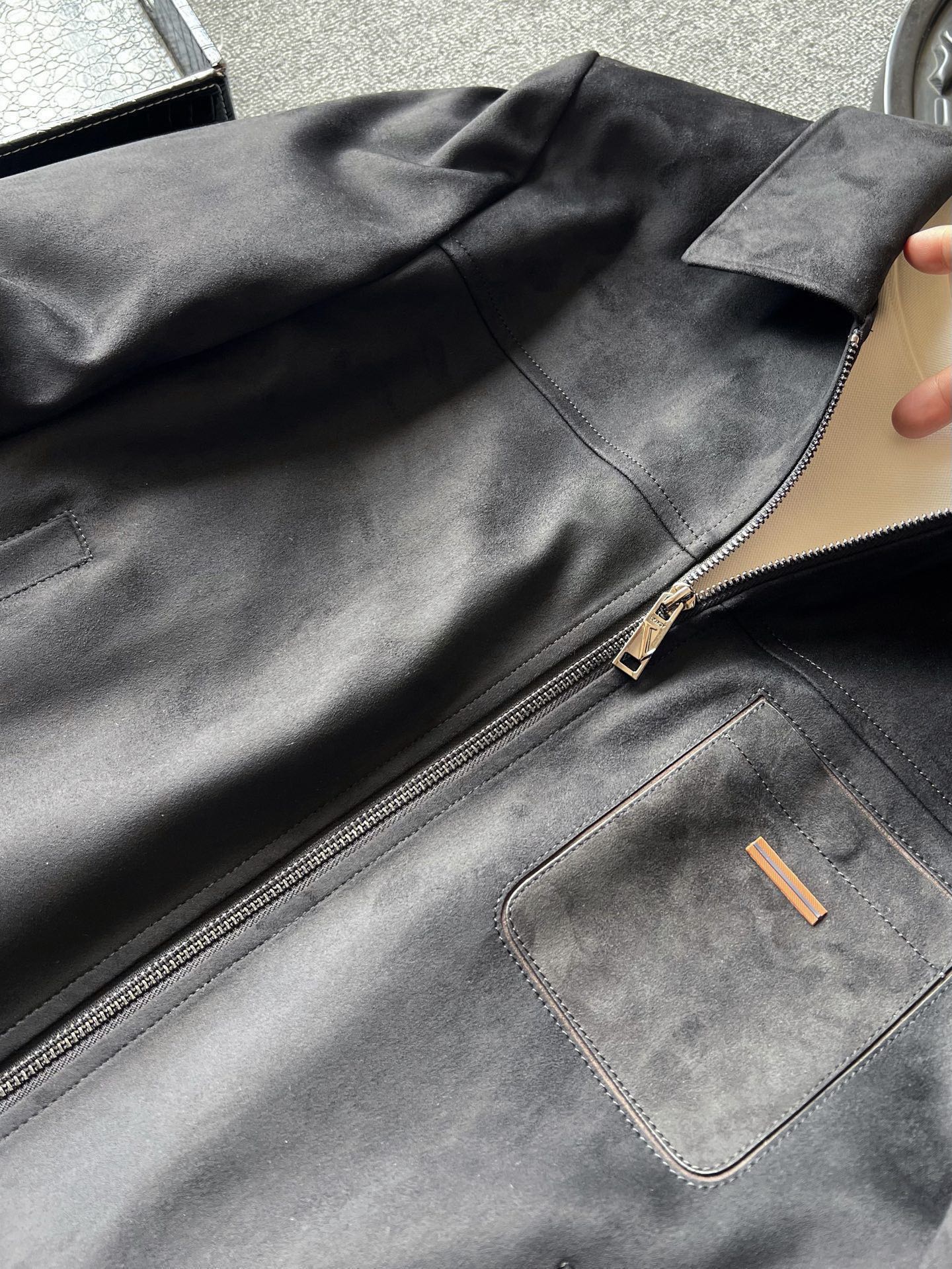 细节细节再细节 Zegna家商场新款麂皮羽绒服 胸前切割二次缝线口袋设计配套磁吸纽扣 口袋上带有标志性杰尼亚棕黑棕组合浮雕立体硅胶线条 摸起来带有层次感 十分精致 多处拼接工艺 上身质感有型