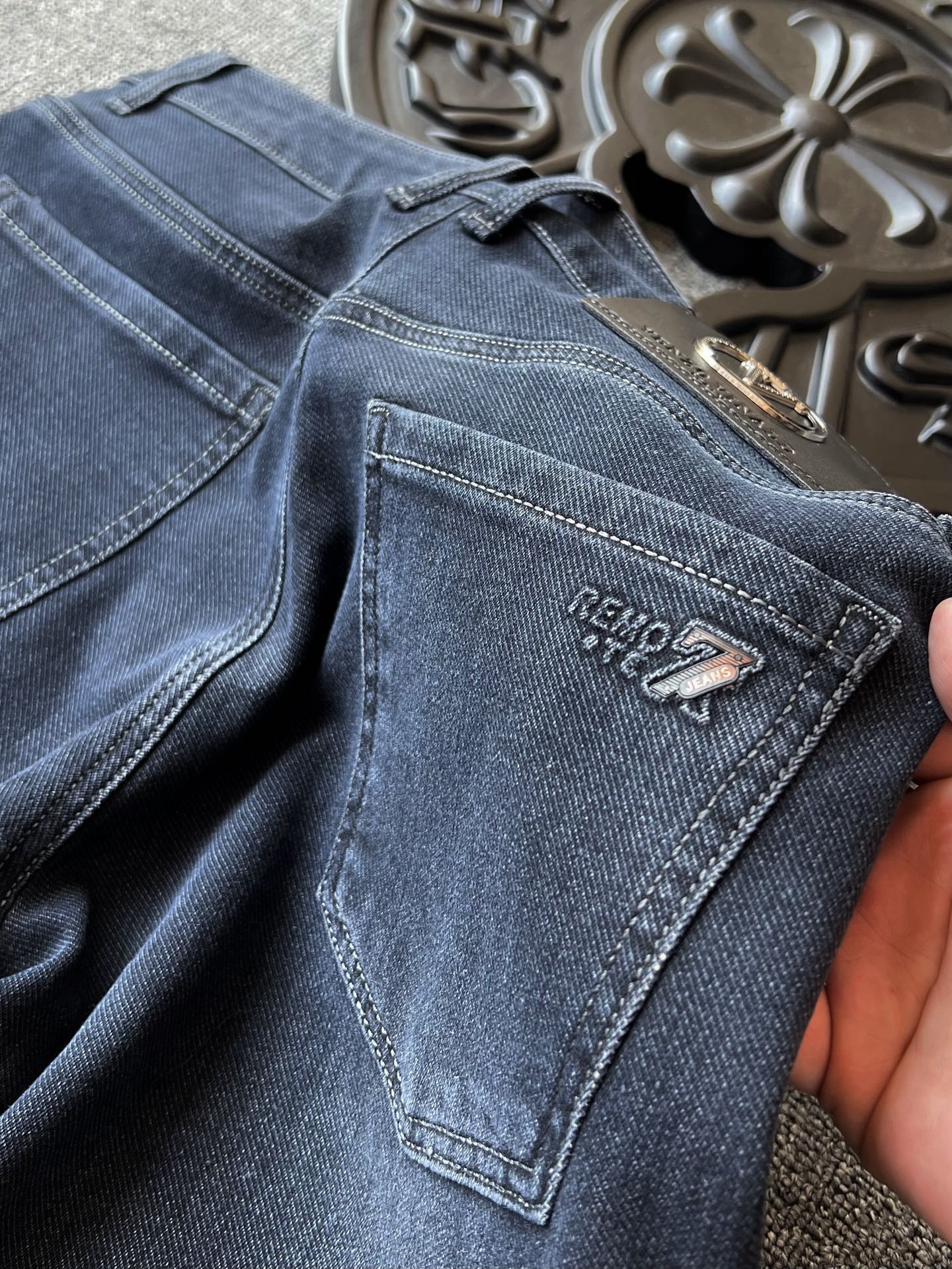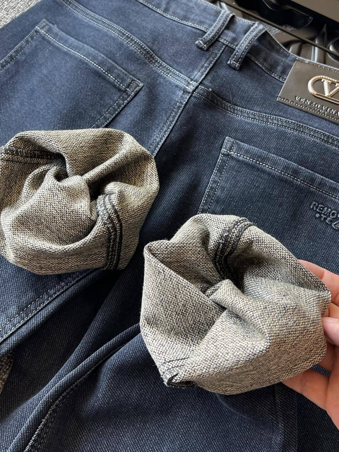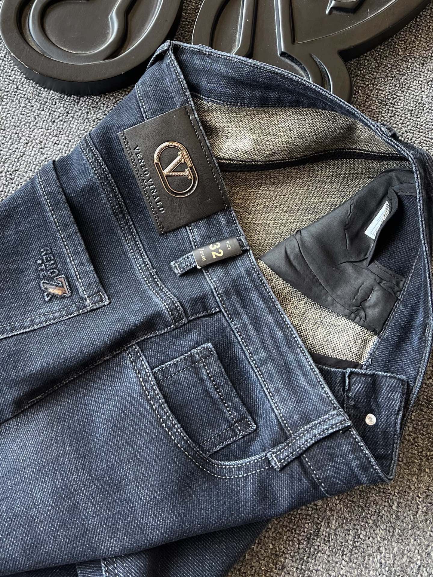 细节细节再细节 Zegna VLTN合作款水洗棉藏青蓝牛仔裤 裤前多层次立体打磨工艺 整体效果特别好看 裤后腰口华伦天奴金属皮标 十分精致 口袋做了高频杰尼亚Z标 内里加固做工 持久耐穿