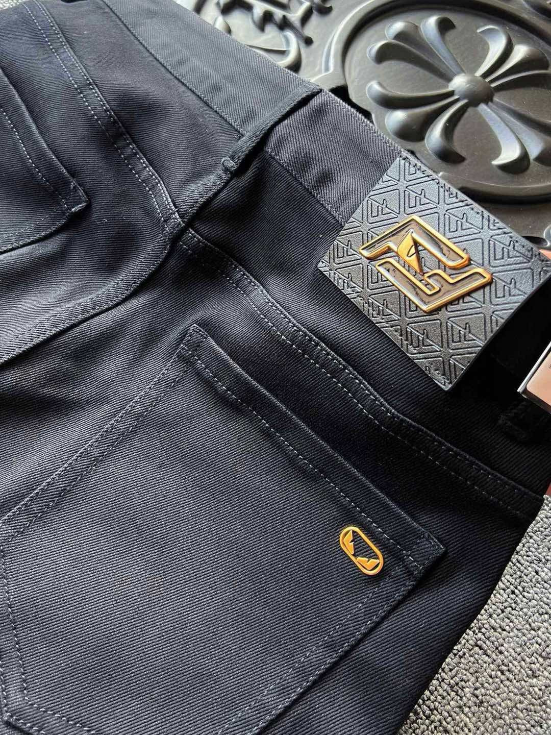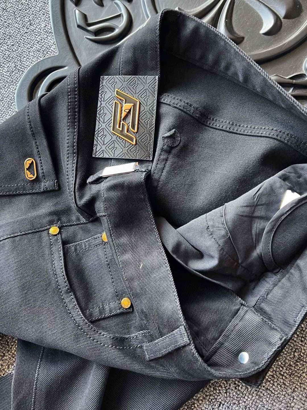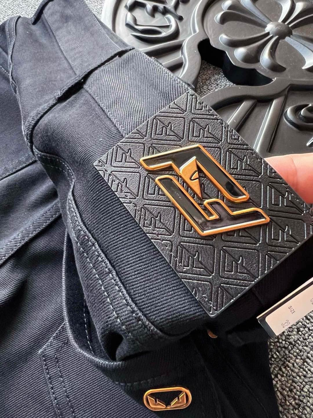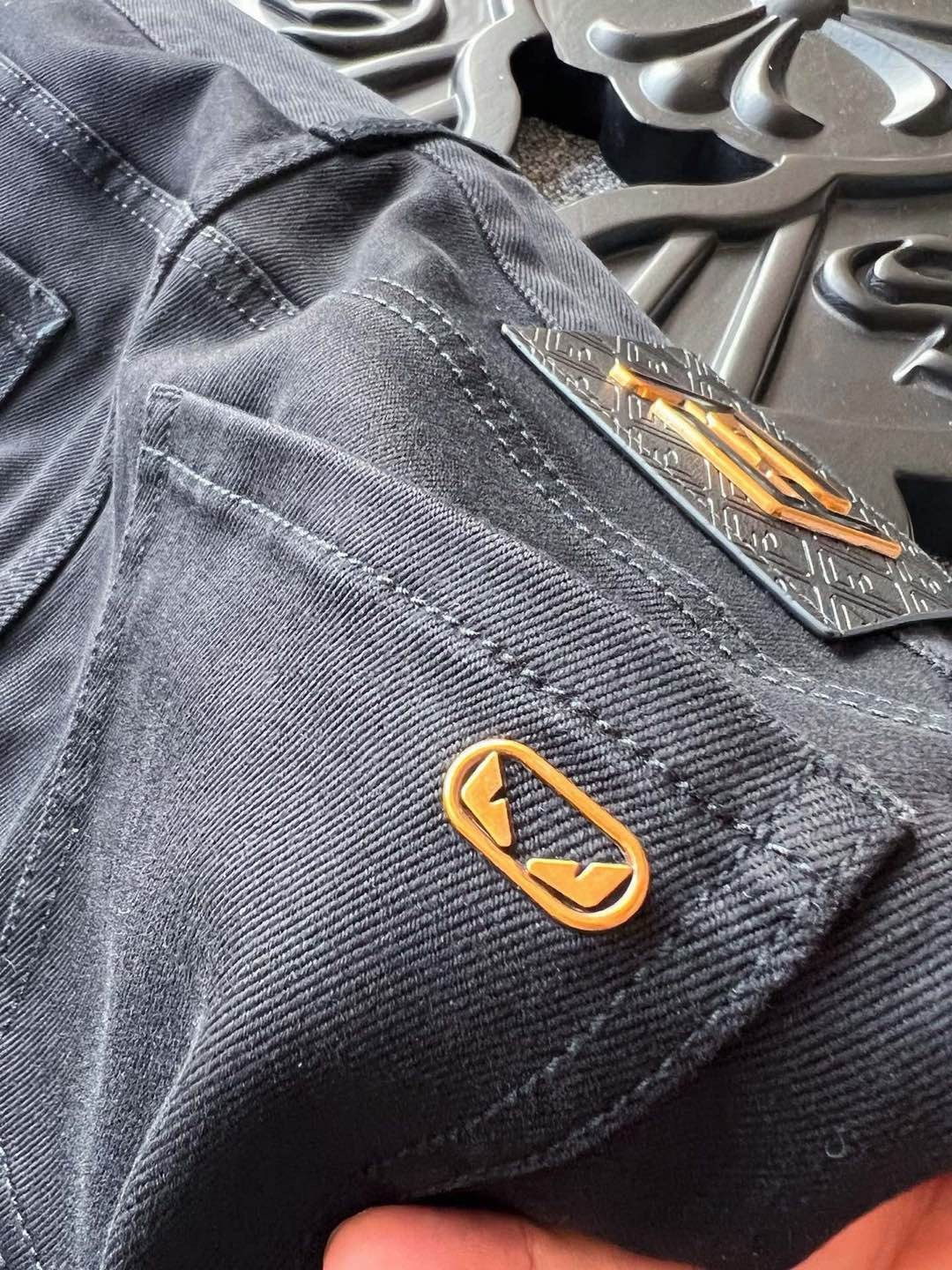 细节细节再细节 Fendi家小怪兽新品牛仔裤 黑金搭配色调 彰显奢华气质 裤前所有口袋接缝处全部做了金属纽扣加固 腰口激光浮雕金属小怪兽皮标 口袋处镶嵌金属小怪兽金标 内里精湛做工 彰显芬迪专柜奢华