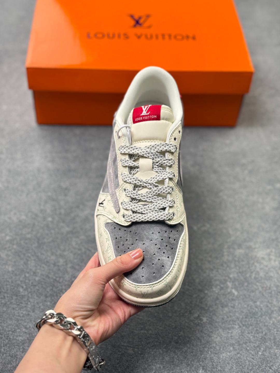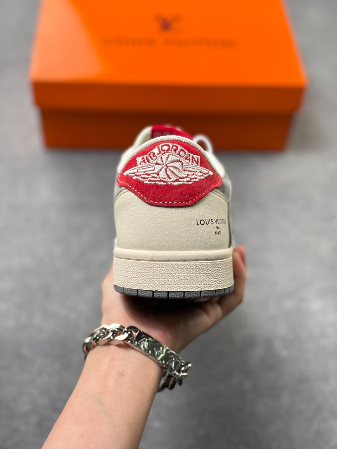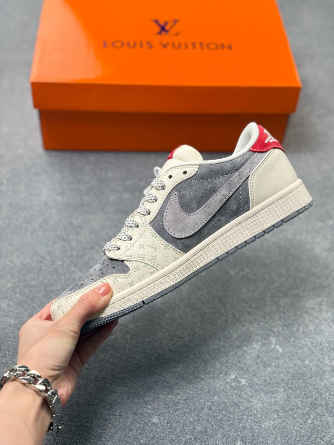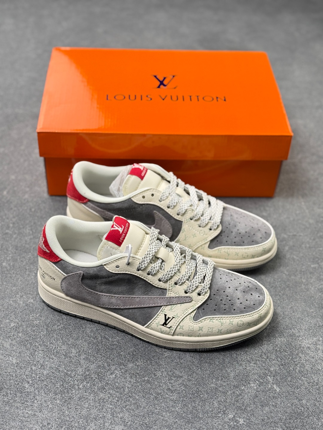 乔1 Air Jordan AJ1 Low X Louis Vuitton 低帮联名LV 灰白红尾 定制配色 原厂内置气垫魔块 A模大底 头层小牛皮 鞋舌AJ原厂专用牛津布 AJ专用反口珍珠布 原厂无杂质高弹内里海棉 特殊封边弹力鞋带