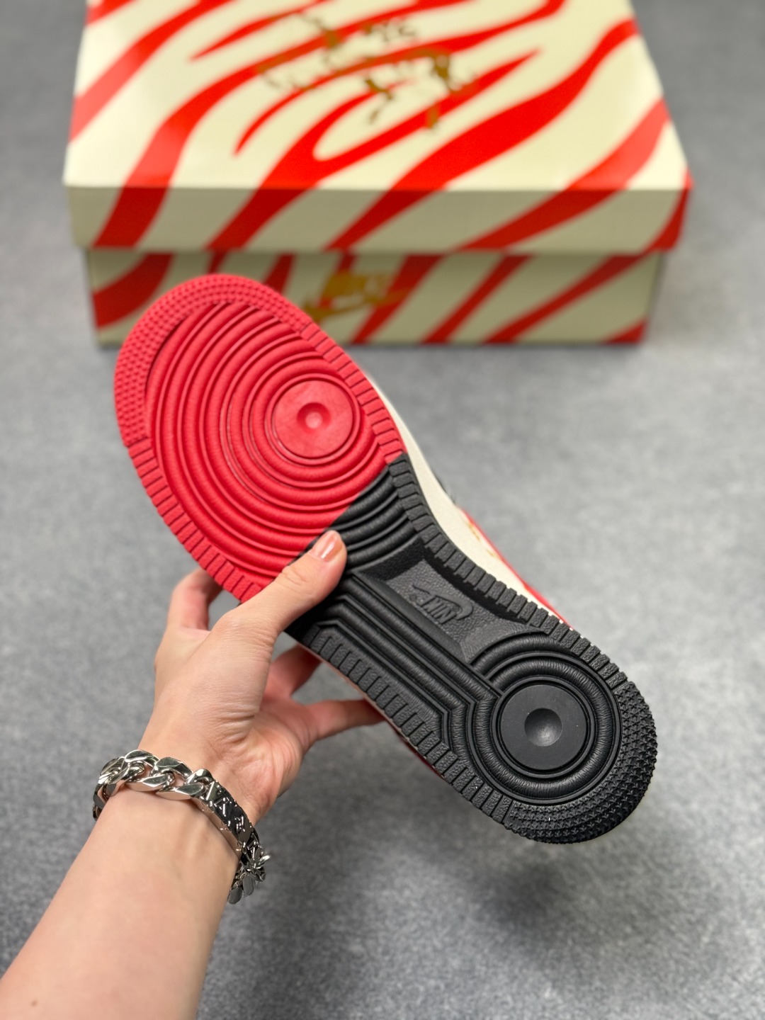 Swoosh标志采用红色皮质并融入中式纹理 中底做了红黑撞色处理 将Air Force 1的经典鞋型与马年国风元素深度融合 年味与街头潮流感兼具