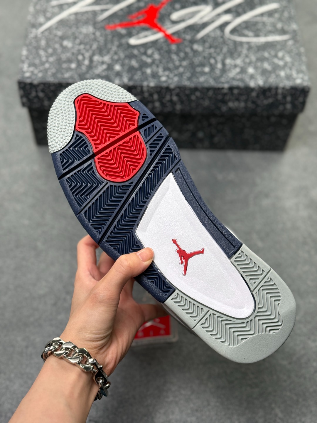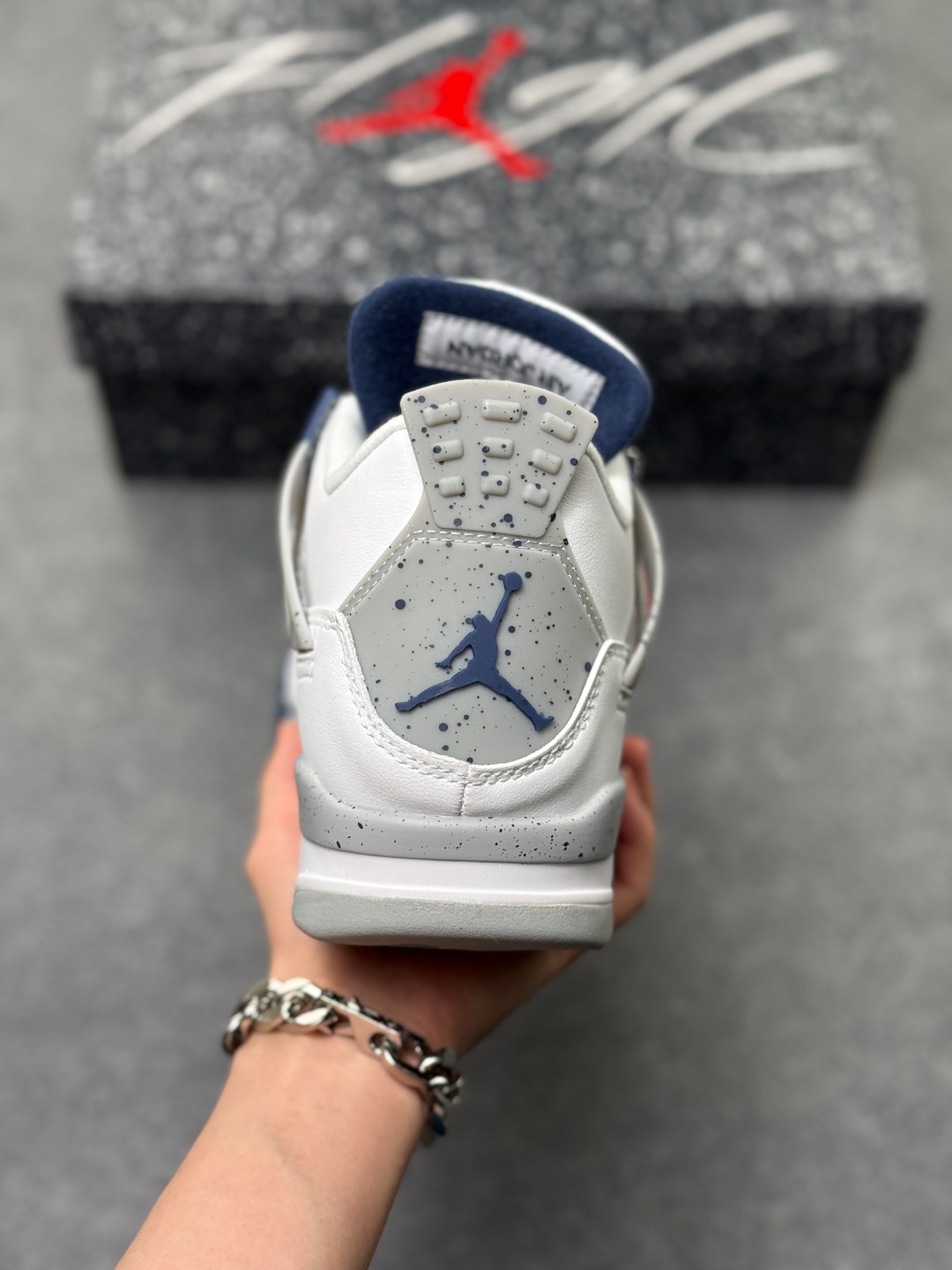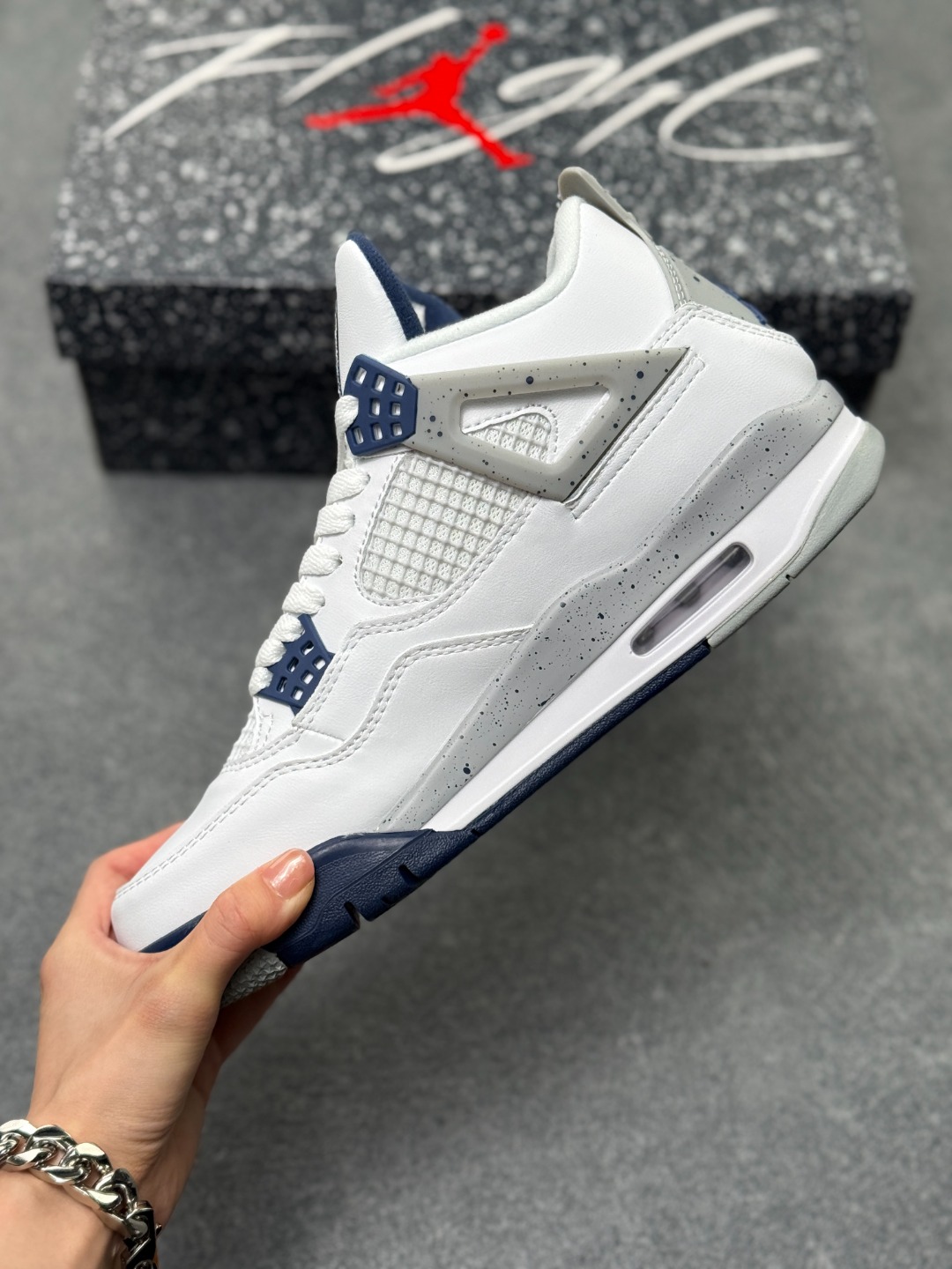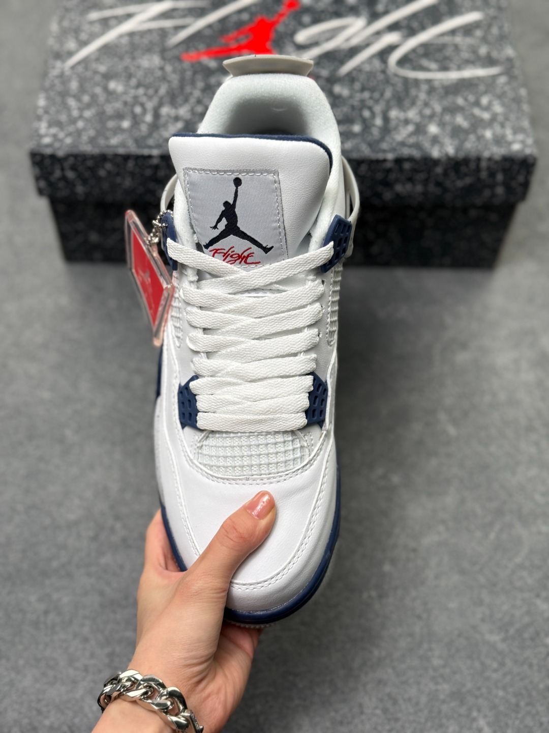 Air Jordan AJ4 Retro 午夜蓝 全套原纸板楦头开发 原厂特供皮料加持 确保原汁原味 完美呈现四代版型 一比一鞋头弧度高度鞋身弧度 数据细节工艺流程均保持原鞋一致 原厂TPU网格鞋带扣 正确内里网布 菱角分明不变形无多余毛边 柔软性质感一致于原鞋 市场唯一原厂鞋扣模具 背面可见隐藏注塑口 原厂织唛标 原厂飞人电绣工艺 尾指中部跳三针 独家绑鞋带手法 印刷中底布 四线拉帮 米色美纹纸贴合固定 进口港宝加持 后跟自然饱满 全鞋荧光划线卡点 追求极致完美 每一双都是工艺品 多重QC质检 超越公司货的品控标准 实实在在的免检产品
