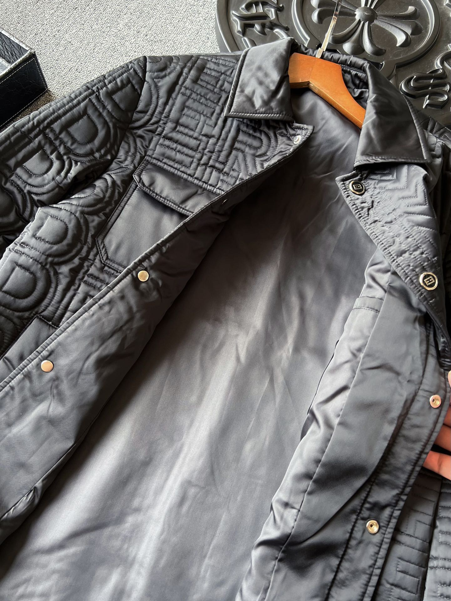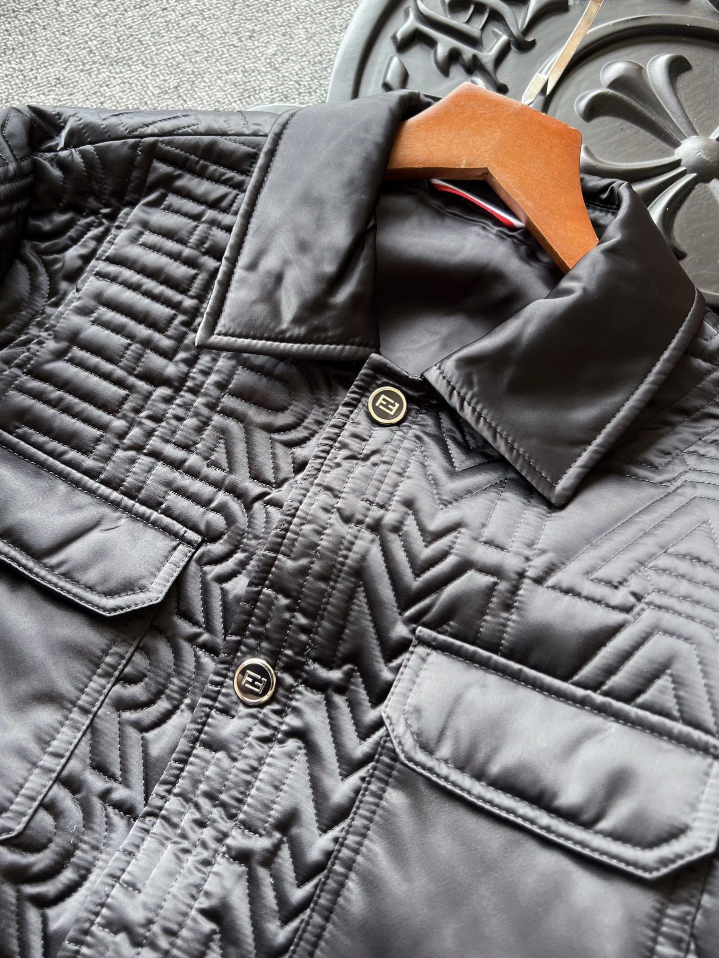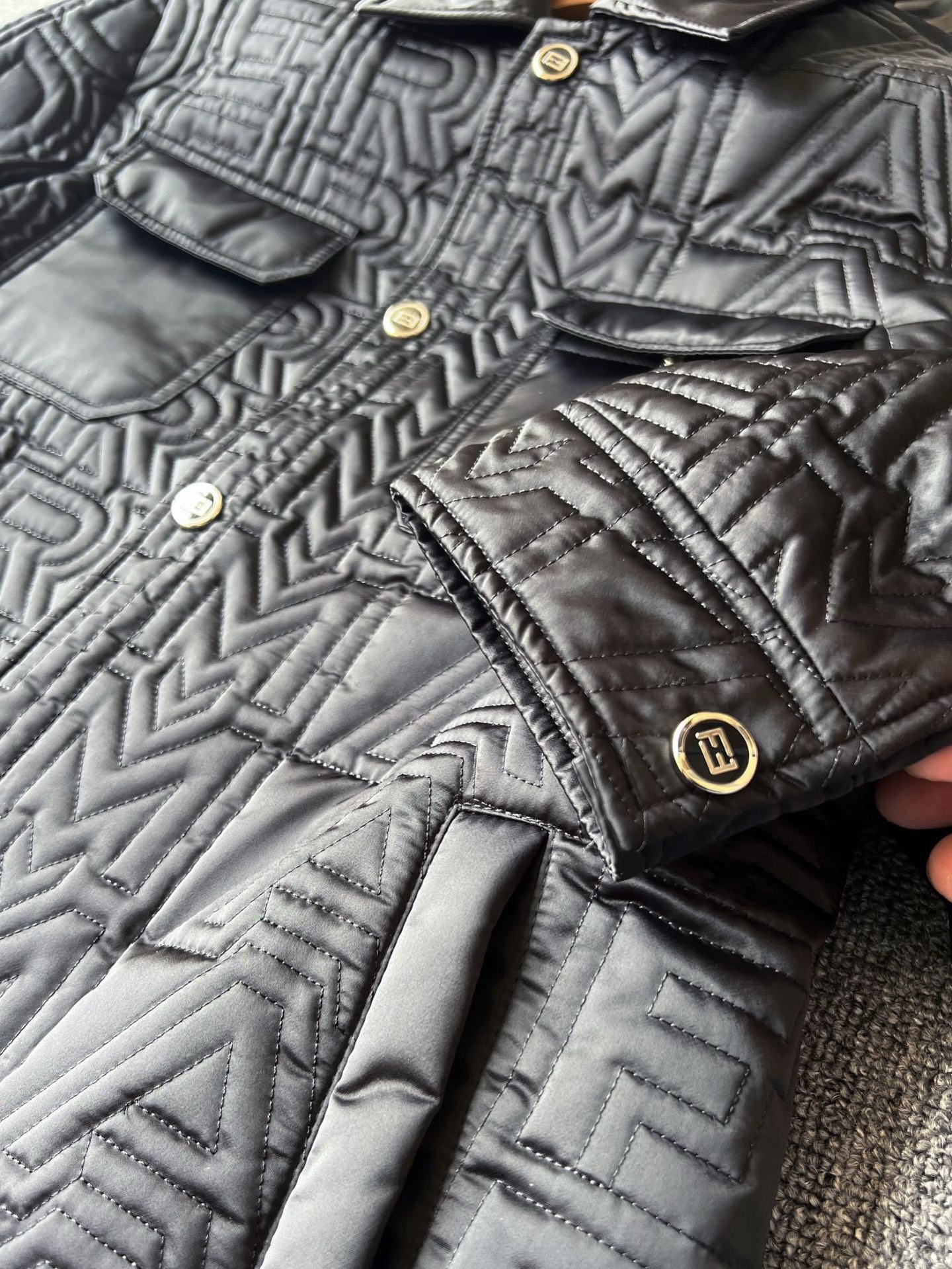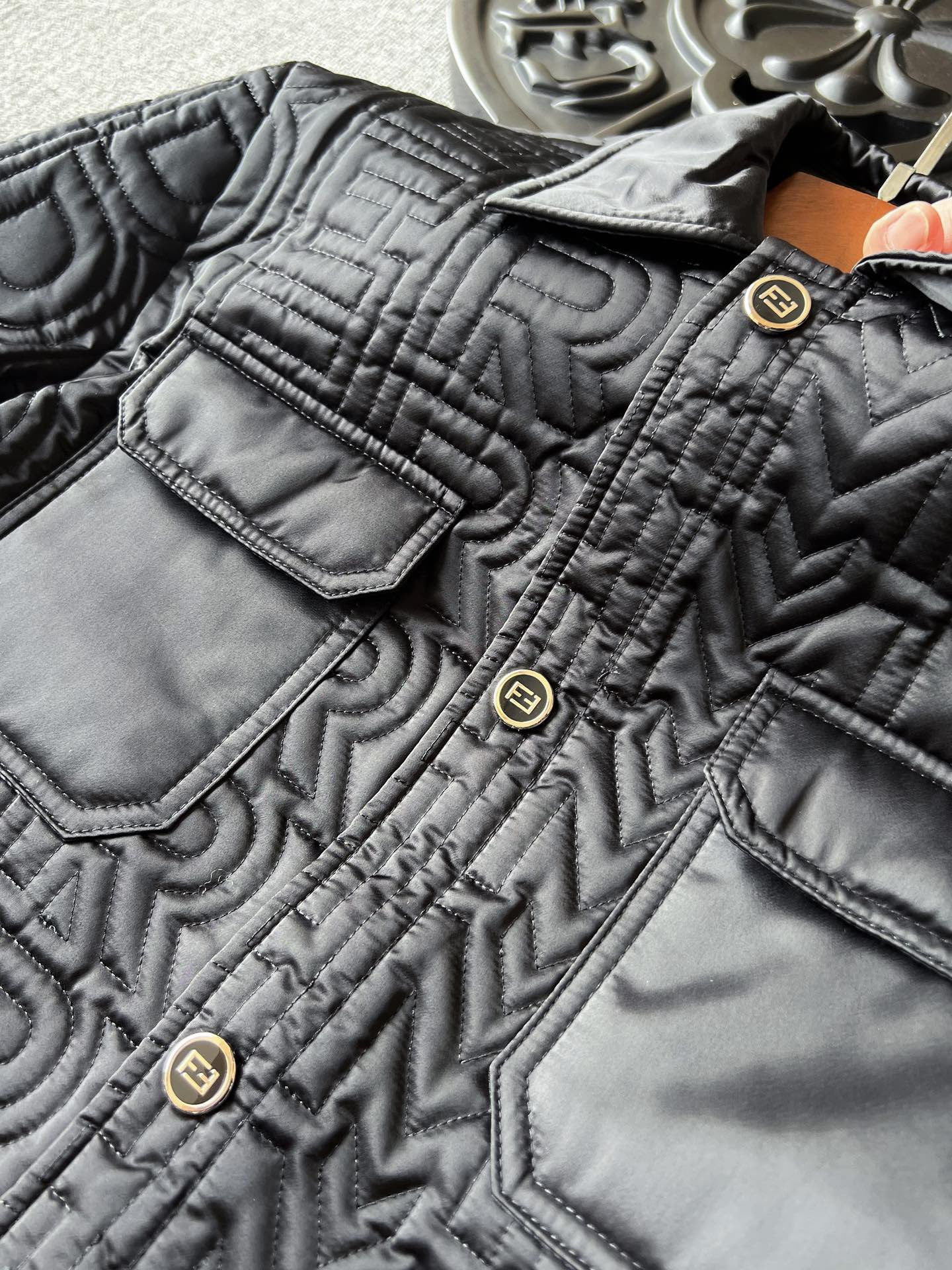 细节细节再细节 Fendi专柜高奢压缩记忆棉服 胸前工装口袋设计 定制高光双F雕刻金属纽扣 十分精致 每一处细节设计彰显专柜高奢质感 极为稀缺的好货