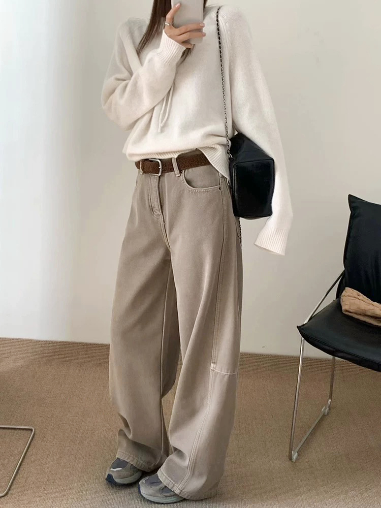 奶茶色弯刀牛仔裤 解锁秋冬松弛感穿搭 低饱和度的暖调不挑肤色 搭配焦糖色针织衫 就很有秋冬的氛围感