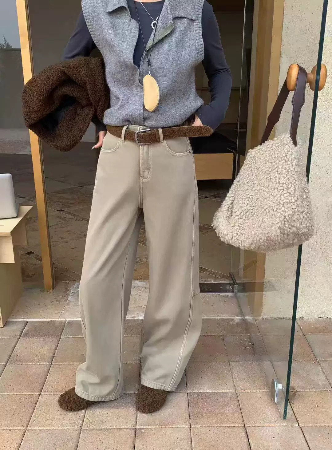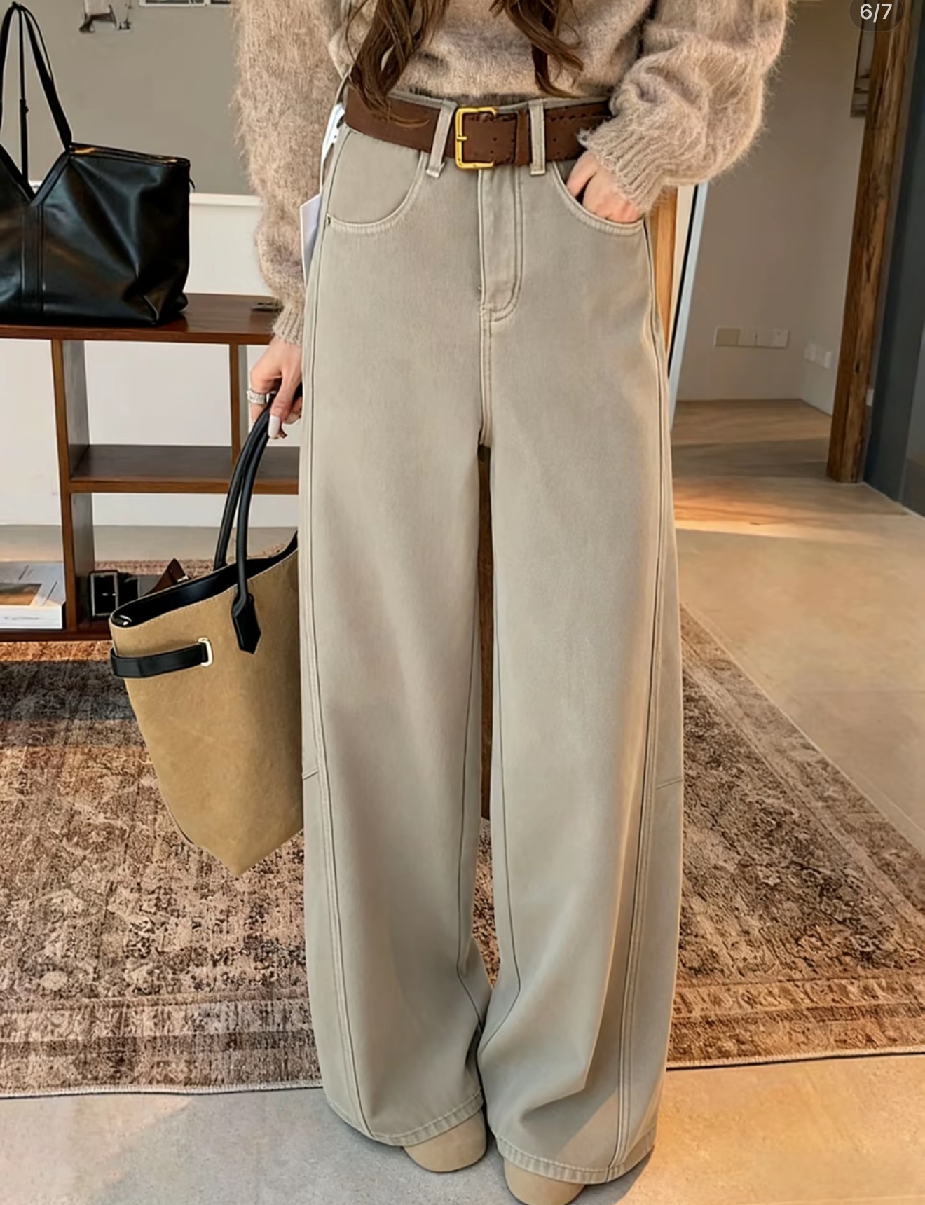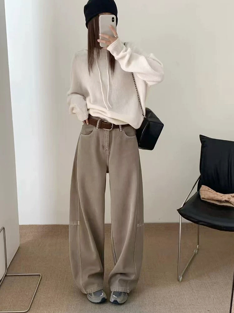 奶茶色热厚绒 冬季新款加绒加厚复古弯刀阔腿牛仔裤 配腰带
