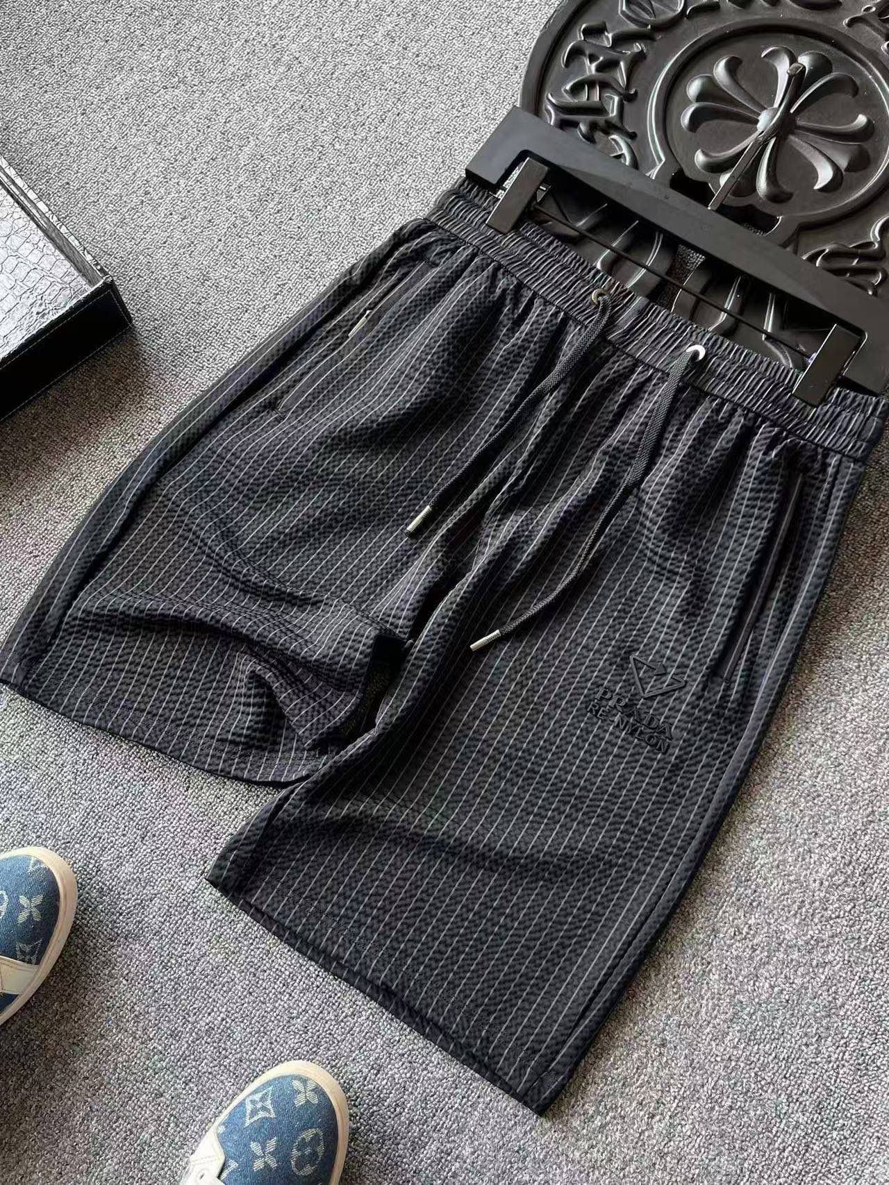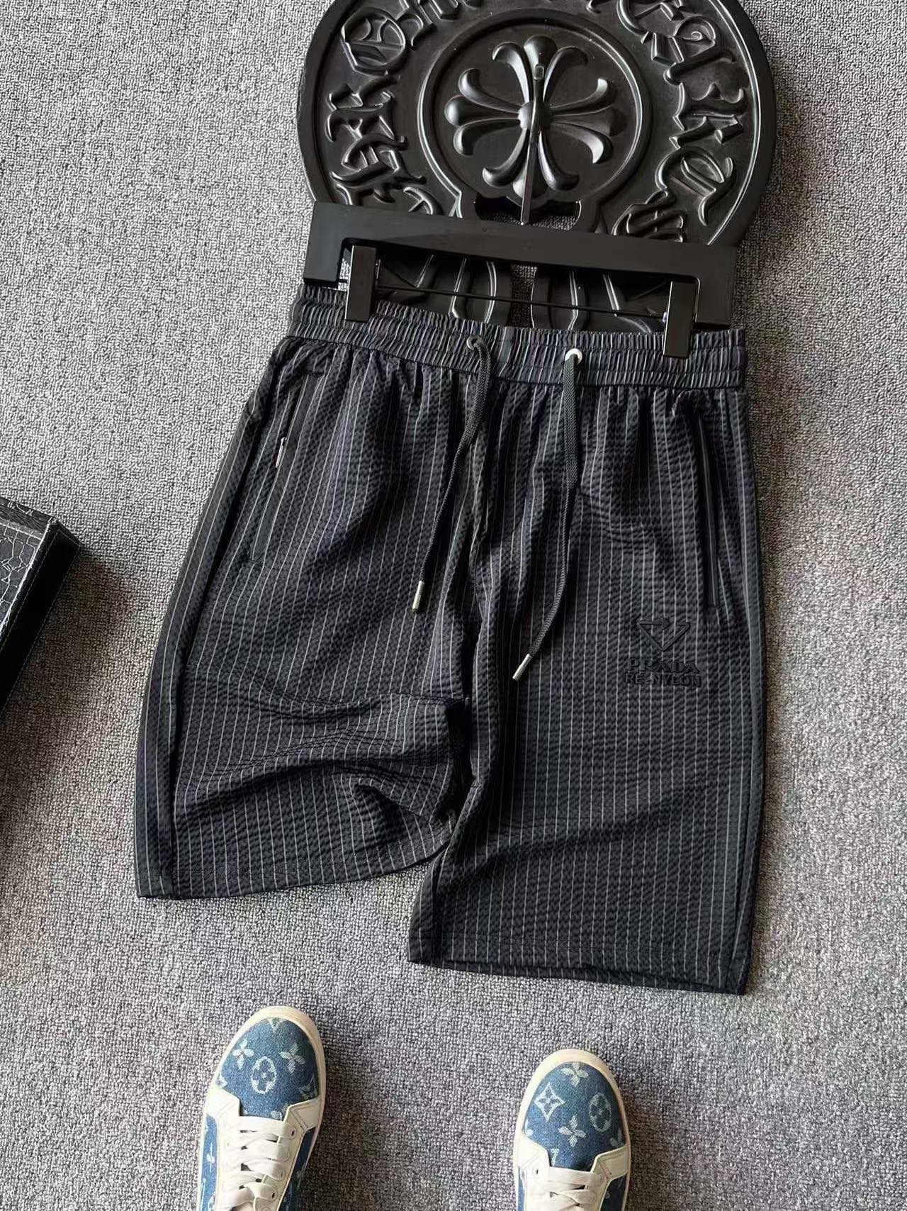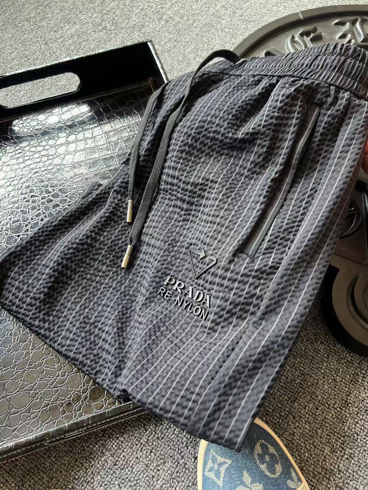 细节细节再细节 Prada家商场新品条纹五分裤 设计师主打高端旗舰系列而量产 高级灰竖条纹配合鱼骨纹3D肌理高级感拉满 裤前3D立体三角标Prada液态硅胶小标 十分简约精致 金属抽绳孔以及双侧带暗拉链设计 裤后内嵌式口袋增强立体感的同时大大增强实用性以及随身携带手机安全性 内里天花板级包边包条精湛做工
