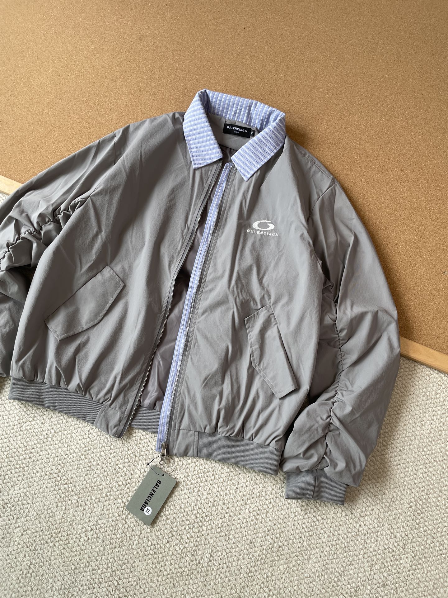 巴黎世家25秋季重磅新品外套 落肩宽松廓形 松紧袖口下摆利落有型 精选弹力梭织尼龙面料 质感高级且具延展性 领口门襟撞色条纹面料拼接 层次错落有致 袖子两侧匠心打造抽褶工艺 配合整体弯刀绣设计 上身立体挺括 少年感与松弛感双线拉满 胸口点缀品牌标志性字母刺绣 金属双拉链门襟尽显质感 全衣做工走线精密考究 是高品质情侣款潮流尖货