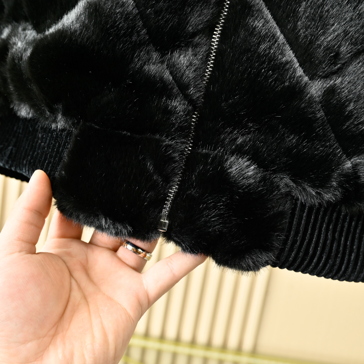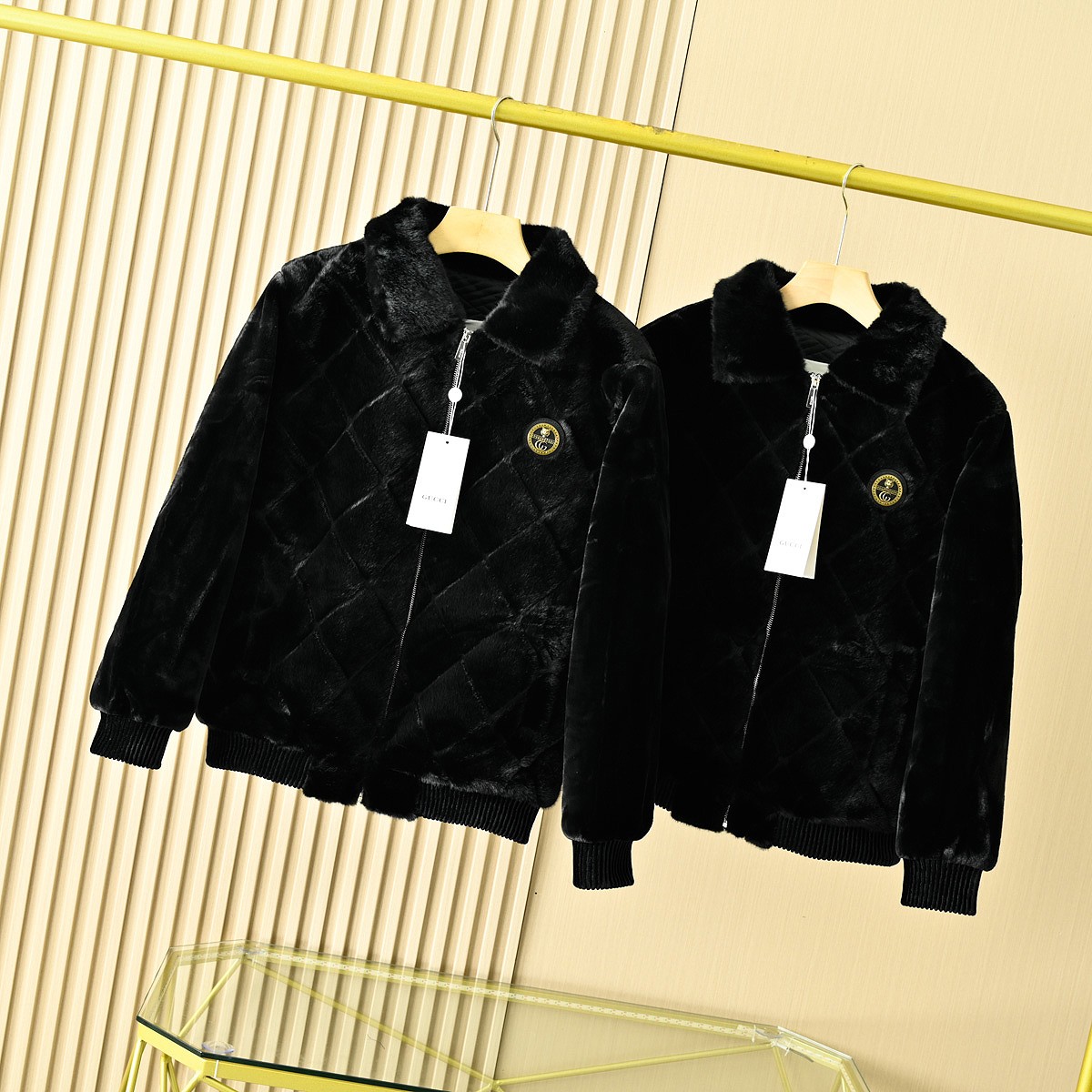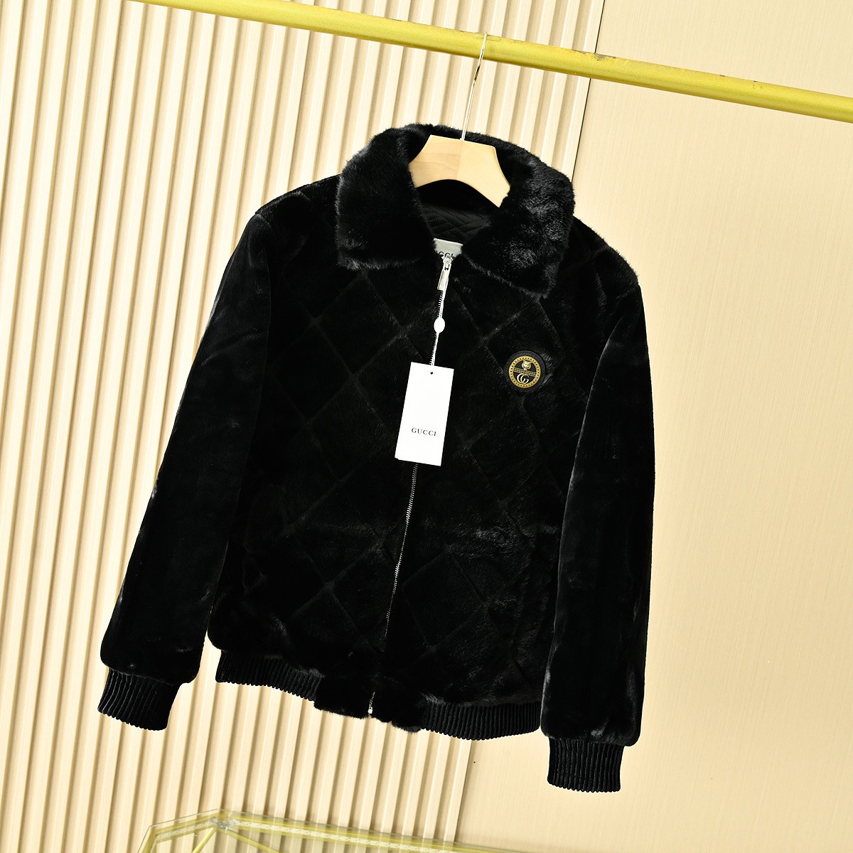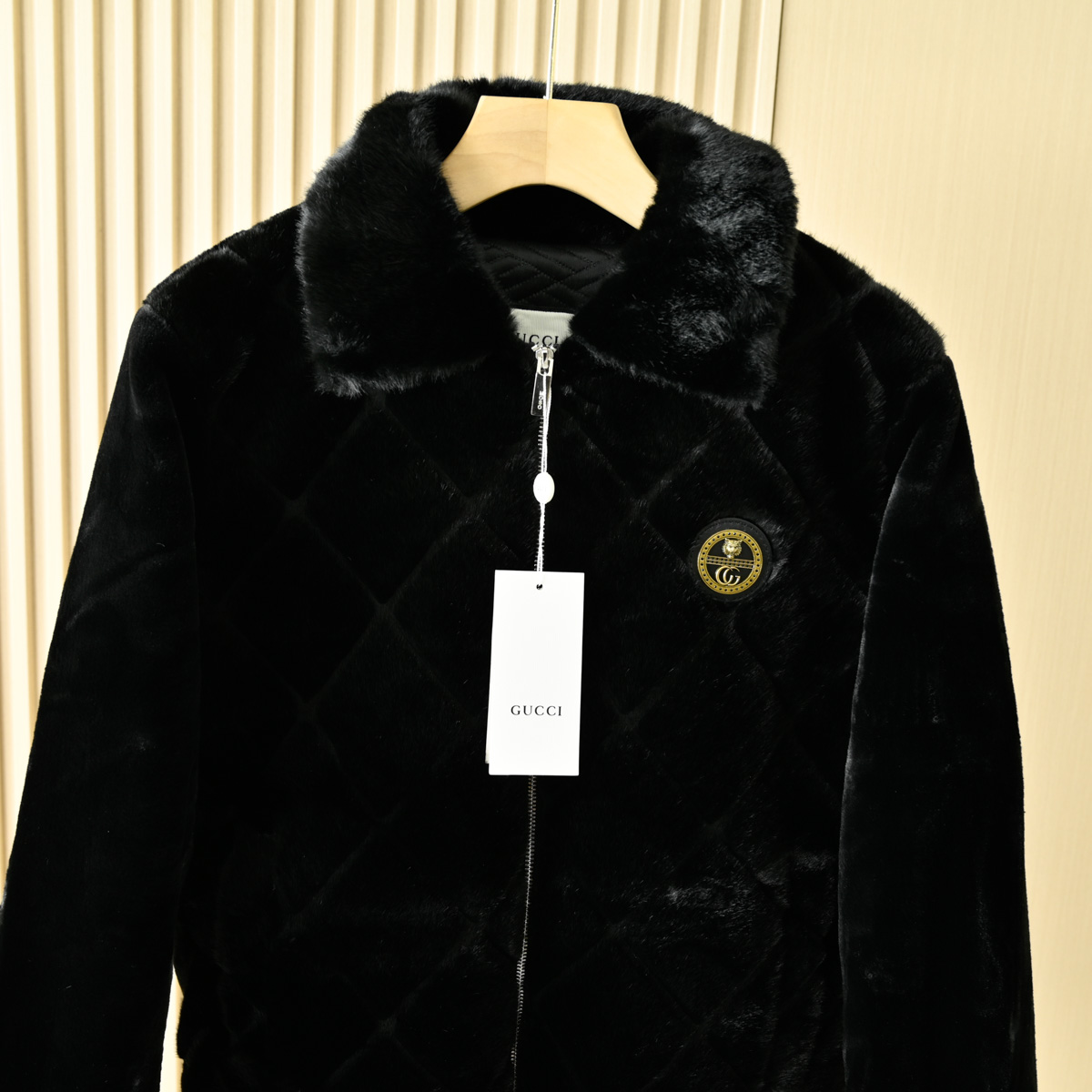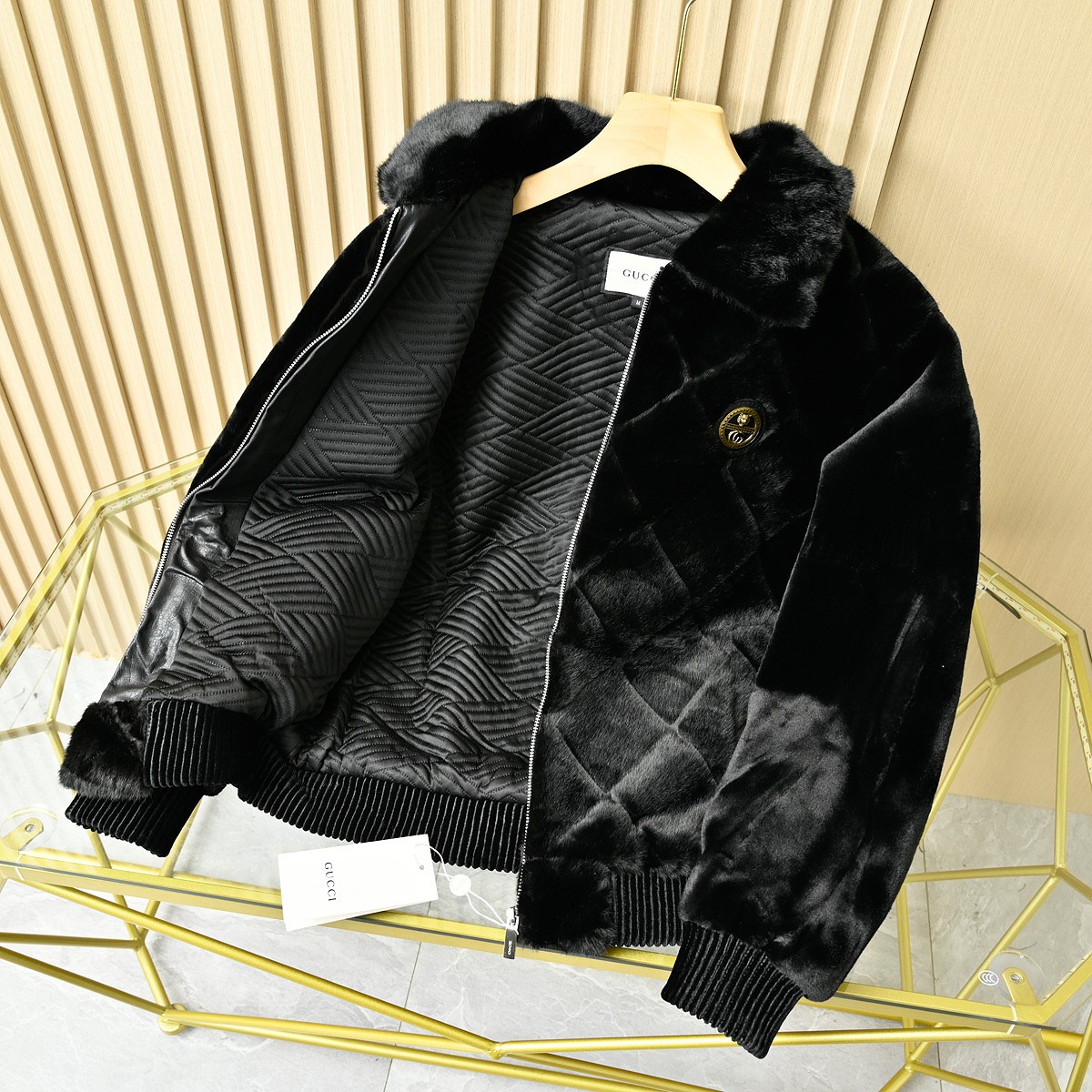 GUCCI古驰2025冬季男士加厚休闲夹克字母金貂绒连帽貂毛人造皮草毛外套