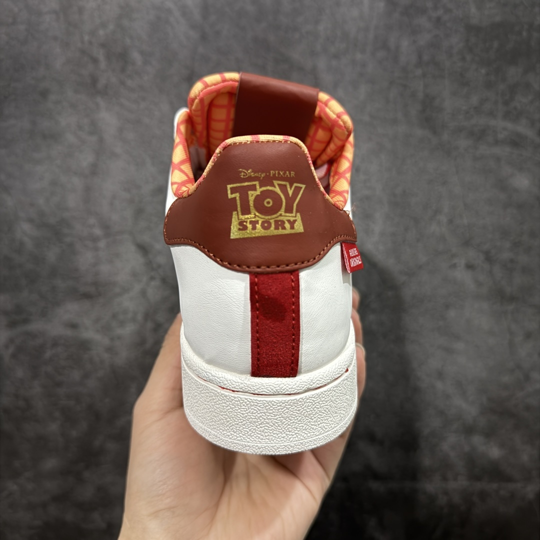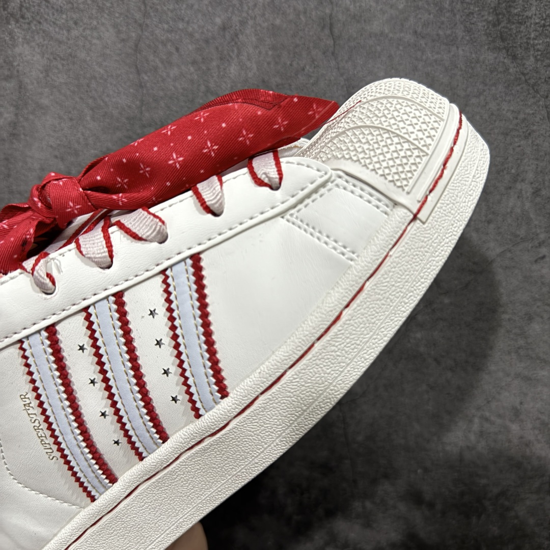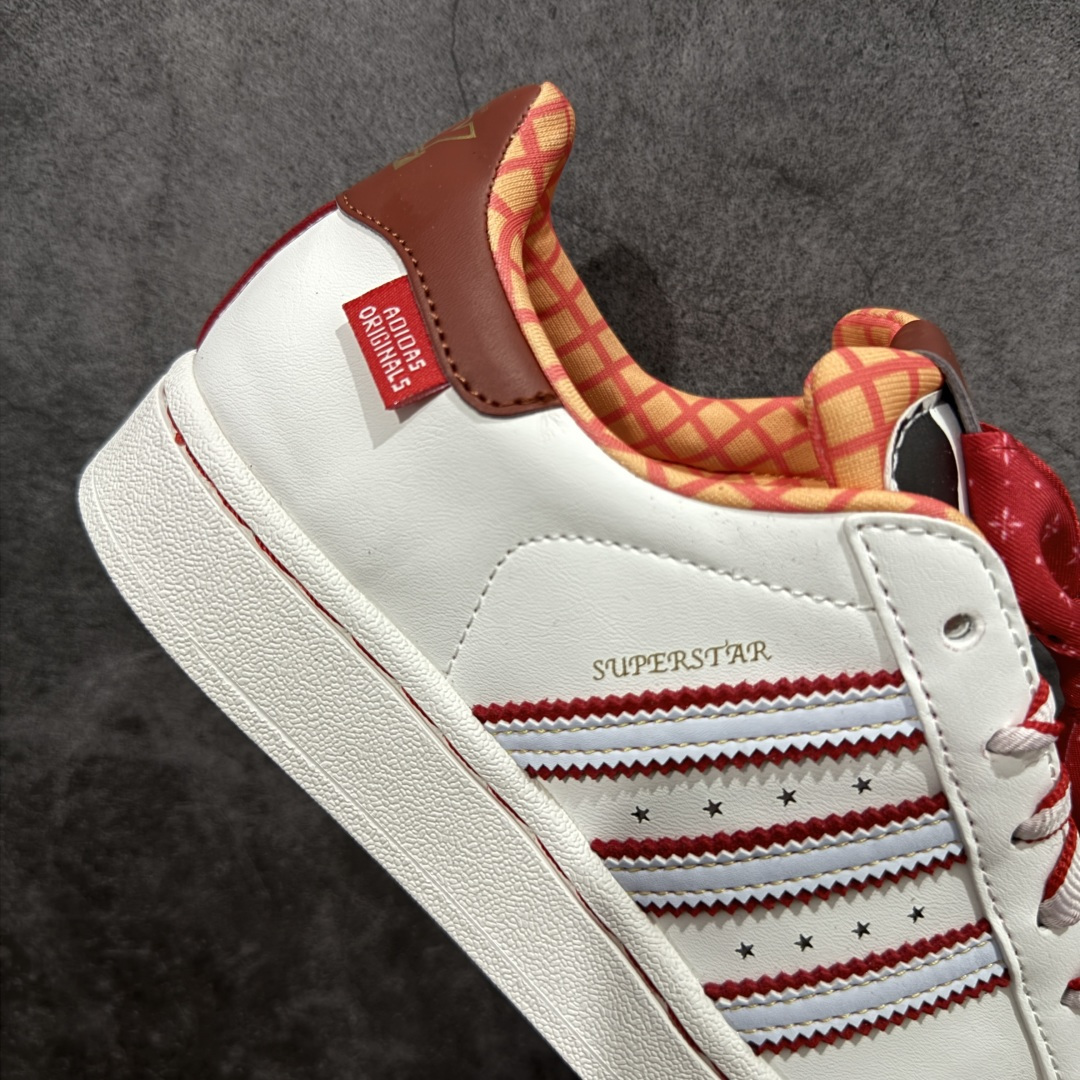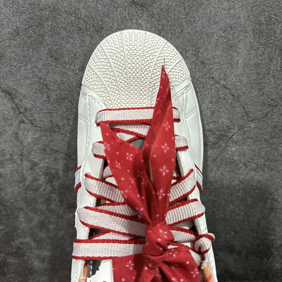 整体时尚亮眼 鞋身整体以白色皮革打造 搭配经典白色贝壳头 鞋身两侧经典锯齿三条杠Logo采用红色底片 三条扛中间用五星图案点缀 侧身金色Superstar字样 鞋舌红色领带状的布料 非常吸晴 同时鞋舌上的采用卡通图案 后跟迪斯尼联名的金色字样 外加白红相间的鞋带图案 最后以白色中底搭配白色橡胶外底完善整体设计收尾
