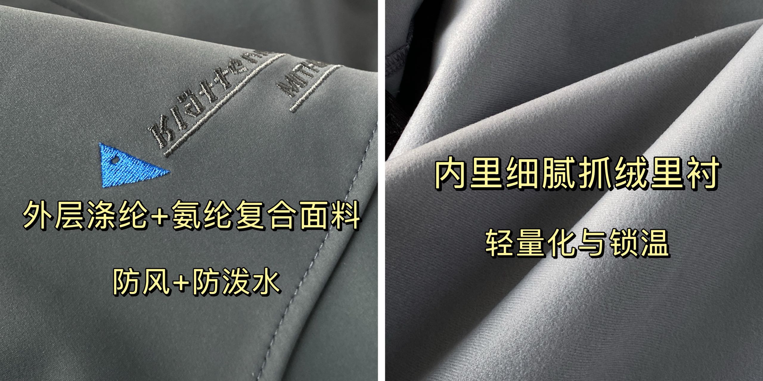 面料 外层90 涤纶 10 氨纶高弹复合面料 内里细腻抓绒里衬 兼顾轻量化与锁温力
