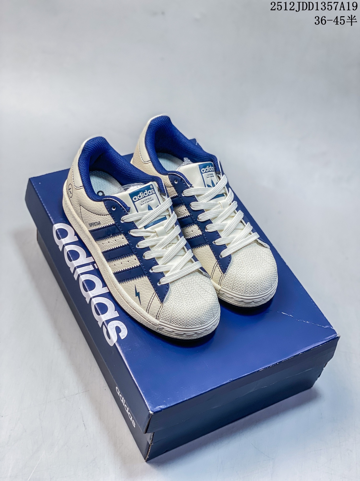 高端定制adidas Superstar fragment 闪电 白蓝 经典贝壳头造型 搭配米白与藏蓝的清爽配色 高端定制 低帮休闲板鞋 定制鞋盒 大厂纯原品质出货 超高清洁度 皮料切割干净无任何毛边 细节完美